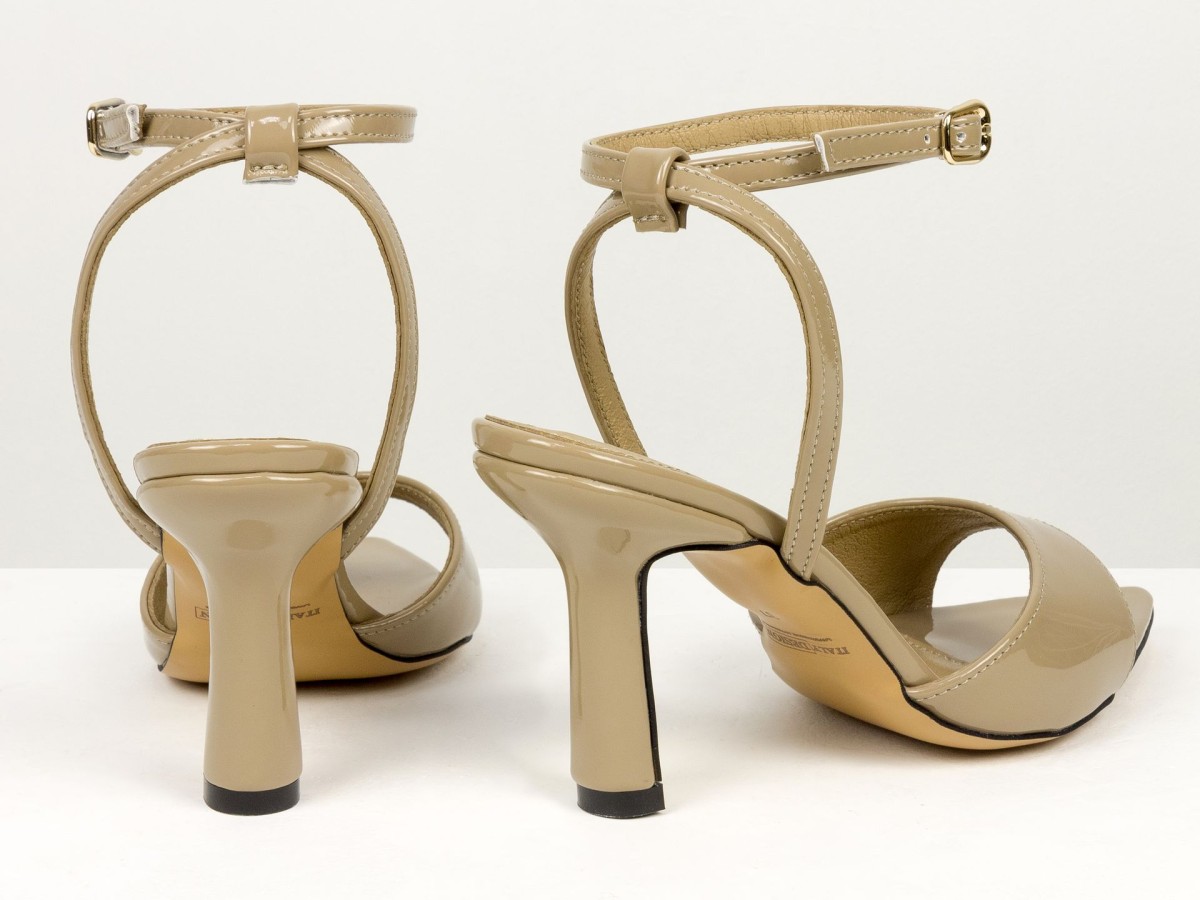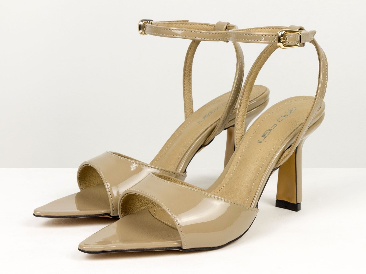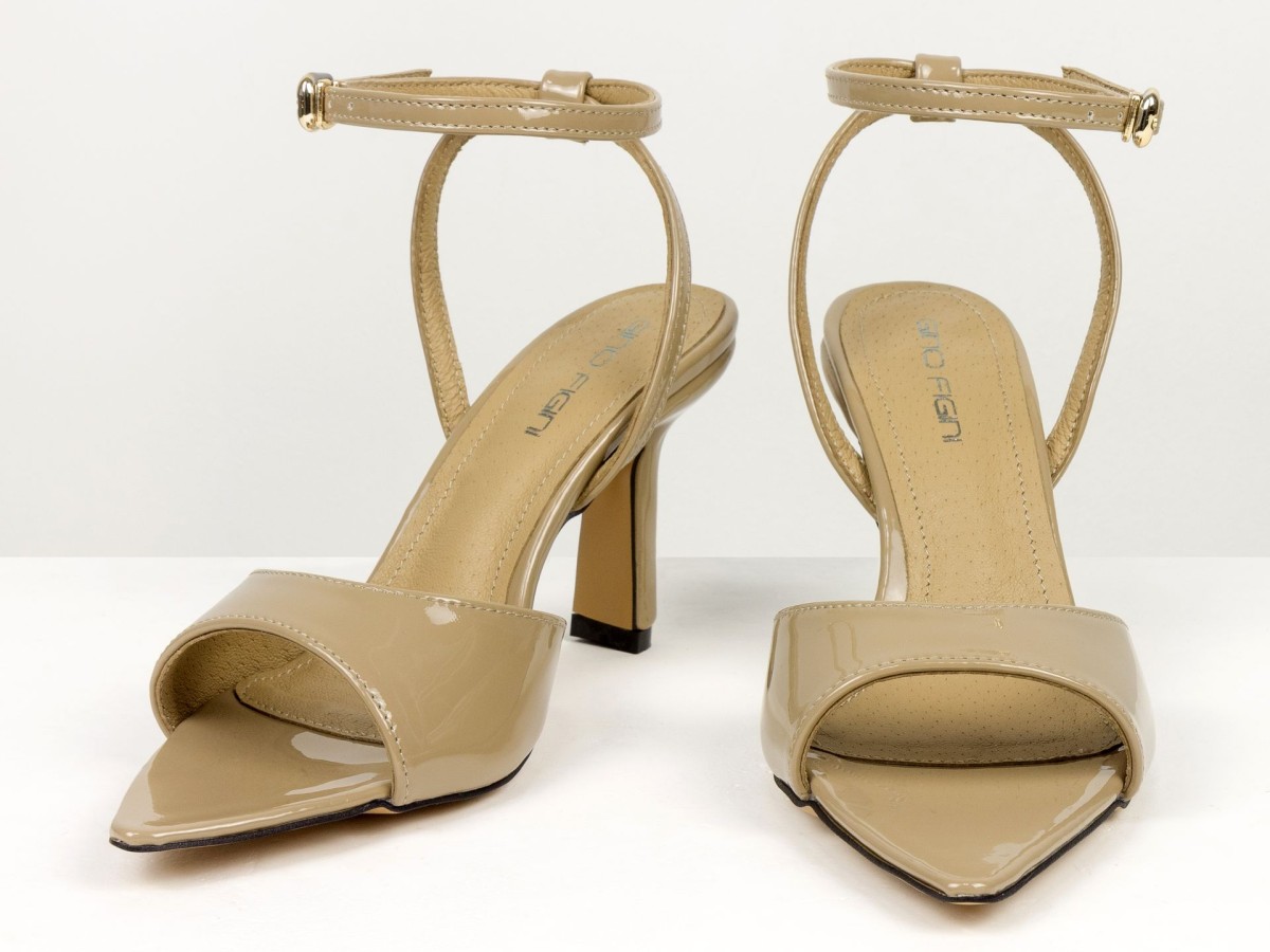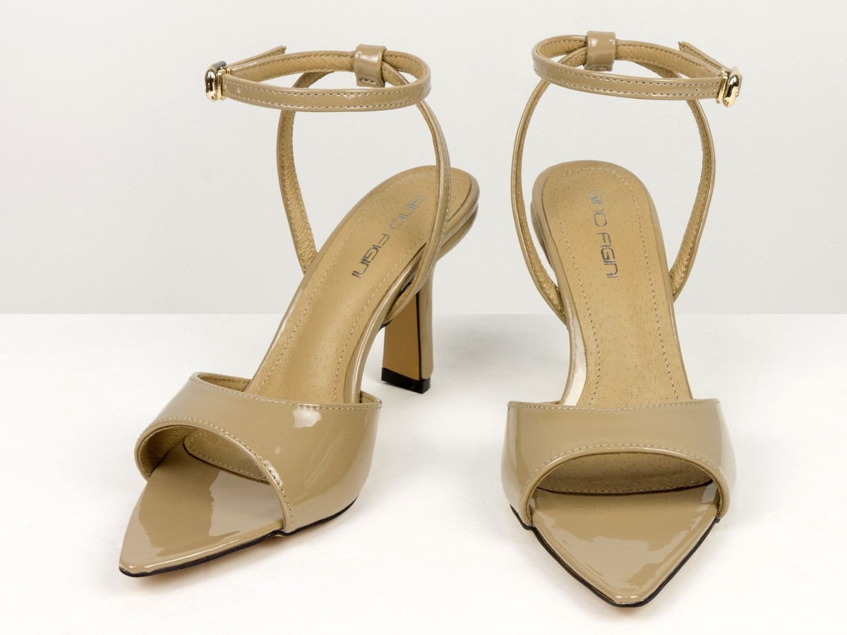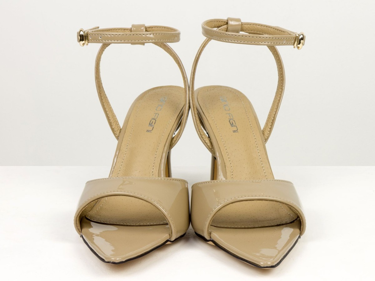 Елегантні босоніжки, які підкреслюють жіночність з першого кроку. Модель виконана з натуральної лакованої шкіри в благородному відтінку капучино - кольорі, який легко поєднується як зі світлими, так і з темними образами. Тонкі ремінці з фіксацією на щиколотці красиво підкреслюють ногу та забезпечують надійну посадку. Акуратний каблук додає висоти та витонченості, не перевантажуючи образ. Ідеальний варіант для подій, вечерь, свят та стильних повсякденних луків.