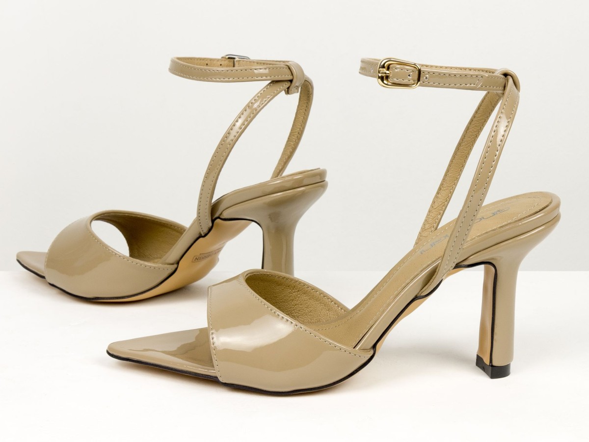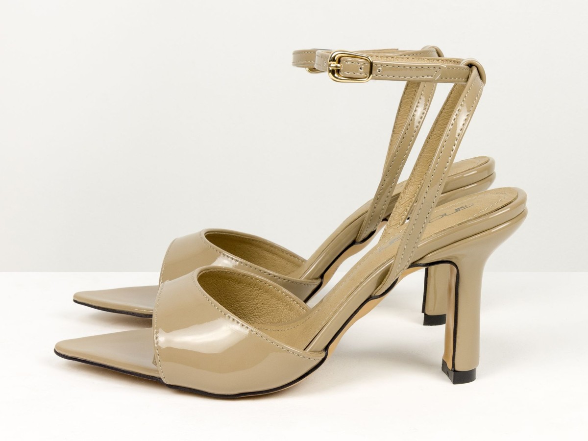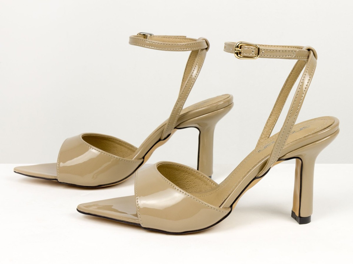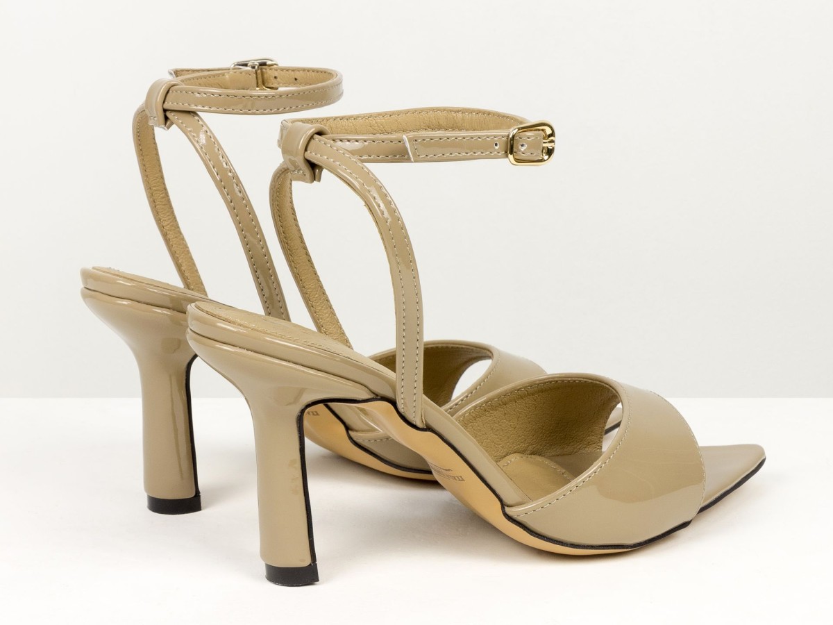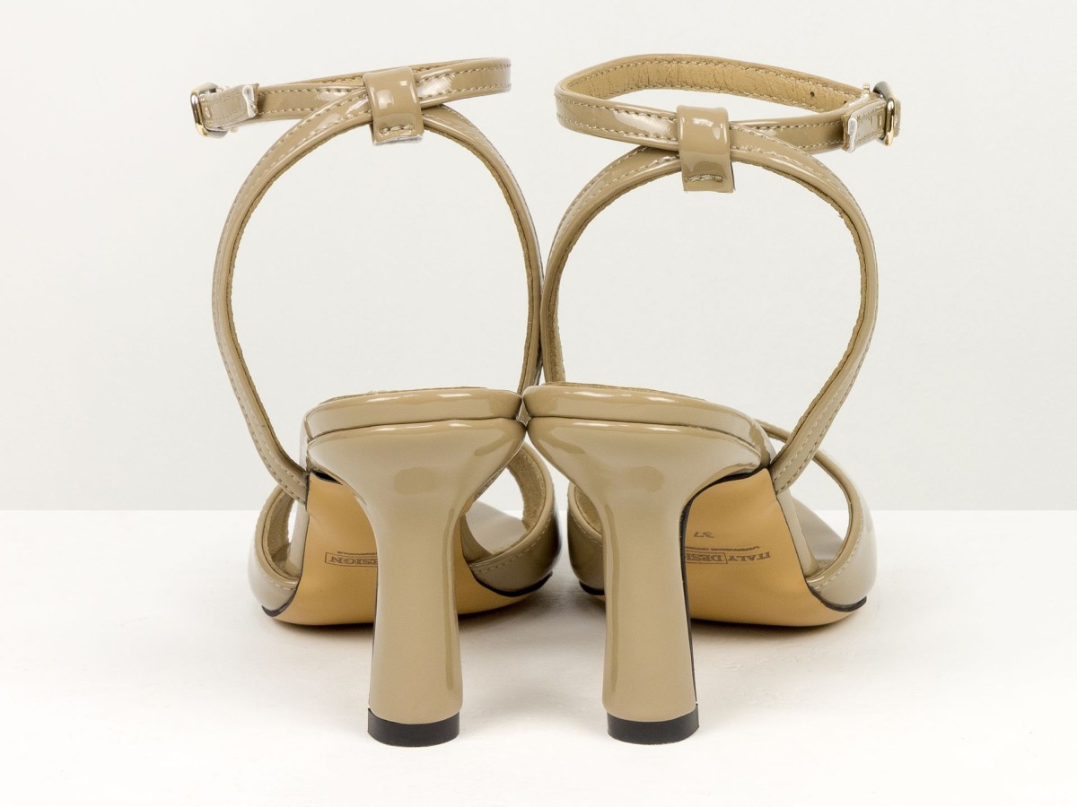 Елегантні босоніжки, які підкреслюють жіночність з першого кроку. Модель виконана з натуральної лакованої шкіри в благородному відтінку капучино - кольорі, який легко поєднується як зі світлими, так і з темними образами. Тонкі ремінці з фіксацією на щиколотці красиво підкреслюють ногу та забезпечують надійну посадку. Акуратний каблук додає висоти та витонченості, не перевантажуючи образ. Ідеальний варіант для подій, вечерь, свят та стильних повсякденних луків.
