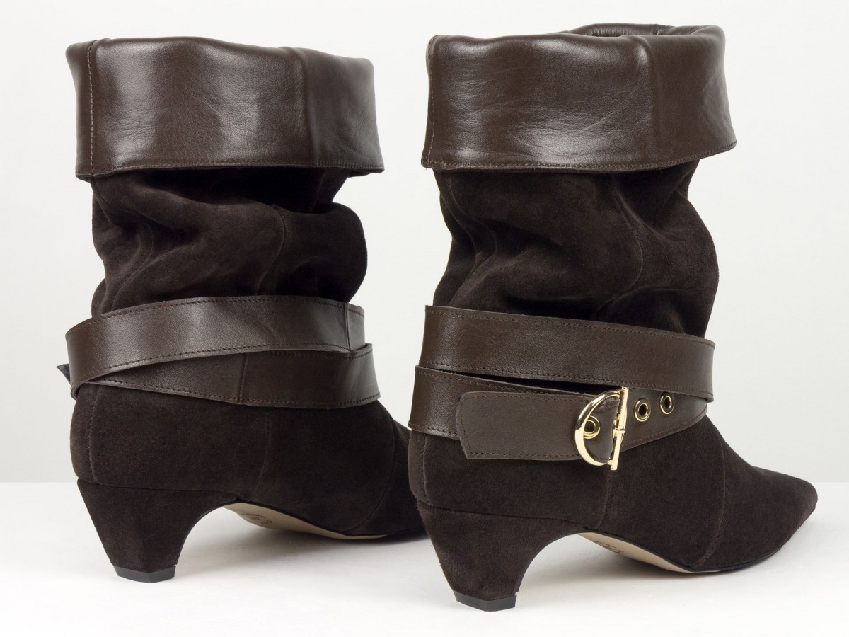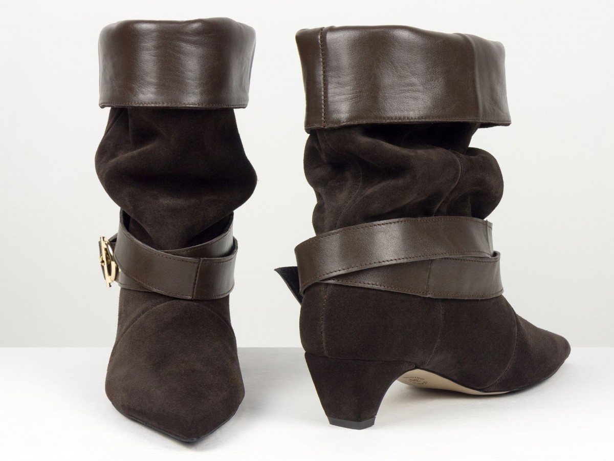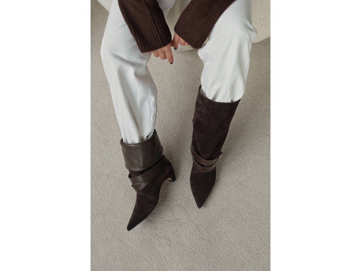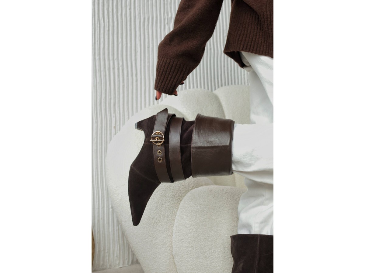 Эти ботинки - настоящий must-have сезона, созданный для женщин, которые ценят стиль, изящество и неповторимость. Модель выполнена из премиальной мягкой натуральной замши в насыщенном шоколадном оттенке, который выглядит роскошно и благородно.