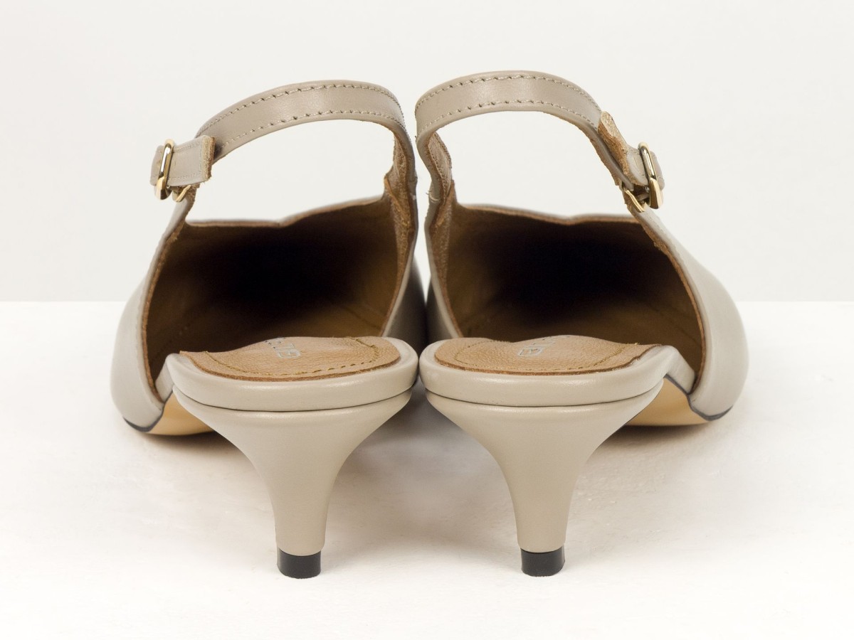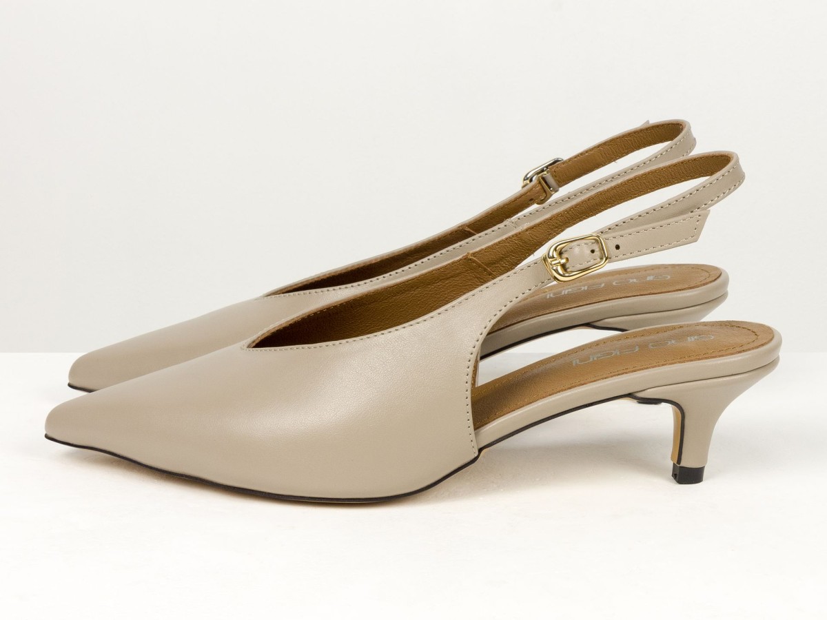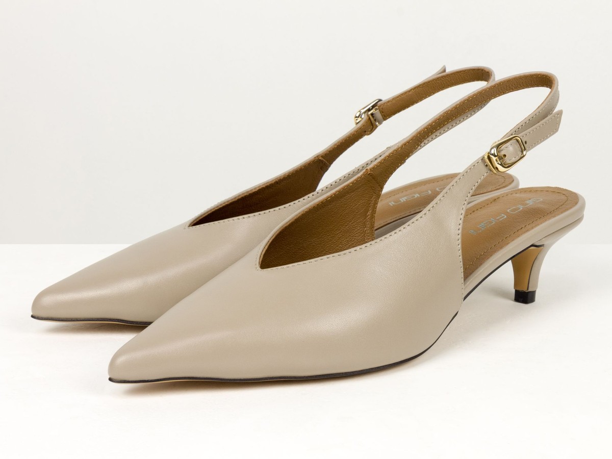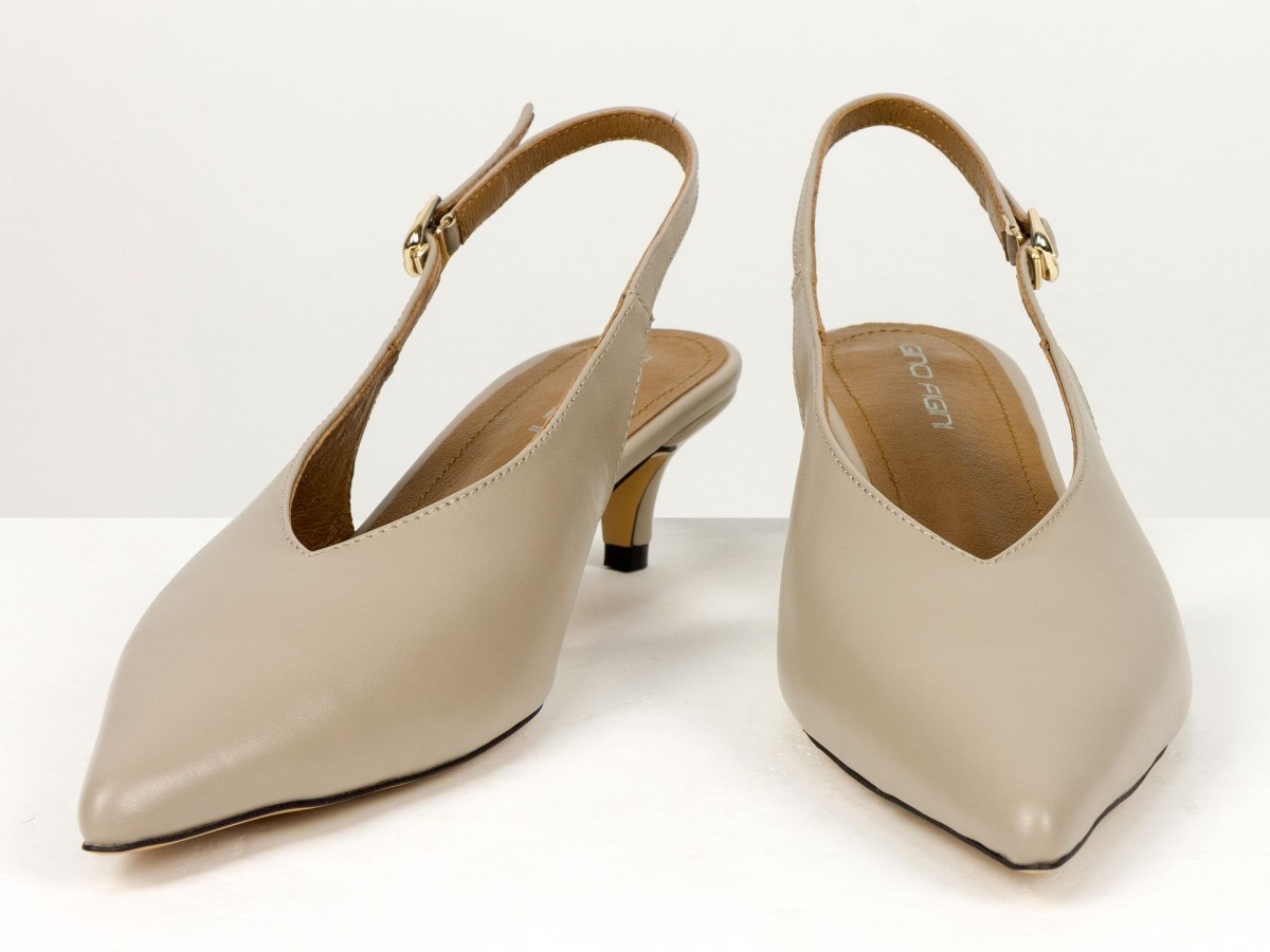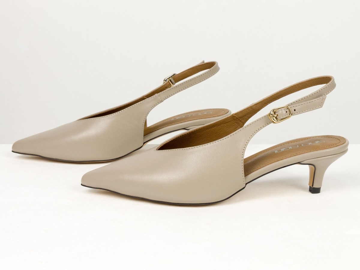 Елегантні слінгбеки туфлі у бежевому відтінку - ідеальний баланс мінімалізму та жіночності. Витончений гострий носок візуально подовжує ногу, а акуратний каблук середньої висоти забезпечує комфорт протягом усього дня.