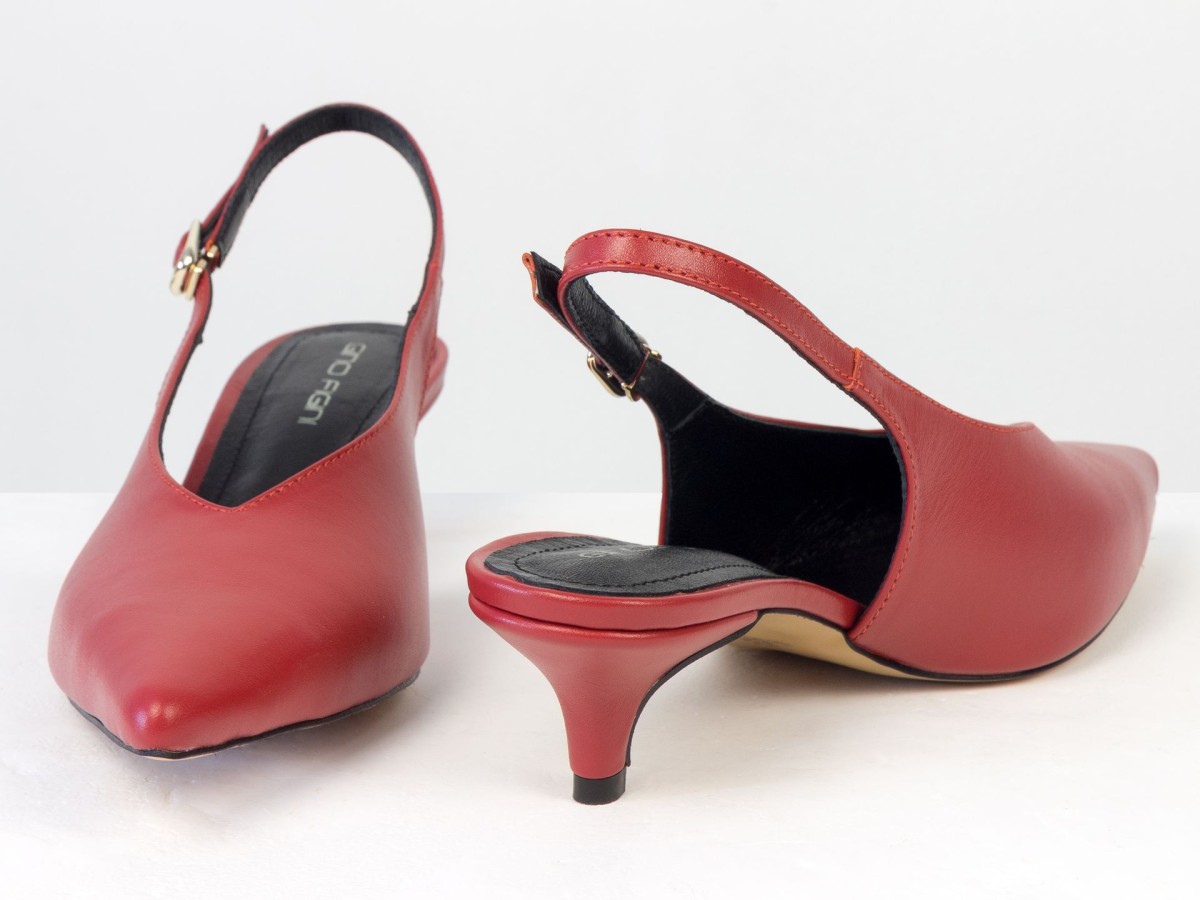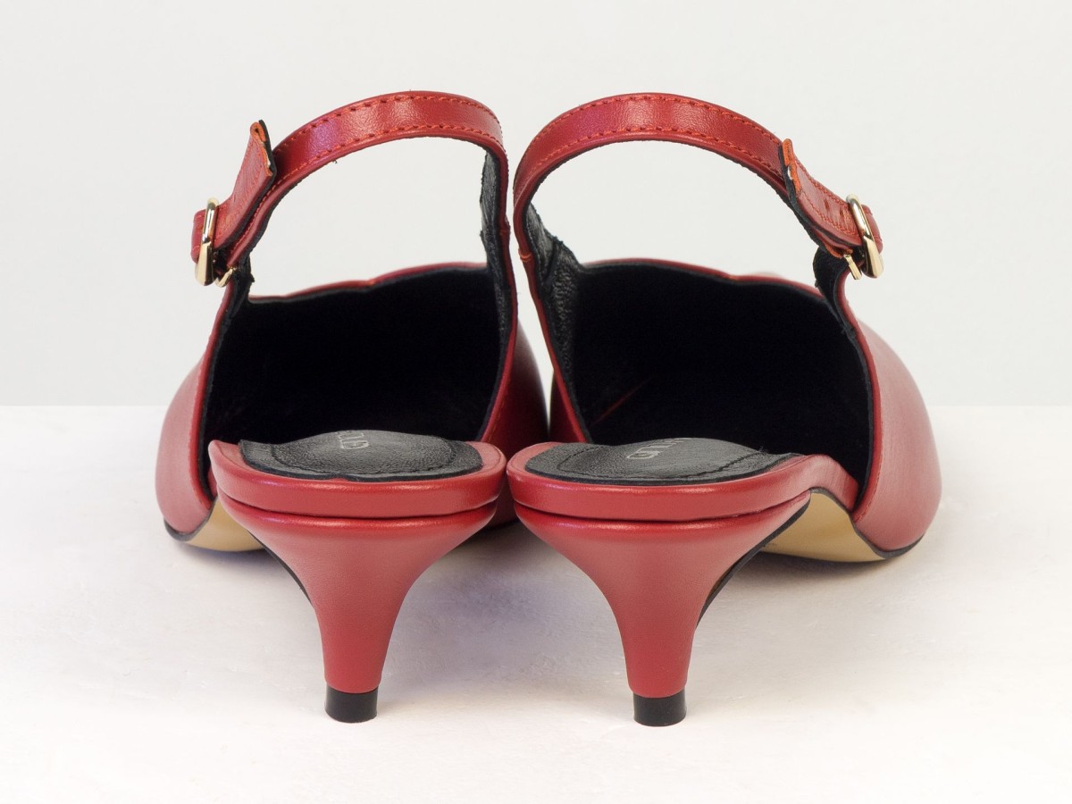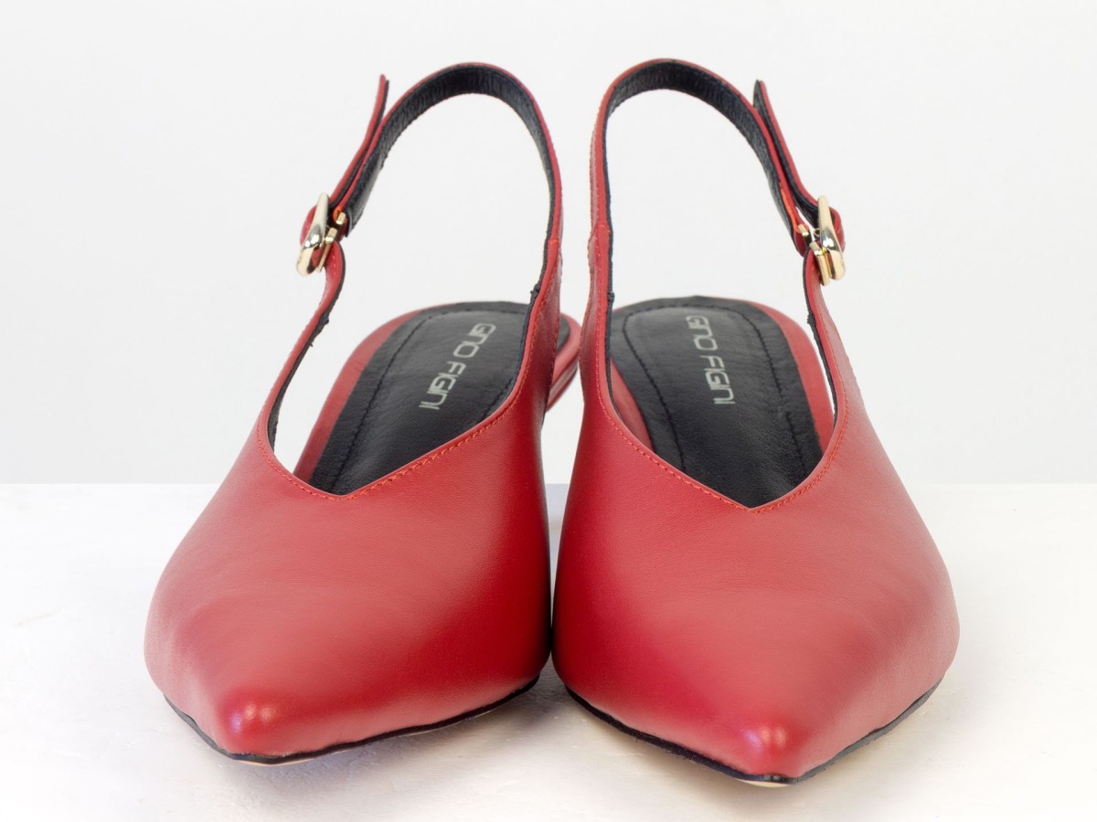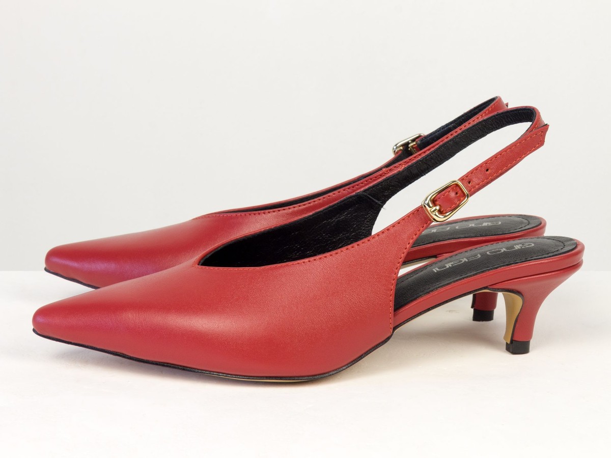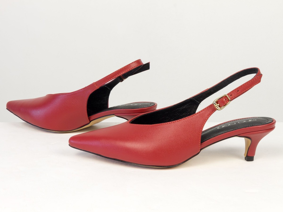 Елегантні слінгбеки туфлі у червоному відтінку - ідеальний баланс мінімалізму та жіночності. Витончений гострий носок візуально подовжує ногу, а акуратний каблук середньої висоти забезпечує комфорт протягом усього дня.