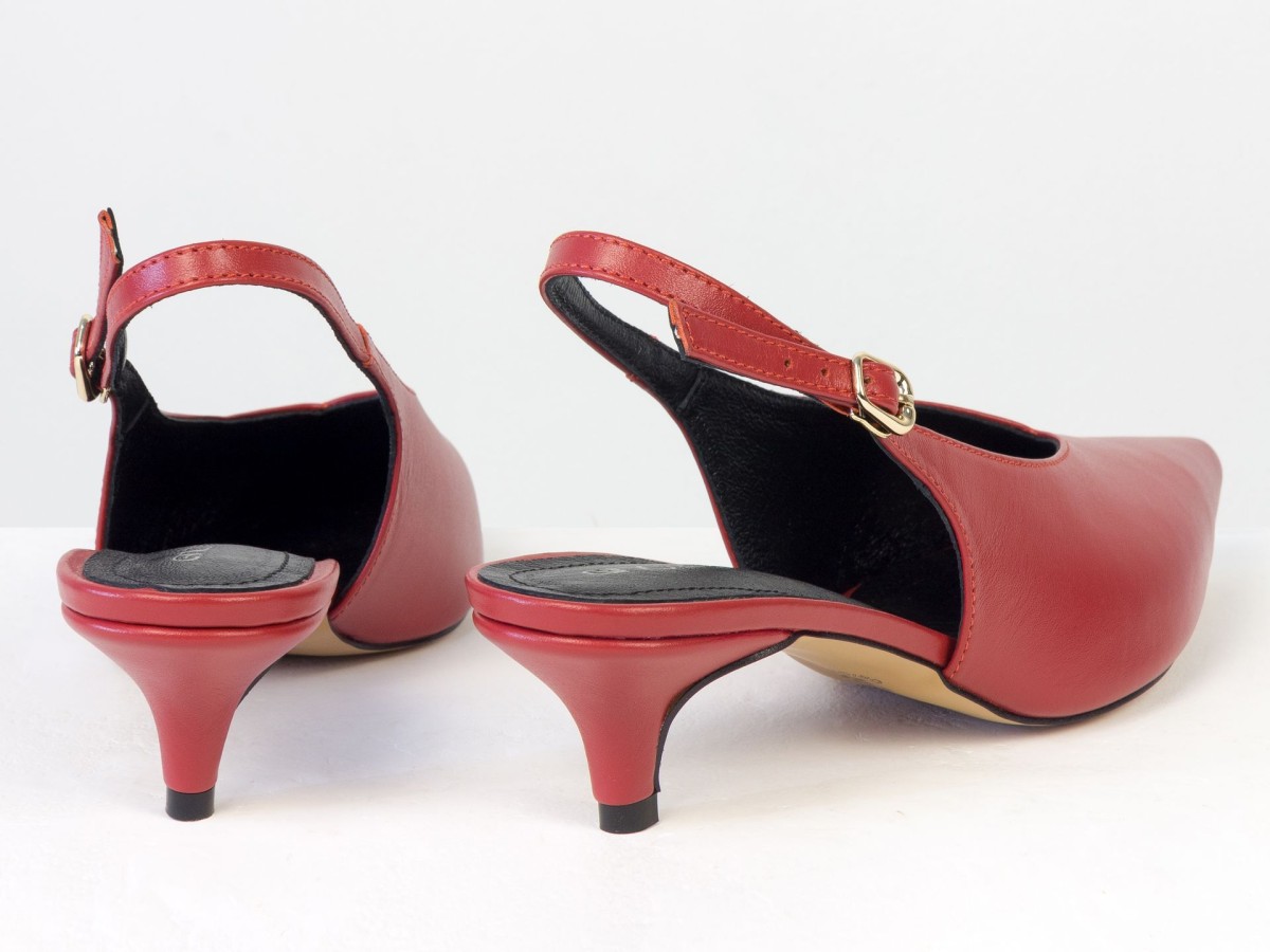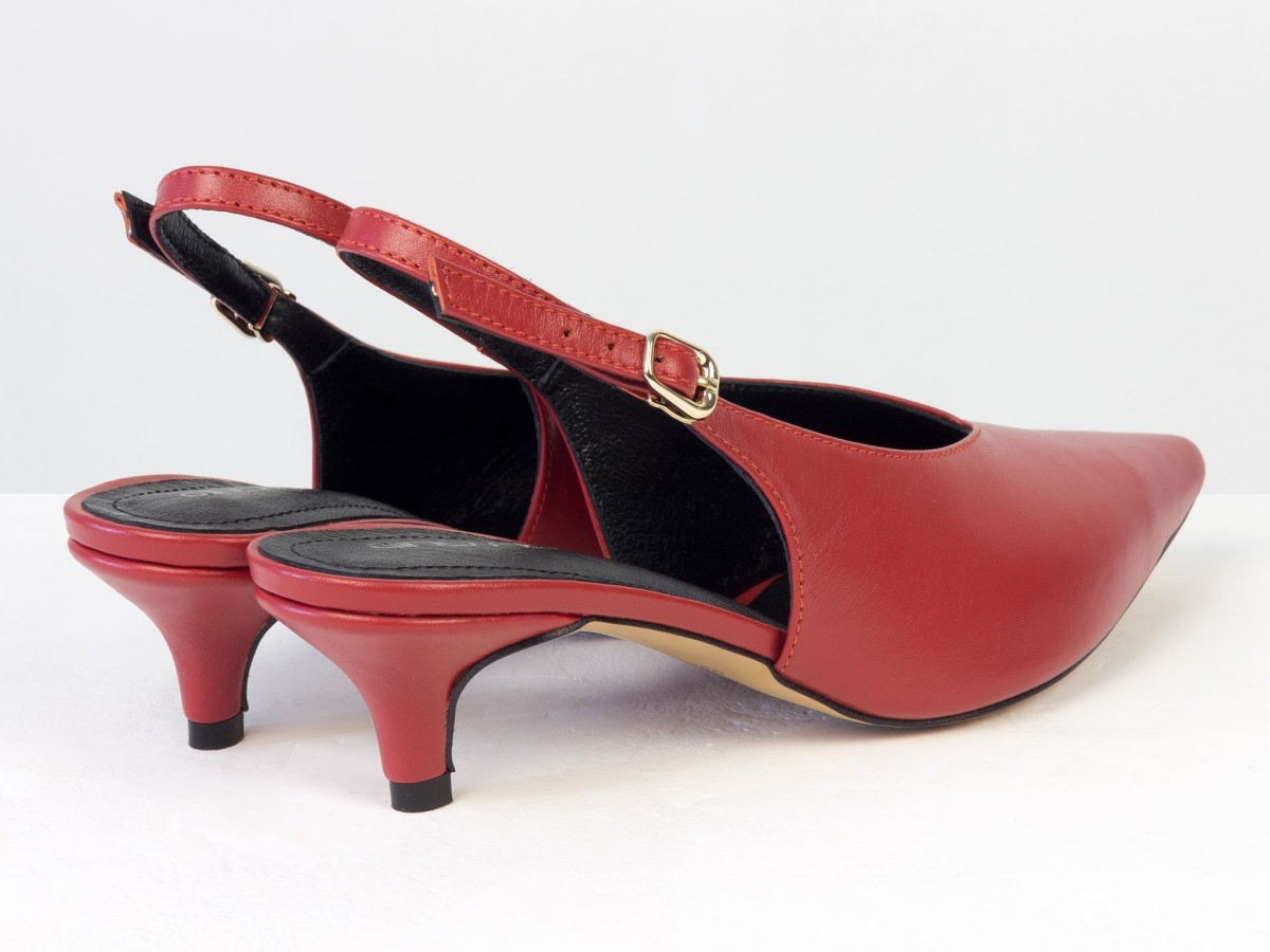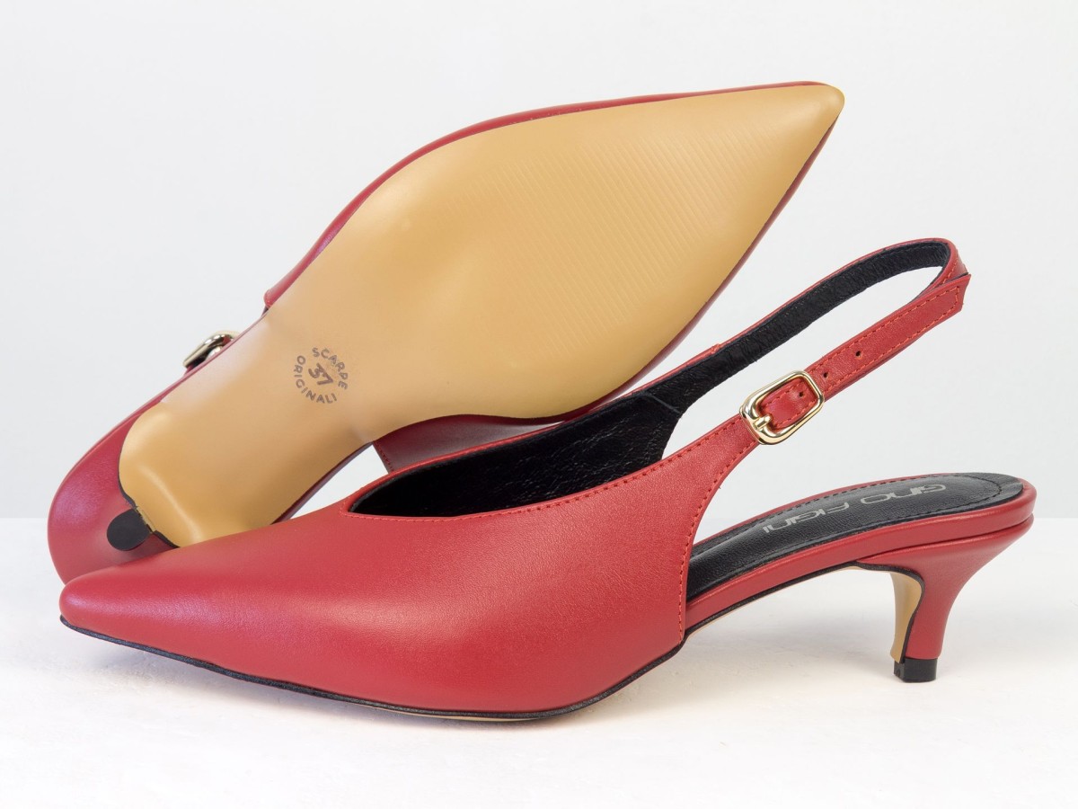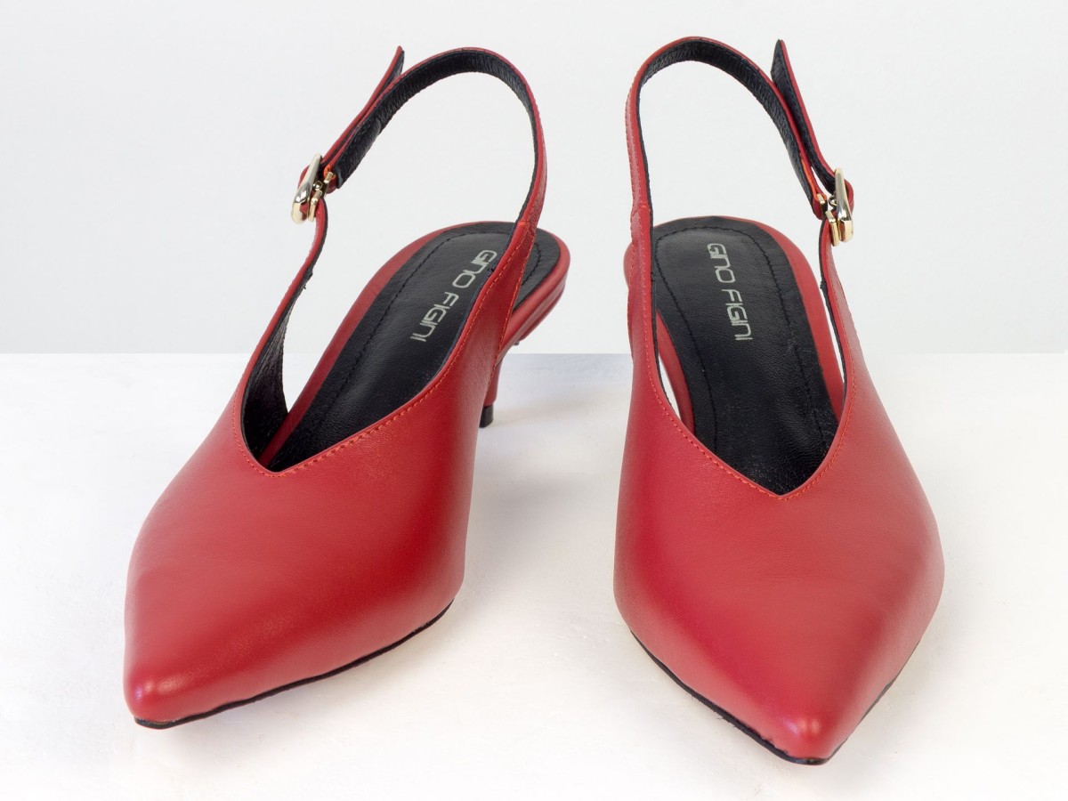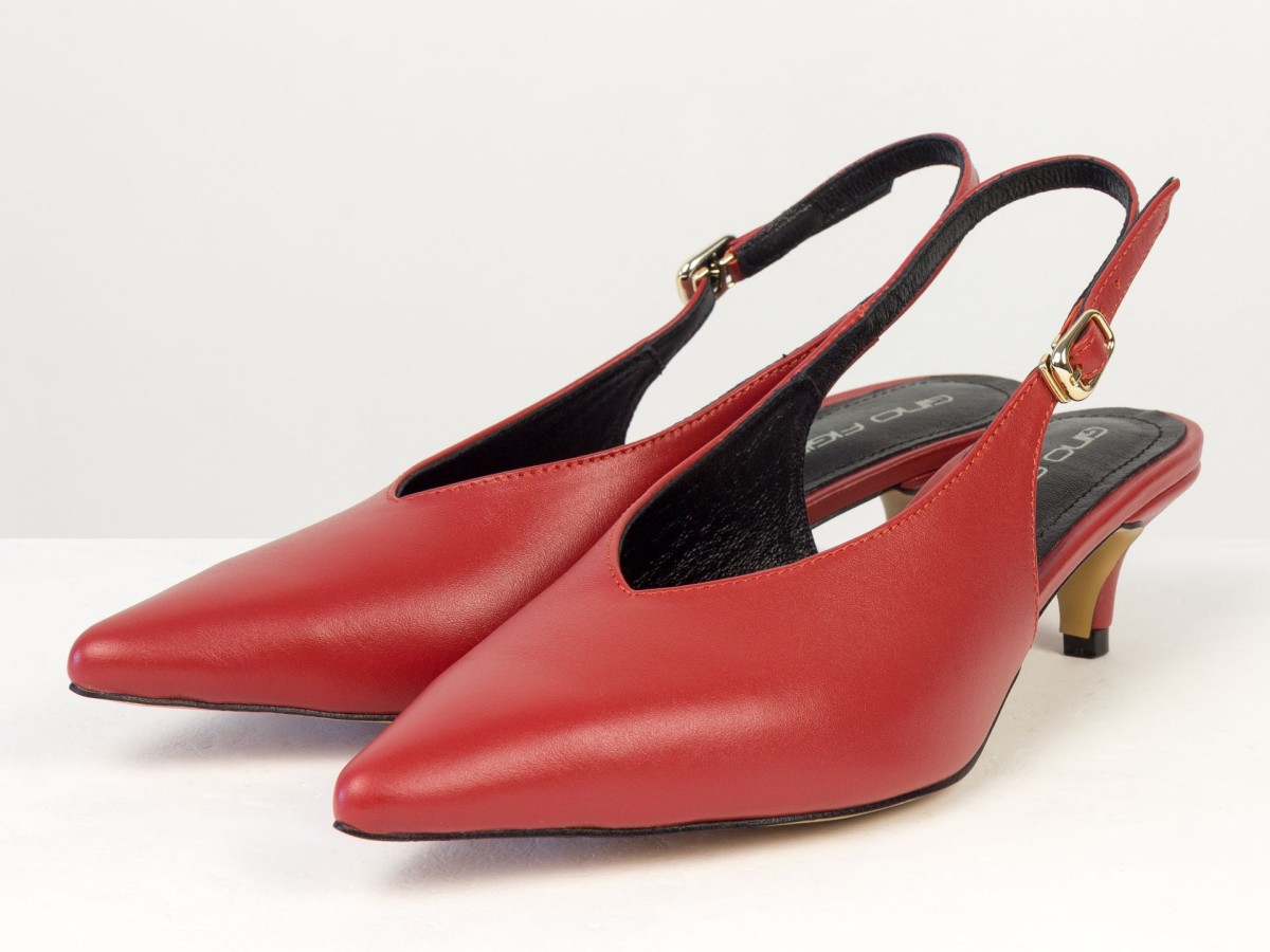 Елегантні слінгбеки туфлі у червоному відтінку - ідеальний баланс мінімалізму та жіночності. Витончений гострий носок візуально подовжує ногу, а акуратний каблук середньої висоти забезпечує комфорт протягом усього дня.