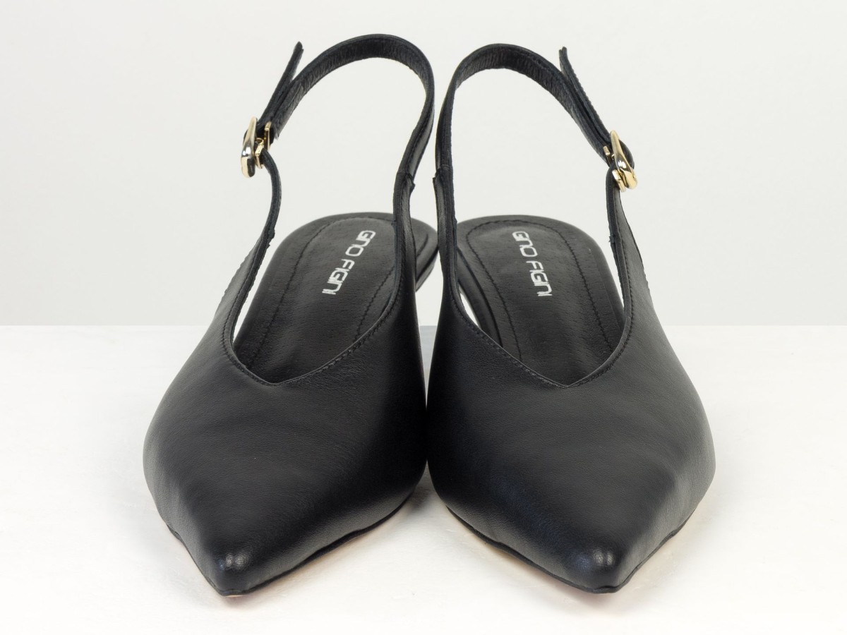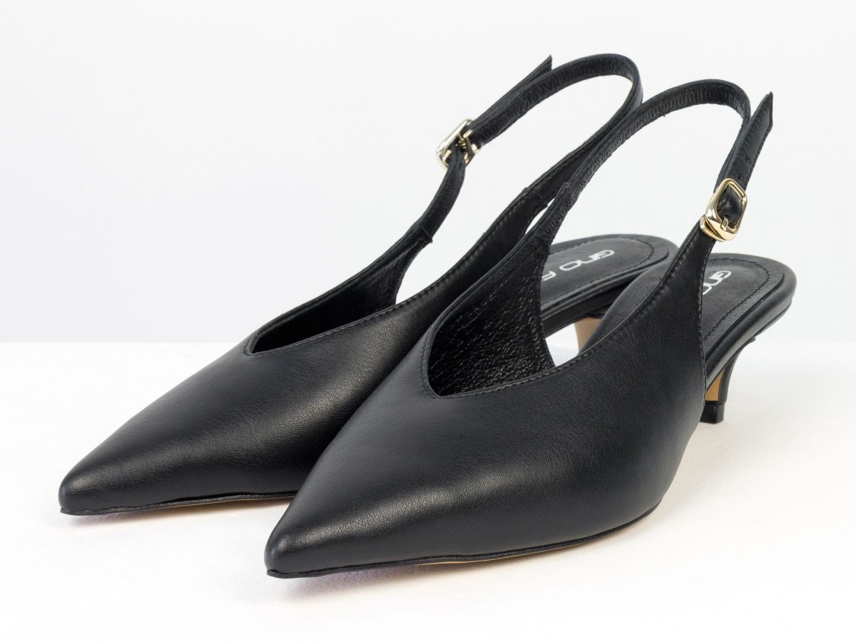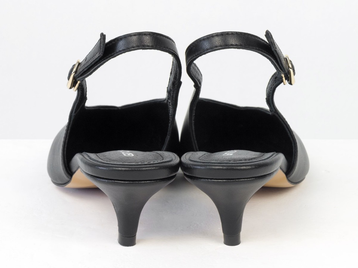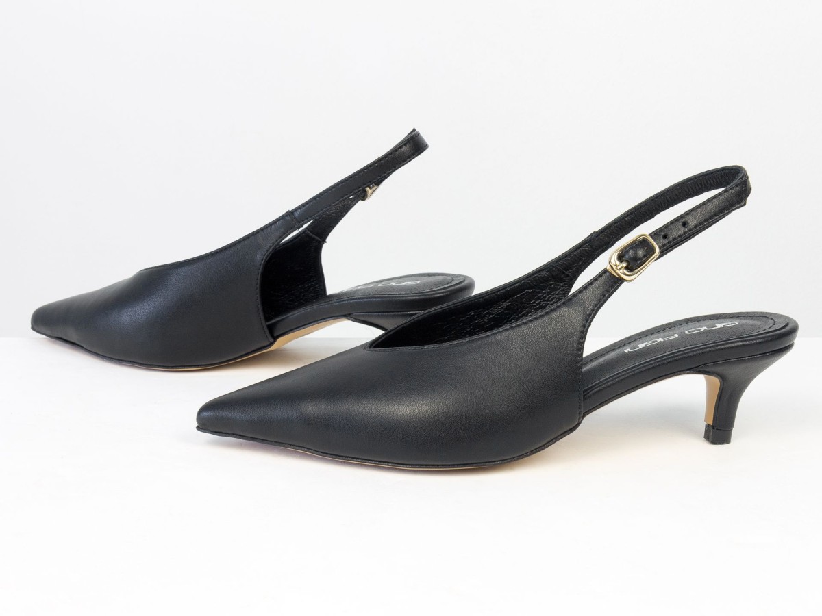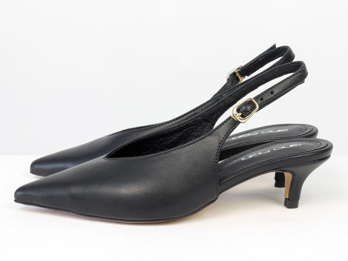 Елегантні слінгбеки туфлі у чорному відтінку - ідеальний баланс мінімалізму та жіночності. Витончений гострий носок візуально подовжує ногу, а акуратний каблук середньої висоти забезпечує комфорт протягом усього дня.