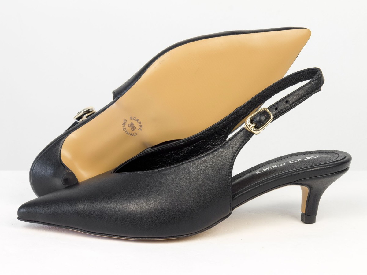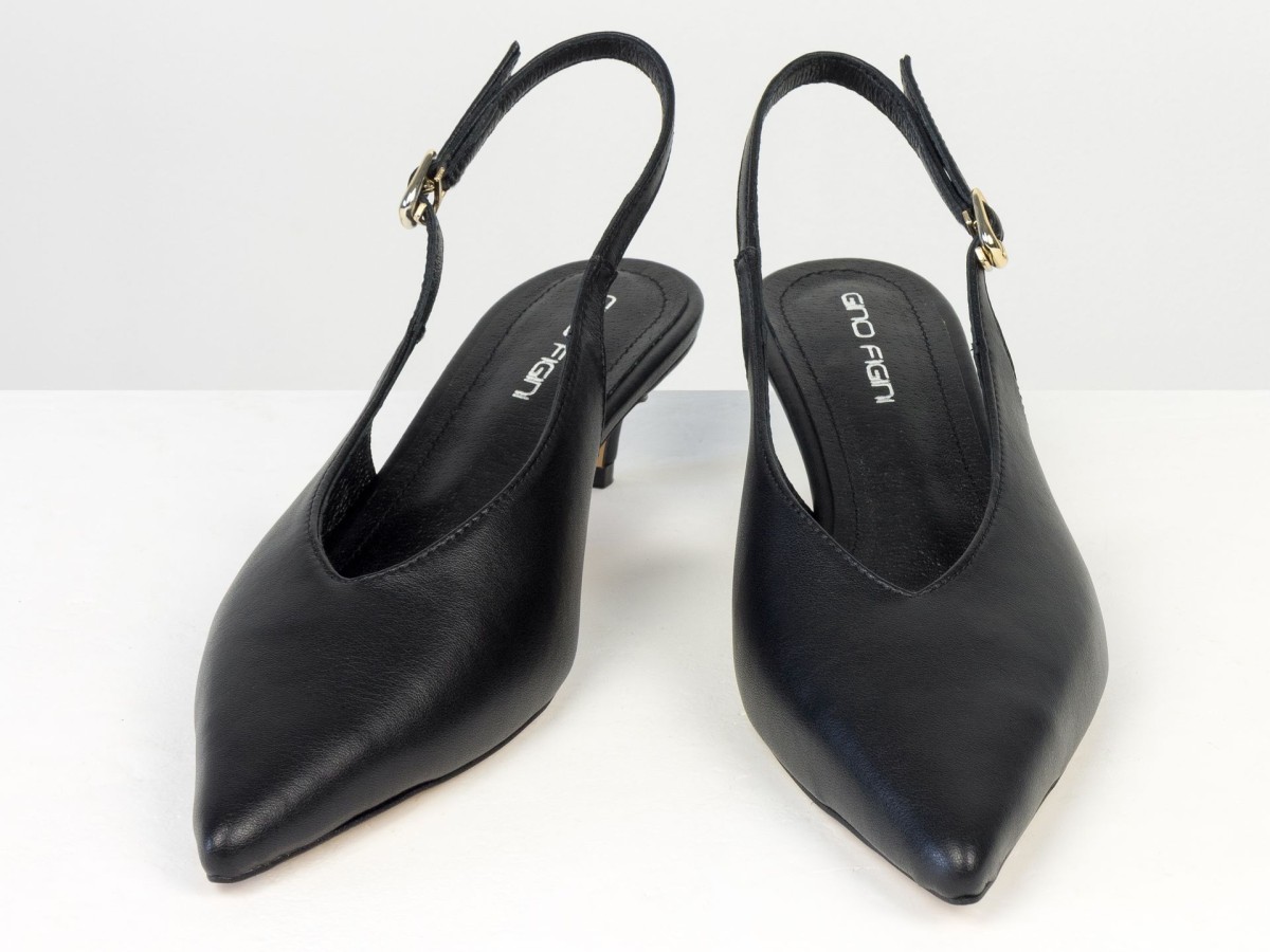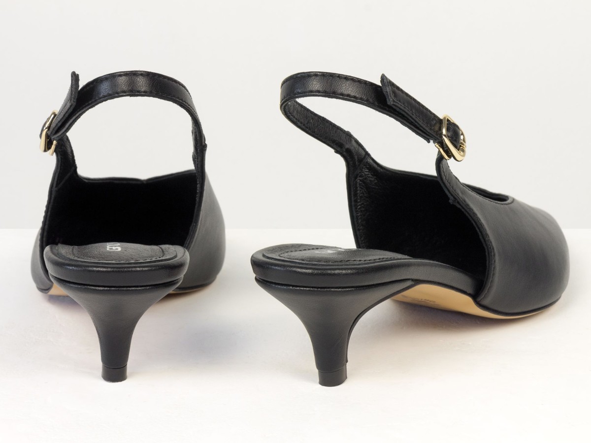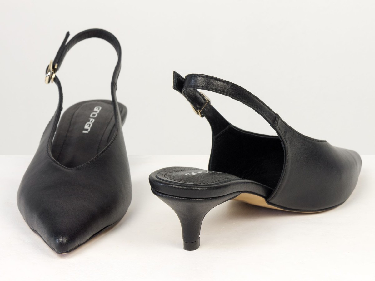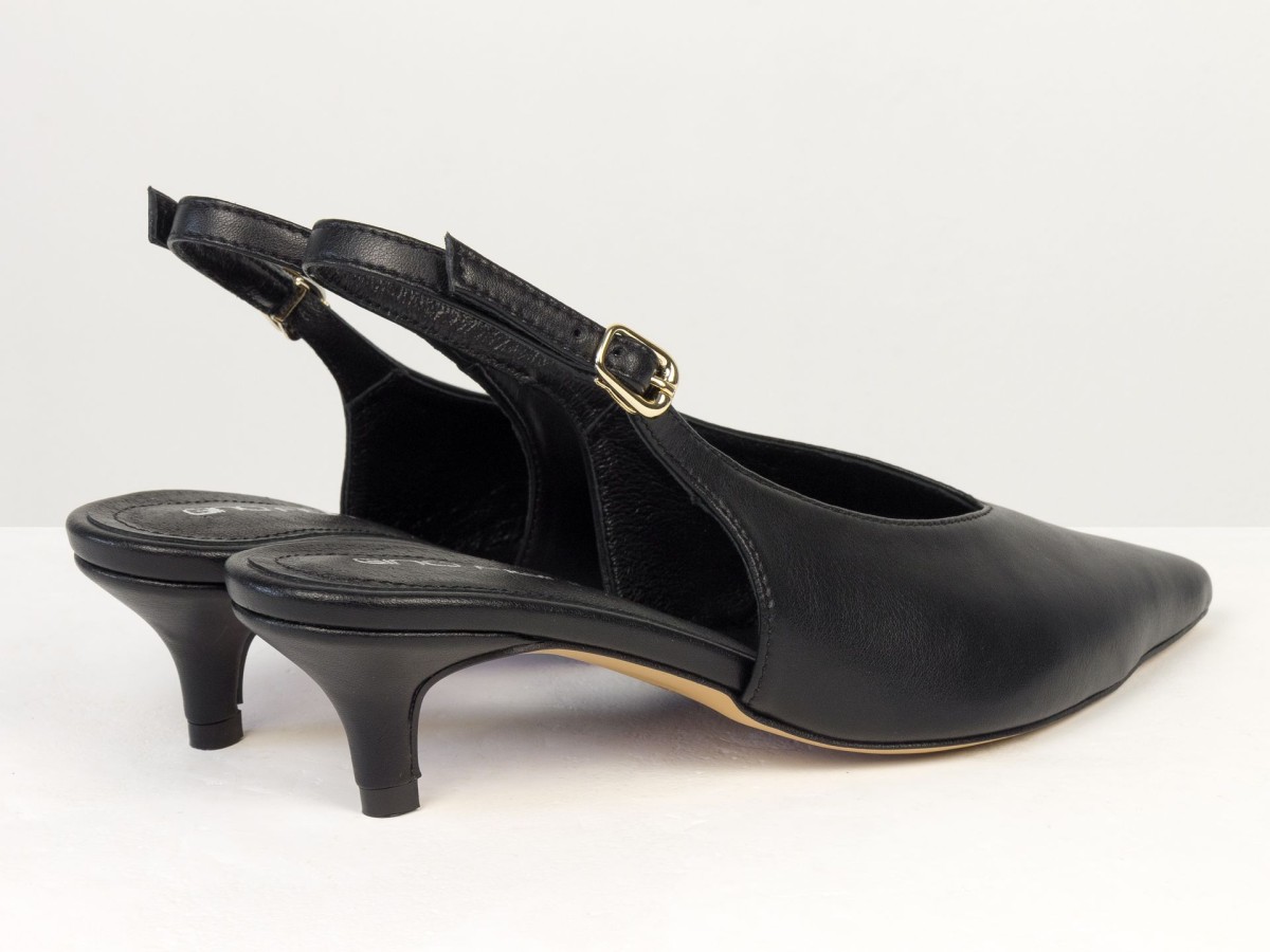 Елегантні слінгбеки туфлі у чорному відтінку - ідеальний баланс мінімалізму та жіночності. Витончений гострий носок візуально подовжує ногу, а акуратний каблук середньої висоти забезпечує комфорт протягом усього дня.