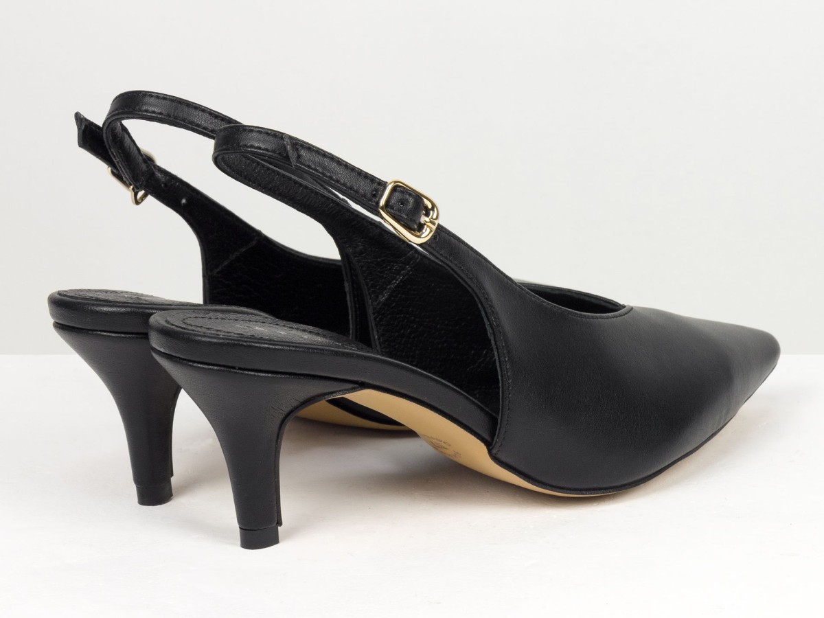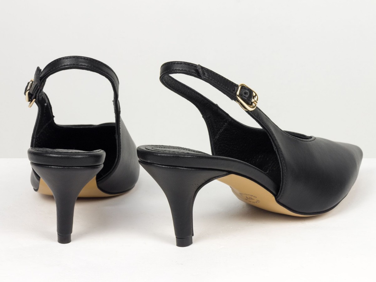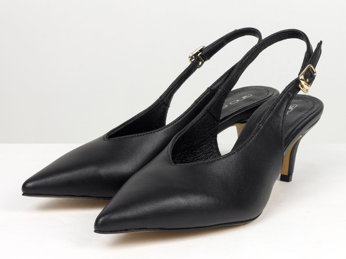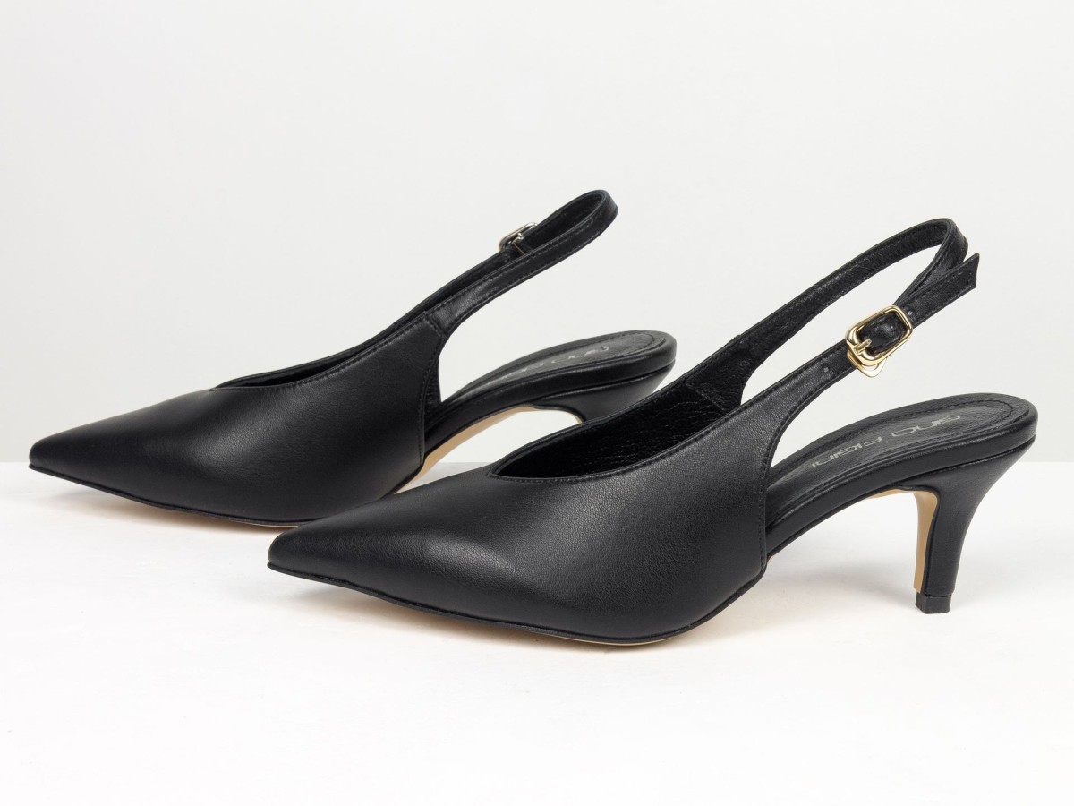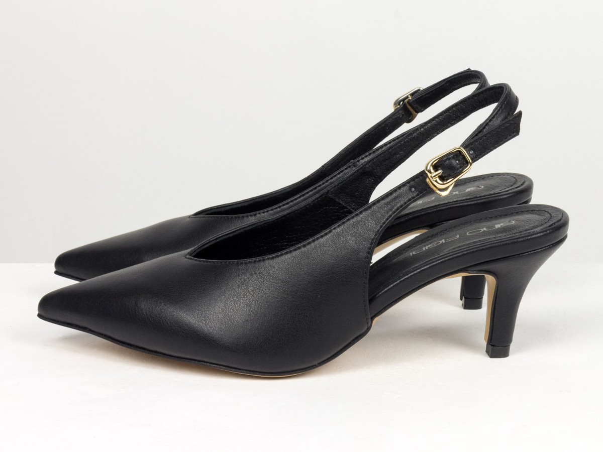 Елегантні слінгбеки туфлі у чорному відтінку - ідеальний баланс мінімалізму та жіночності. Витончений гострий носок візуально подовжує ногу, а акуратний каблук середньої висоти забезпечує комфорт протягом усього дня.
