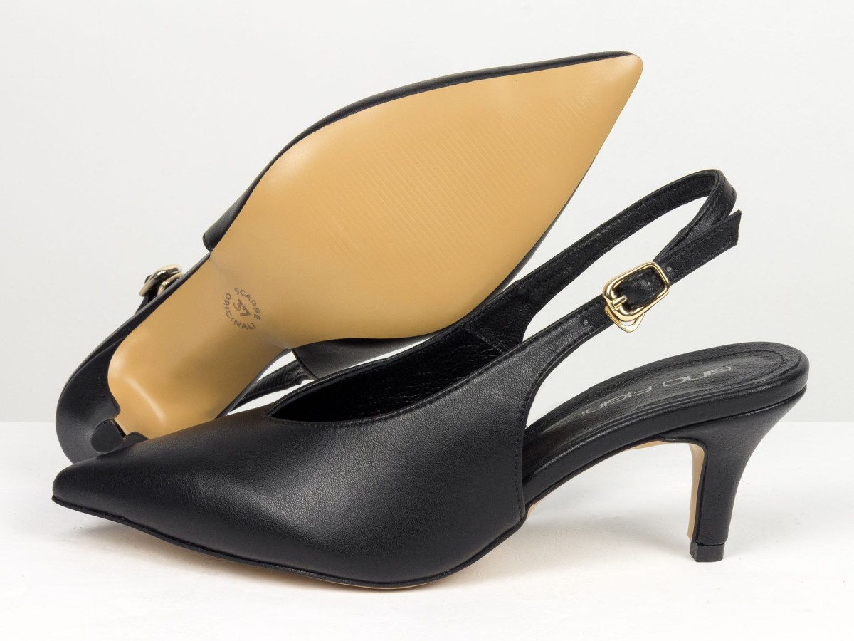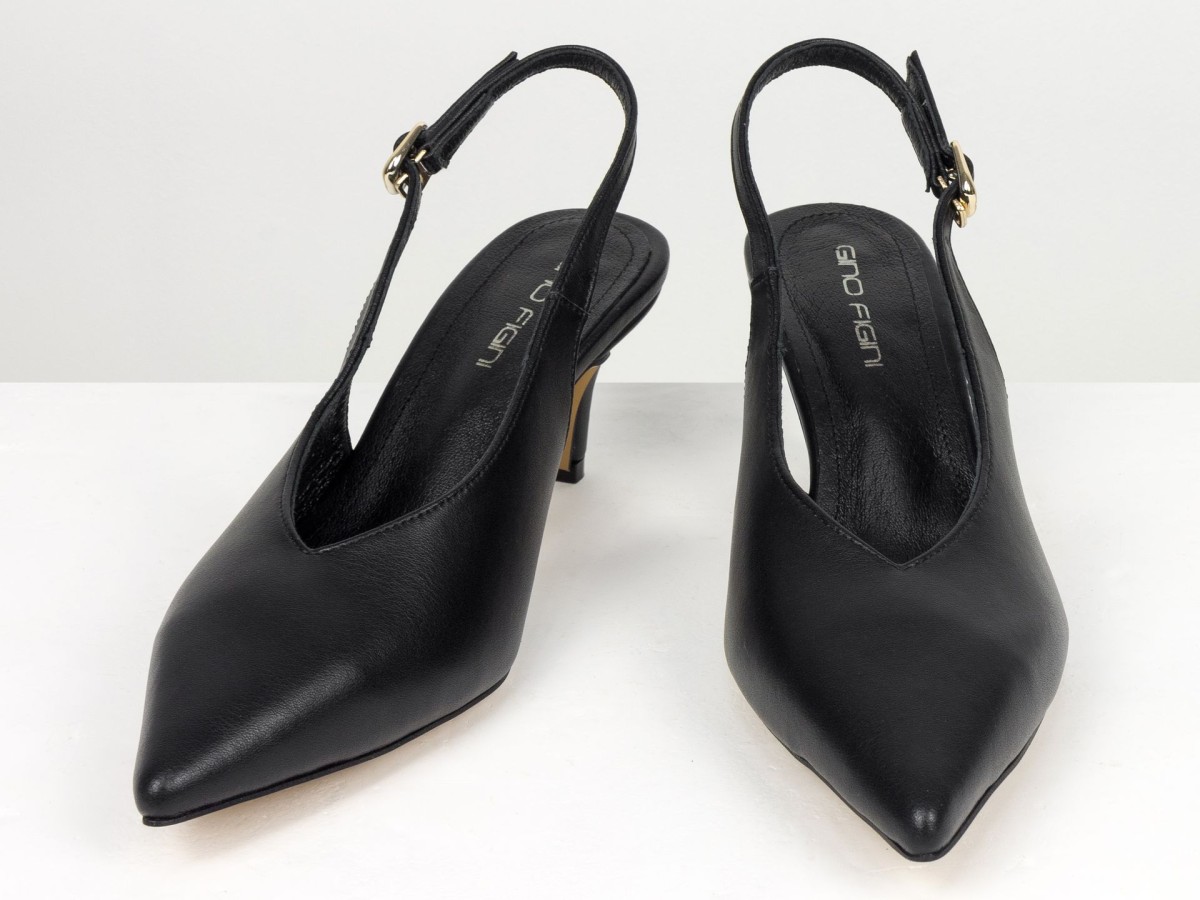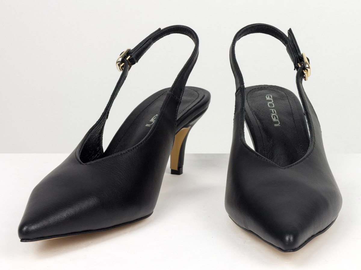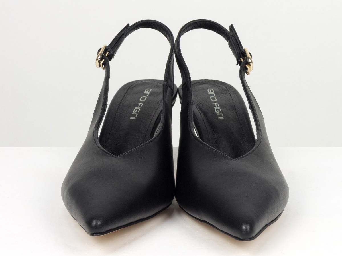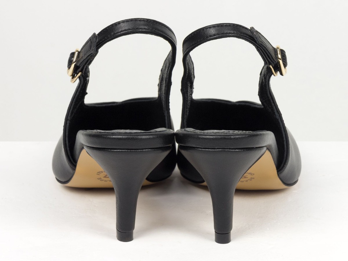 Елегантні слінгбеки туфлі у чорному відтінку - ідеальний баланс мінімалізму та жіночності. Витончений гострий носок візуально подовжує ногу, а акуратний каблук середньої висоти забезпечує комфорт протягом усього дня.