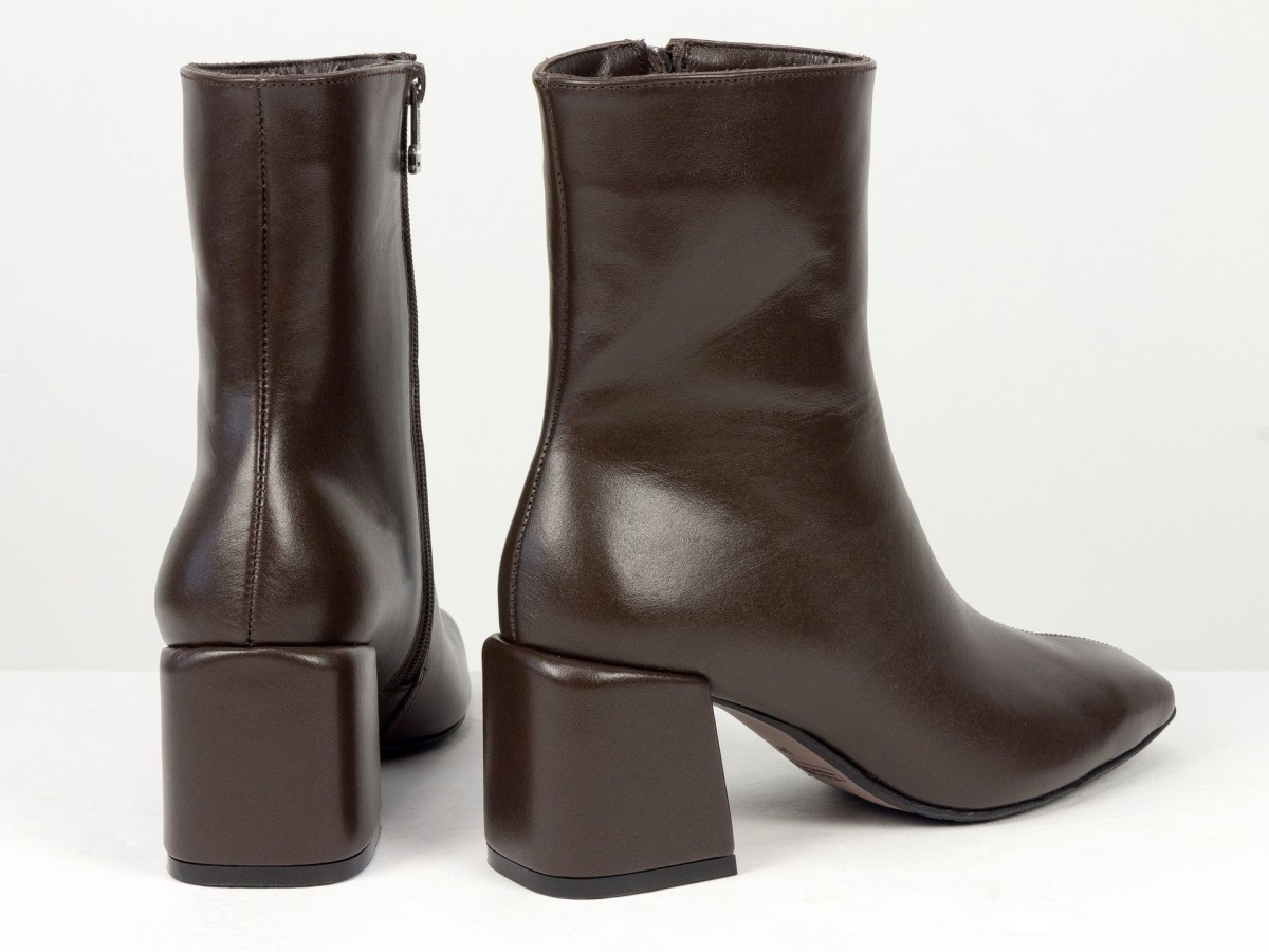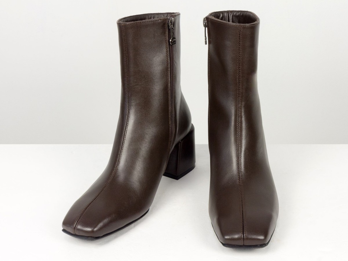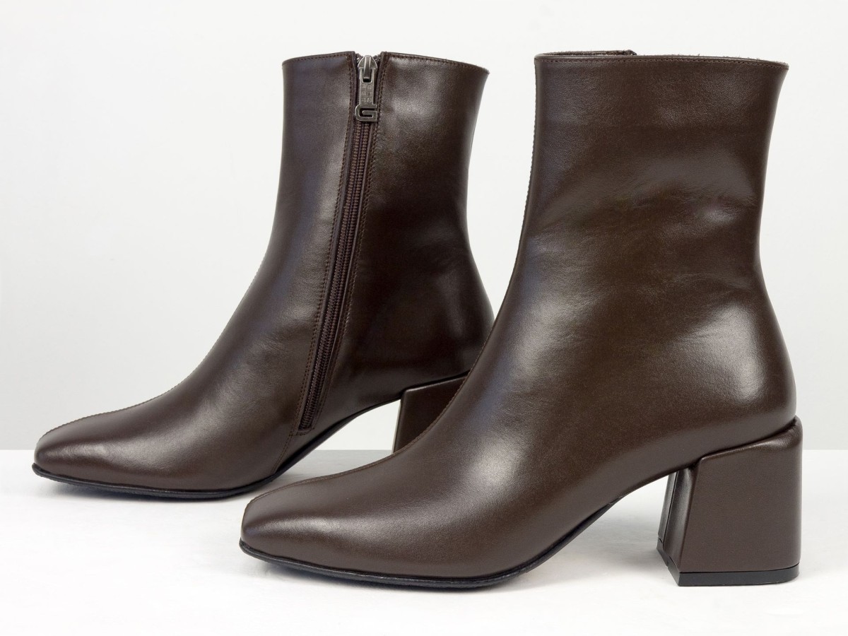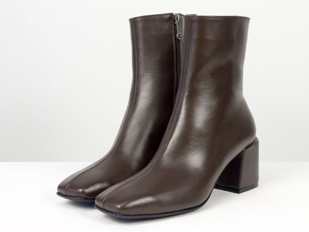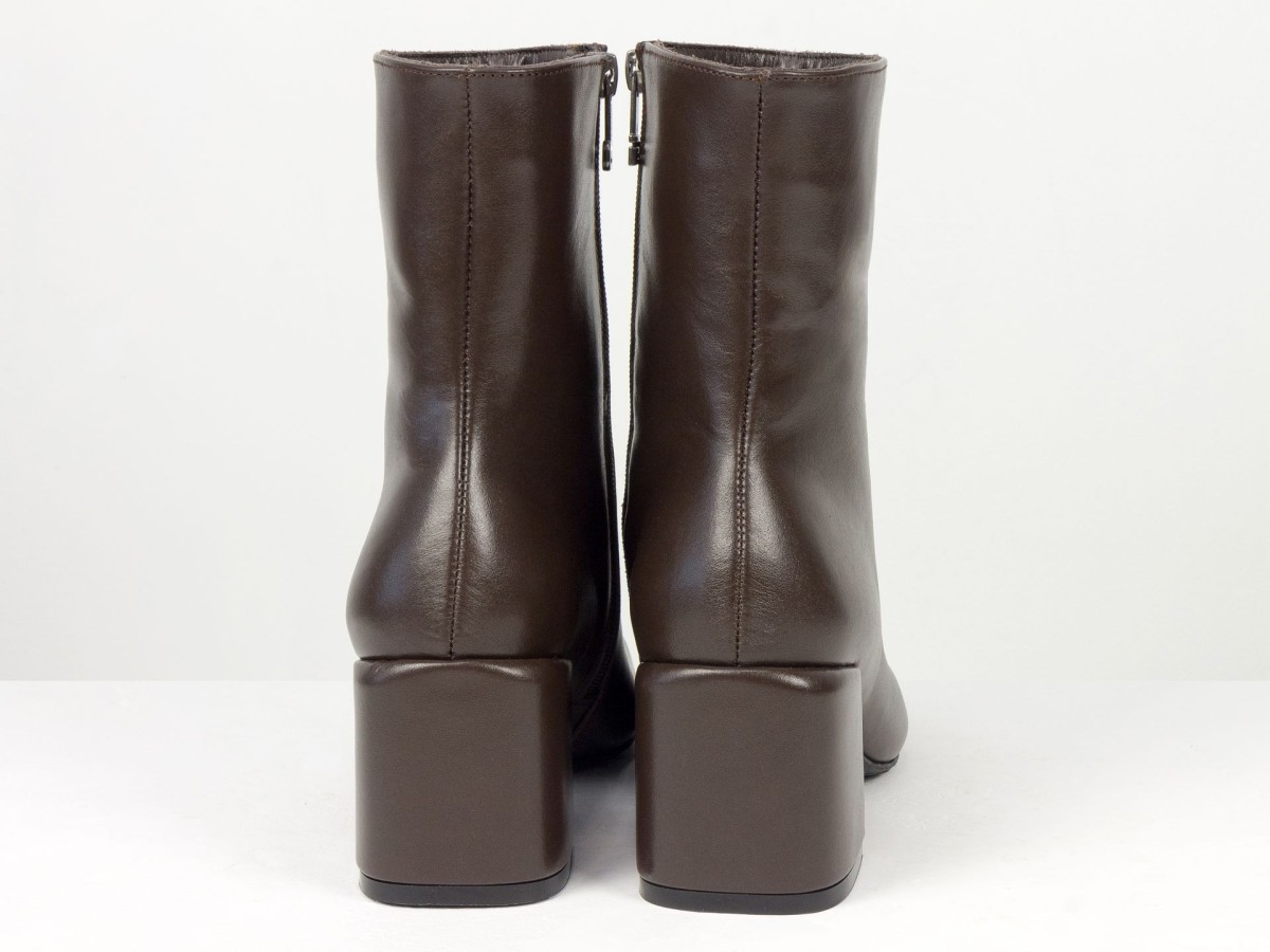 Стильні базові черевики, які легко впишуться у будь-який гардероб. Модель виконана з натуральної гладкої шкіри у глибокому відтінку гіркого шоколаду - кольорі, який виглядає м’якше за чорний, але так само універсальний. Лаконічний дизайн без зайвих деталей робить пару ідеальною для щоденного носіння, офісу та міських образів. Стійкий каблук забезпечує комфорт і впевненість протягом усього дня. Зручна блискавка збоку дозволяє швидко взуватися, а продумана колодка гарантує комфорт навіть при активному використанні.