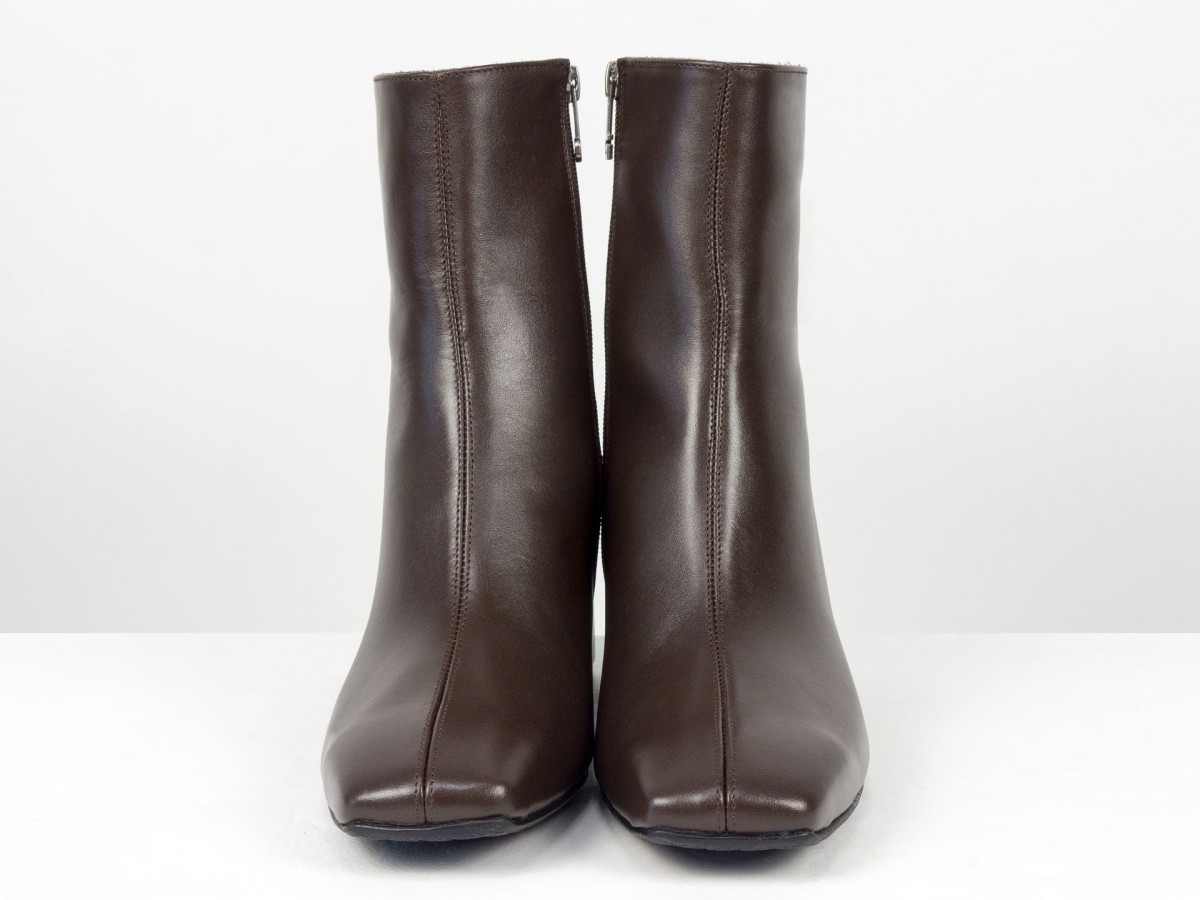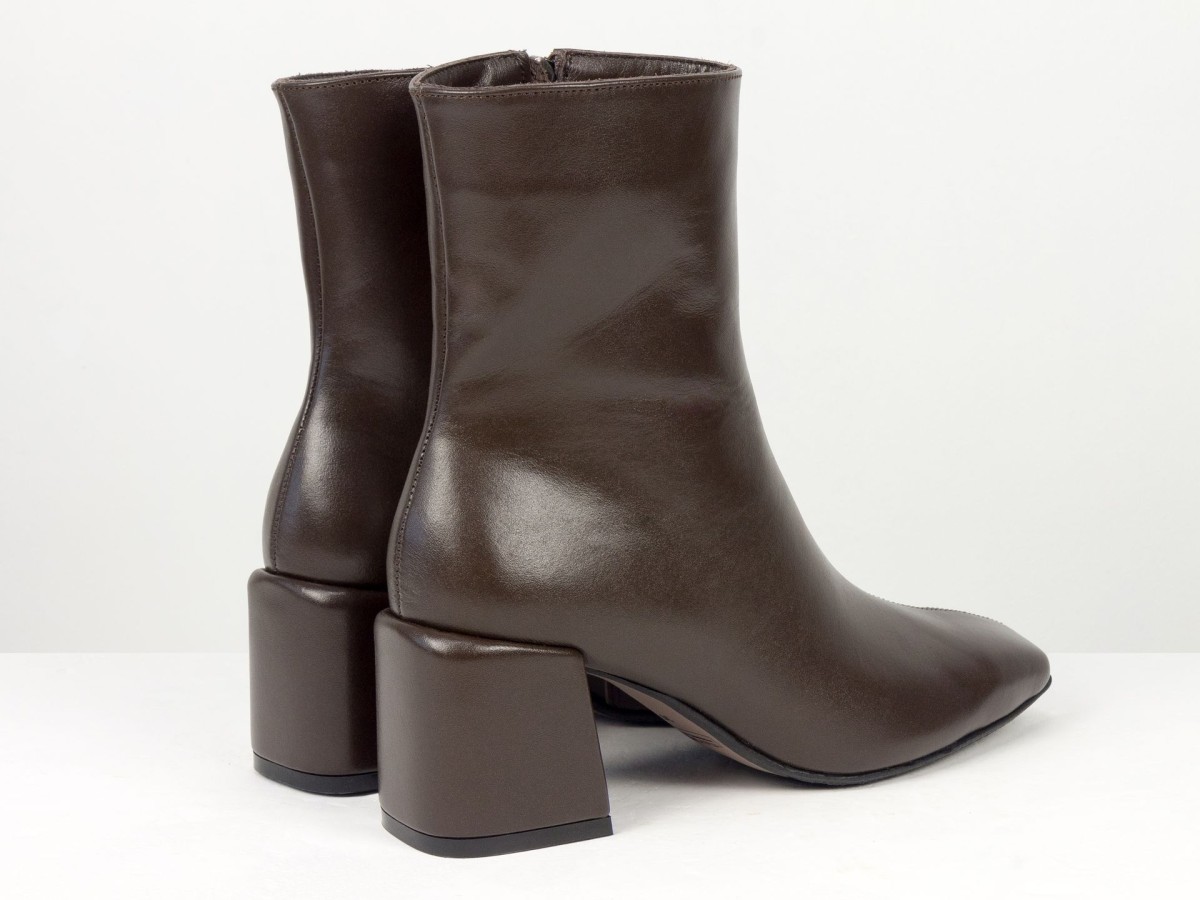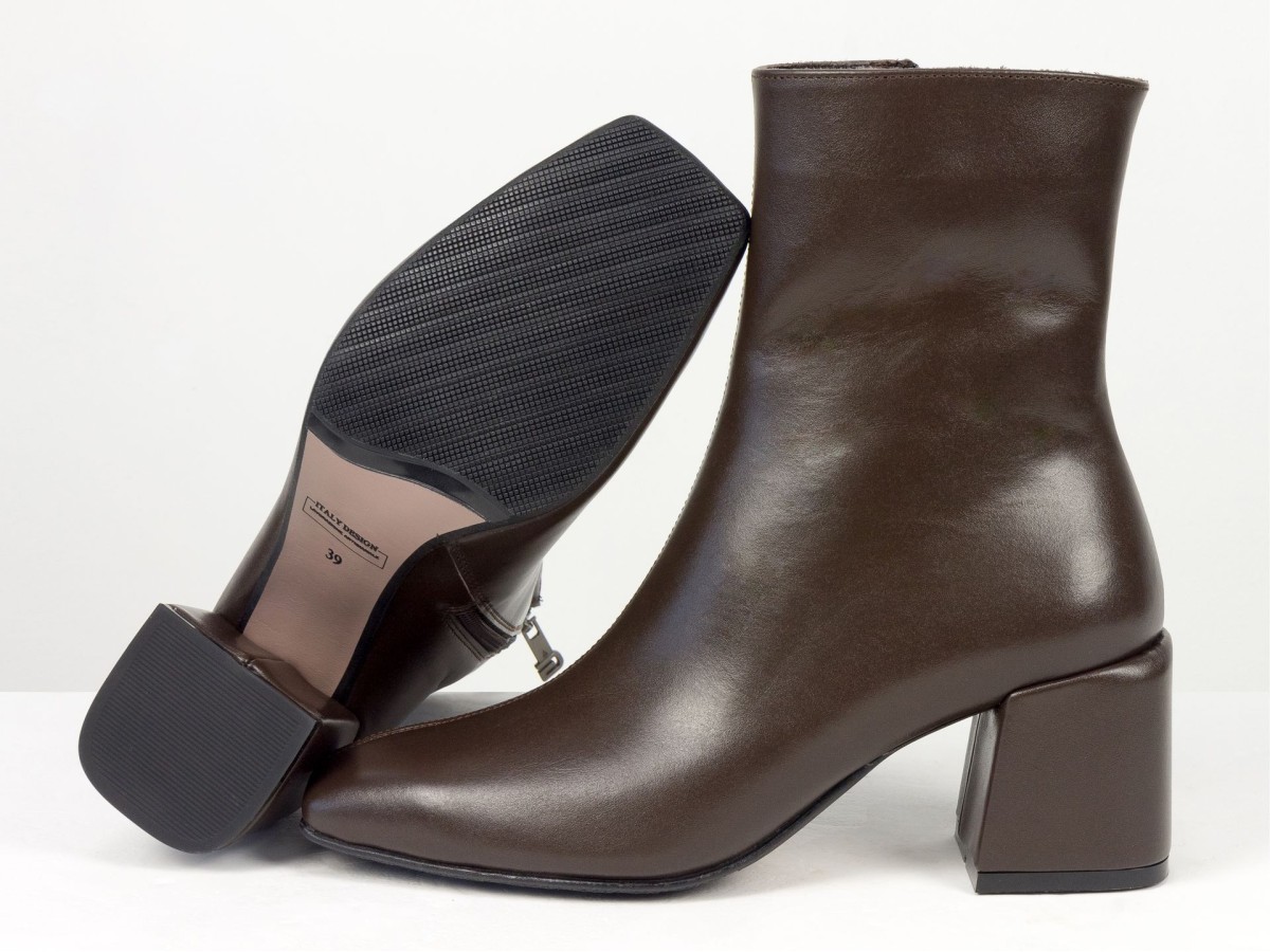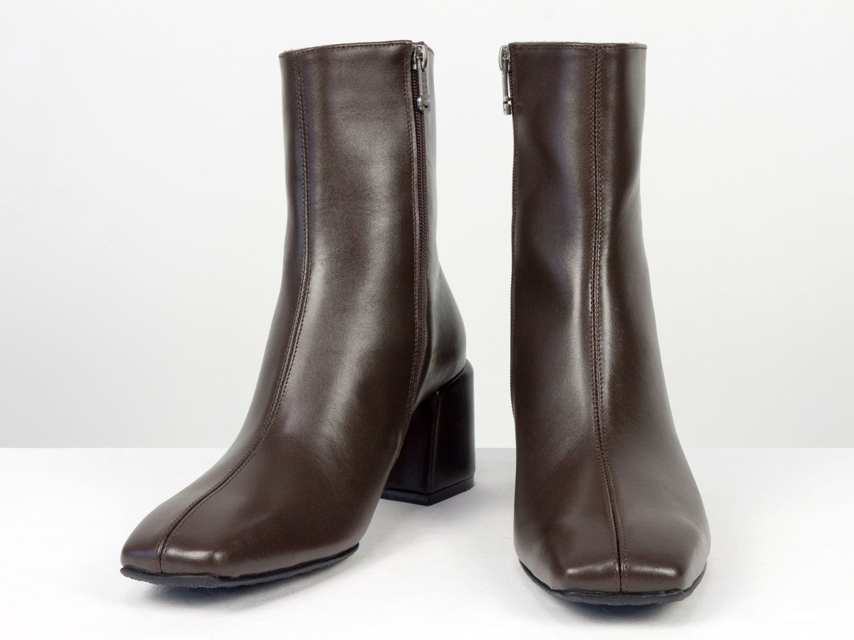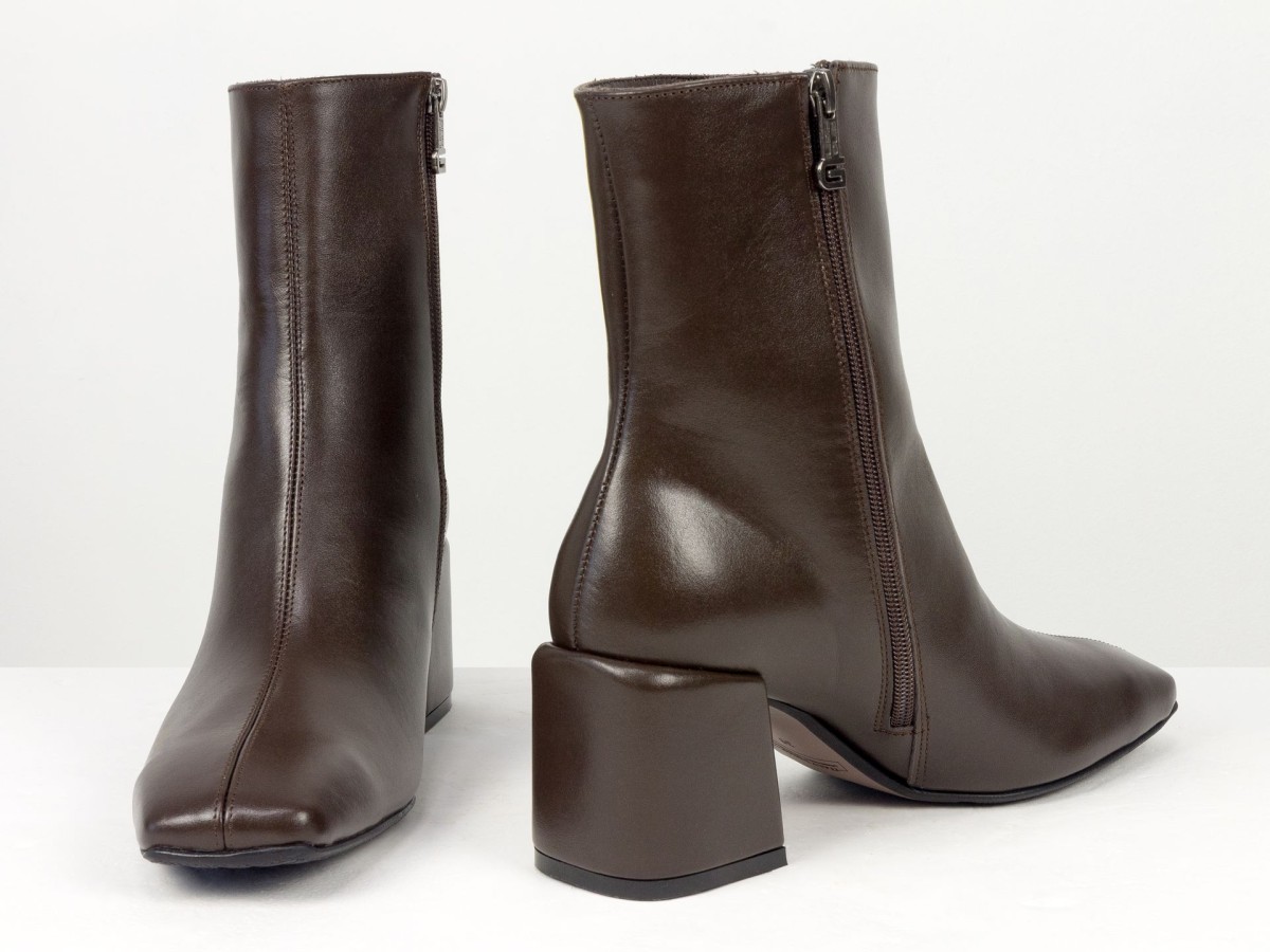 Стильні базові черевики, які легко впишуться у будь-який гардероб. Модель виконана з натуральної гладкої шкіри у глибокому відтінку гіркого шоколаду - кольорі, який виглядає м’якше за чорний, але так само універсальний. Лаконічний дизайн без зайвих деталей робить пару ідеальною для щоденного носіння, офісу та міських образів. Стійкий каблук забезпечує комфорт і впевненість протягом усього дня. Зручна блискавка збоку дозволяє швидко взуватися, а продумана колодка гарантує комфорт навіть при активному використанні.