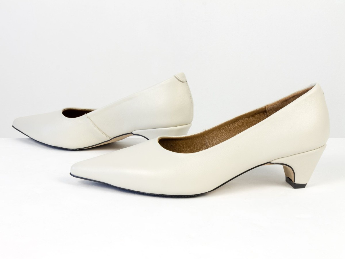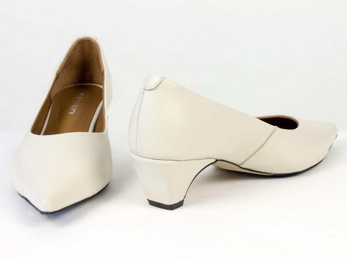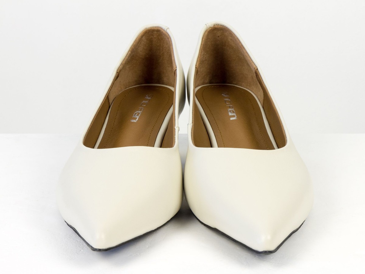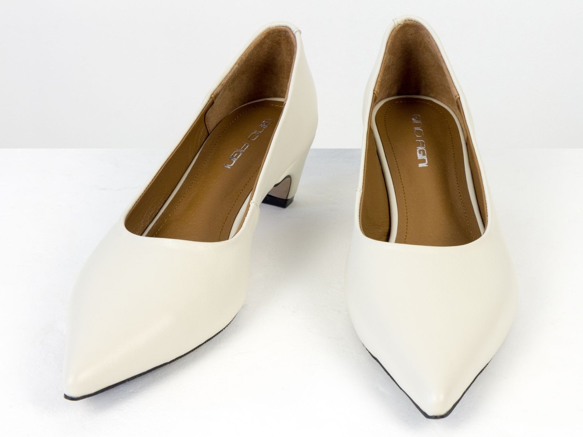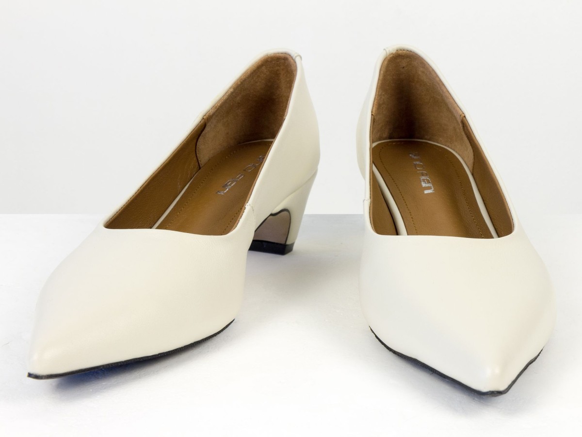 Стильні жіночі човники з натуральної шкіри у благородному молочному відтінку. Елегантний загострений носик додає витонченості, а невисокий каблук-чарочка забезпечує комфорт під час ходьби. Ідеальний вибір для роботи, ділових зустрічей чи вечірніх виходів. Поєднують у собі класичний дизайн та зручність на кожен день.