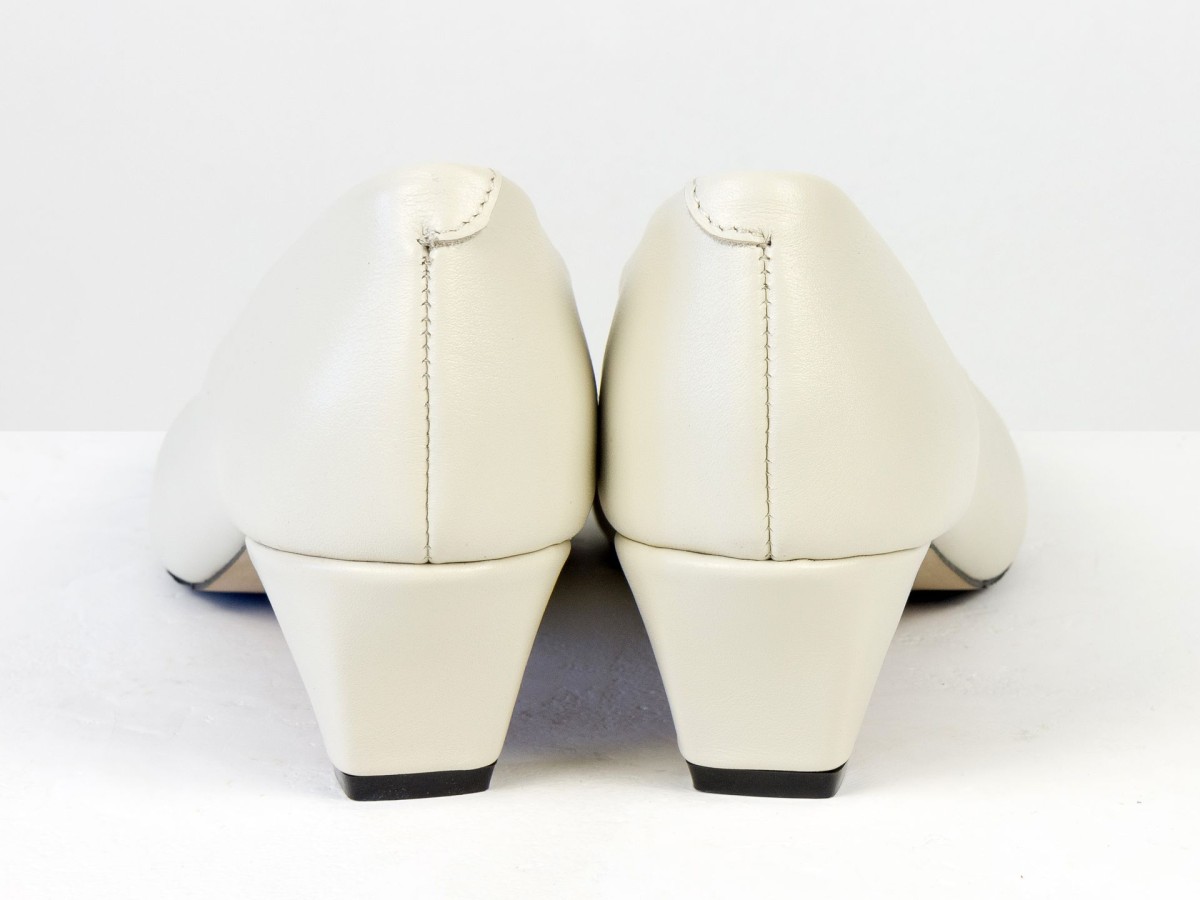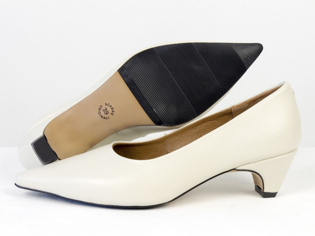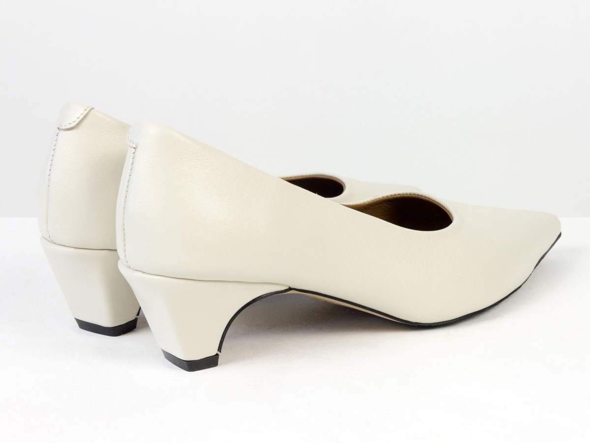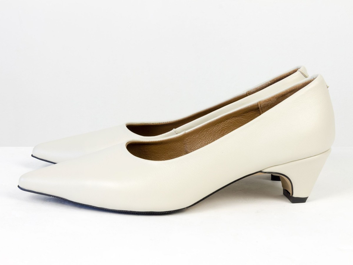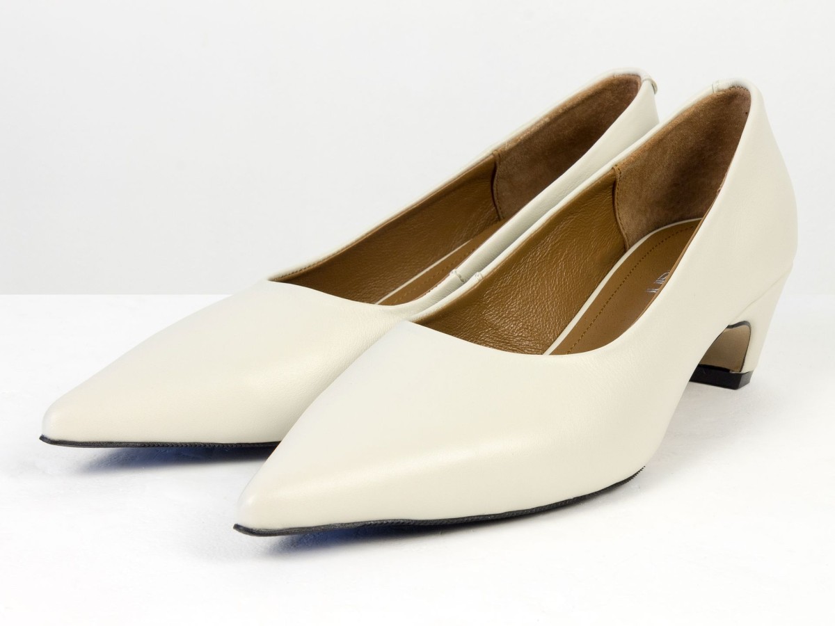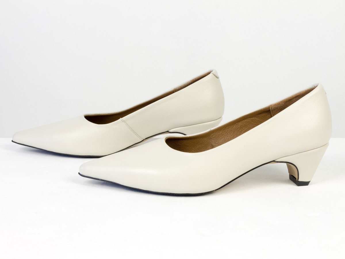 Стильні жіночі човники з натуральної шкіри у благородному молочному відтінку. Елегантний загострений носик додає витонченості, а невисокий каблук-чарочка забезпечує комфорт під час ходьби. Ідеальний вибір для роботи, ділових зустрічей чи вечірніх виходів. Поєднують у собі класичний дизайн та зручність на кожен день.
