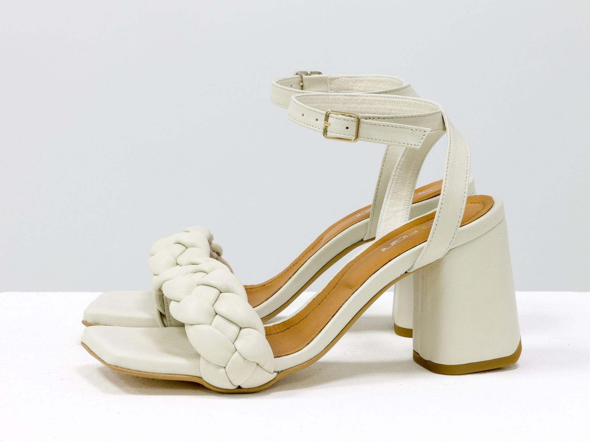 Дизайнерские молочные босоножки "косички" на расклешенном каблуке из натуральной итальянской кожи Gino Figini