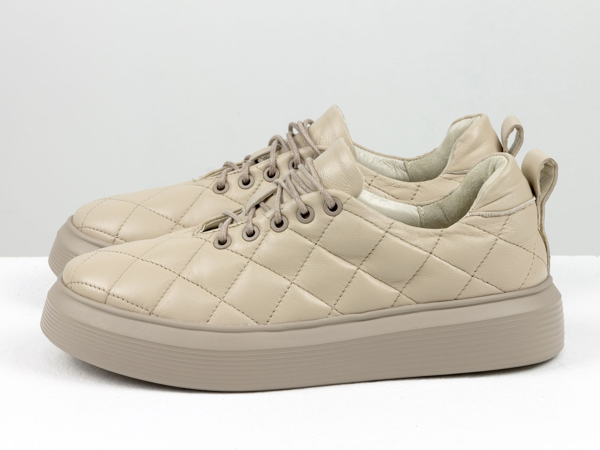 Женские стеганые кеды из натуральной кожи бежевого цвета на облегченной подошве Gino Figini