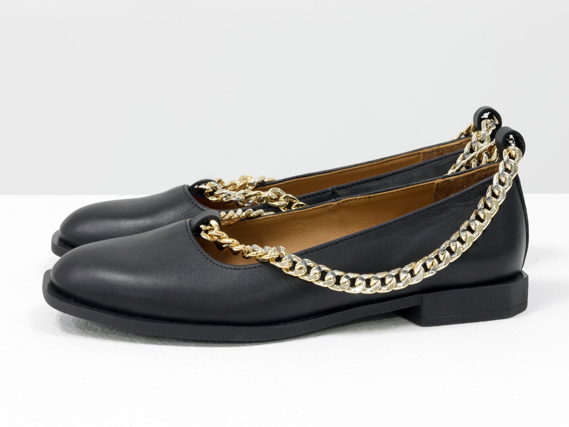 Женские черные туфли на низком каблуке из натуральной кожи с золотой цепочкой Gino Figini