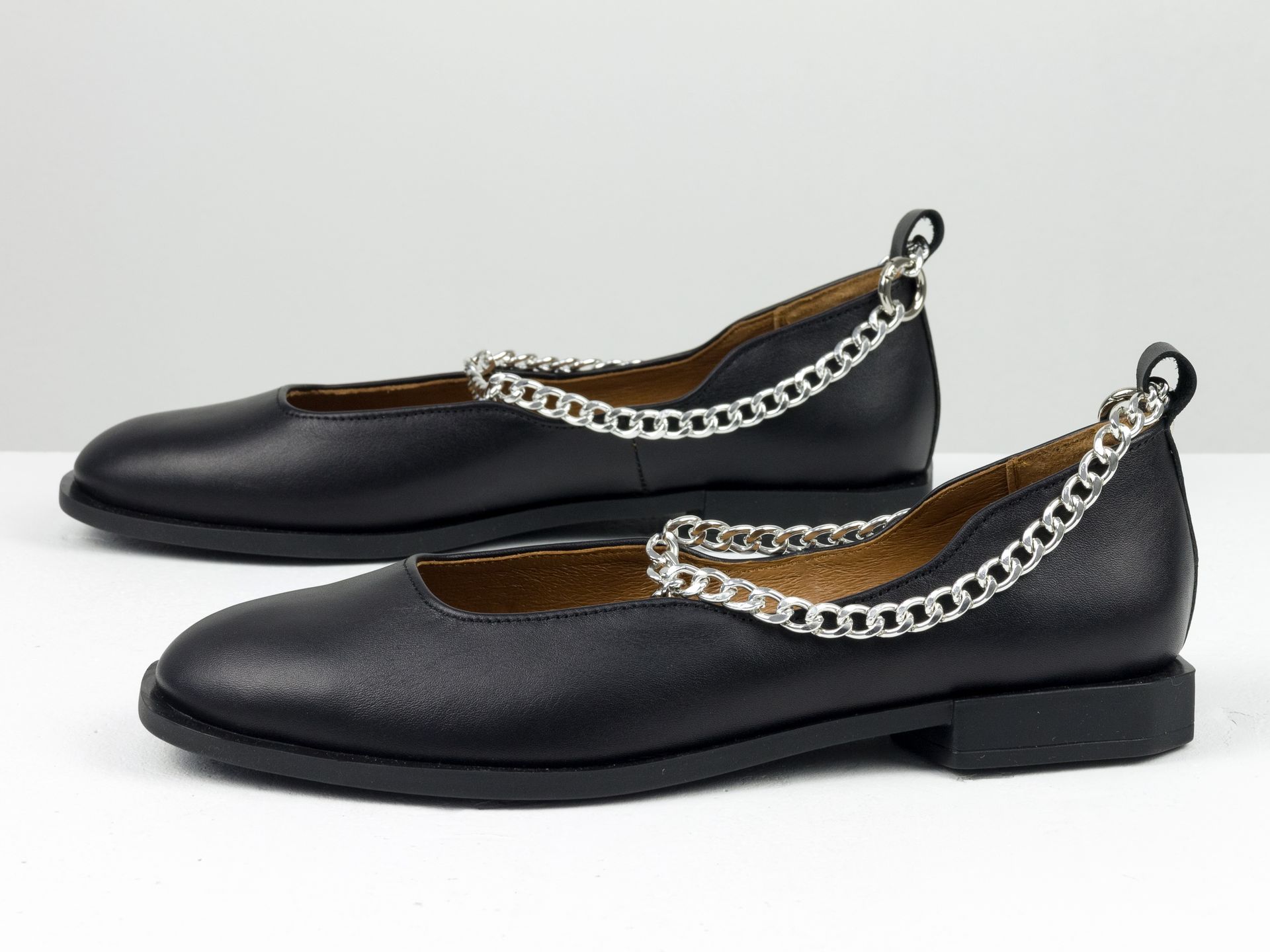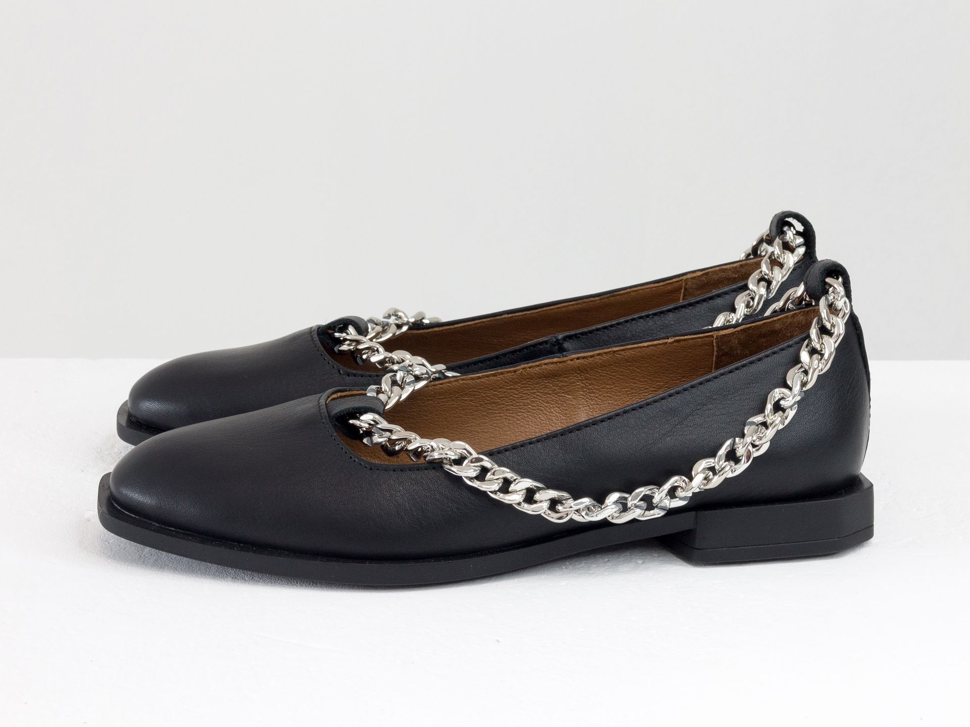 Женские черные туфли на низком ходу из натуральной кожи с серебряной цепочкой Gino Figini