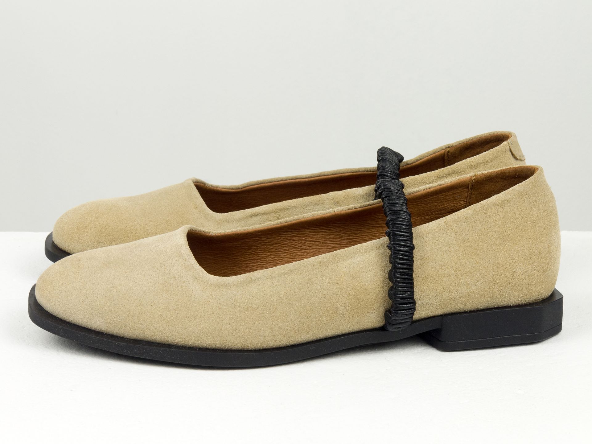 Женские бежевые туфли на низком ходу из натуральной замши с черным кожаным ремешком Gino Figini