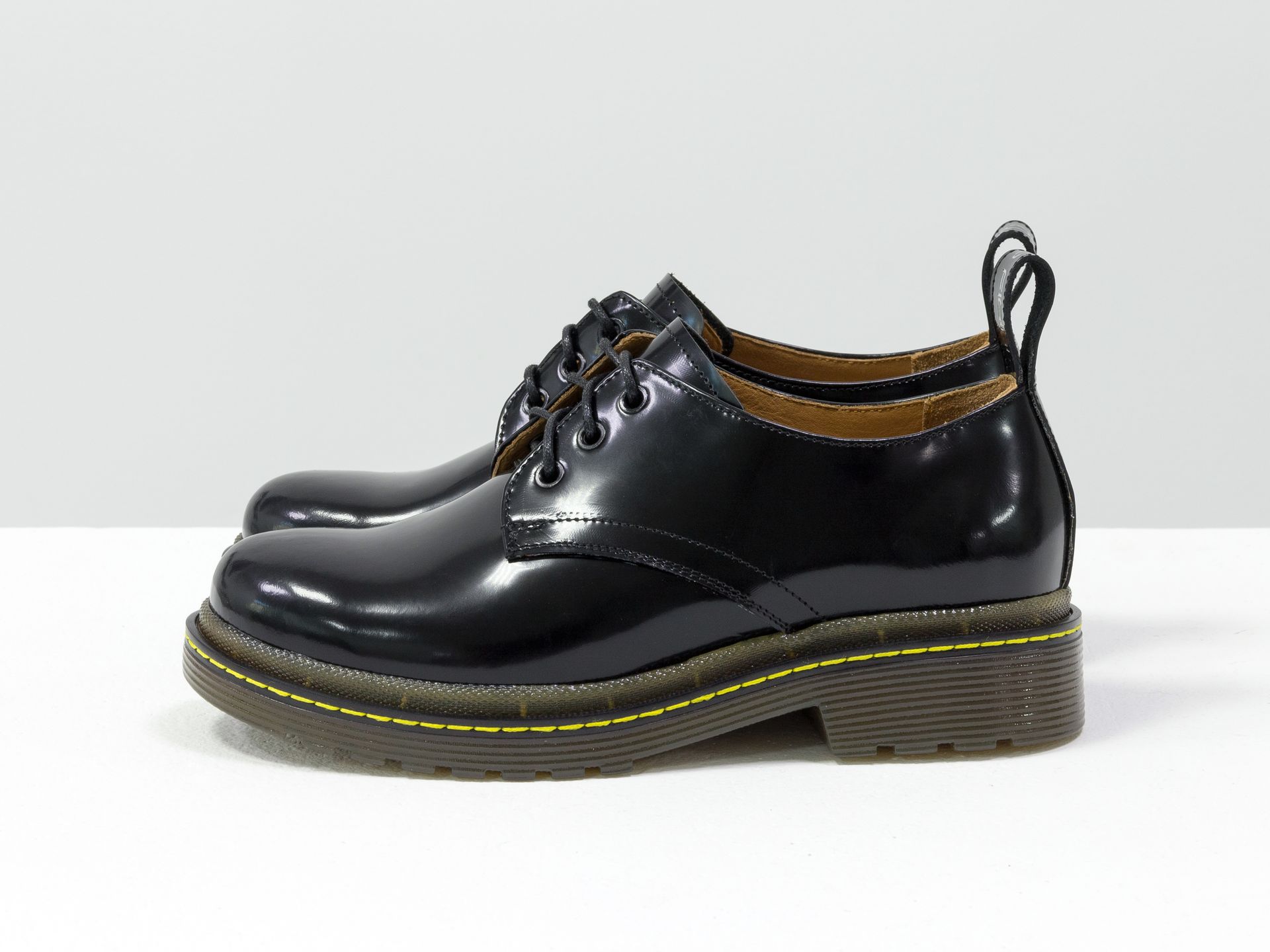 Женские туфли дерби в стиле Dr. Martens из натуральной лаковой кожи черного цвета на утолщенной тракторной подошве с желтой отстрочкой Gino Figini