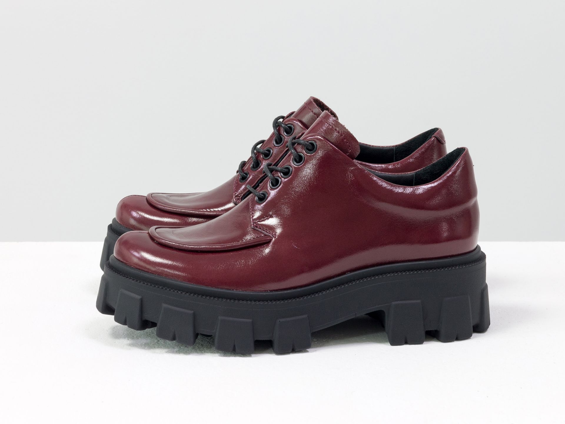 Женские туфли, которые сочетают в себе стиль дерби и лоферов на утолщенной тракторной подошве из натуральной бордовой лаковой кожи Gino Figini