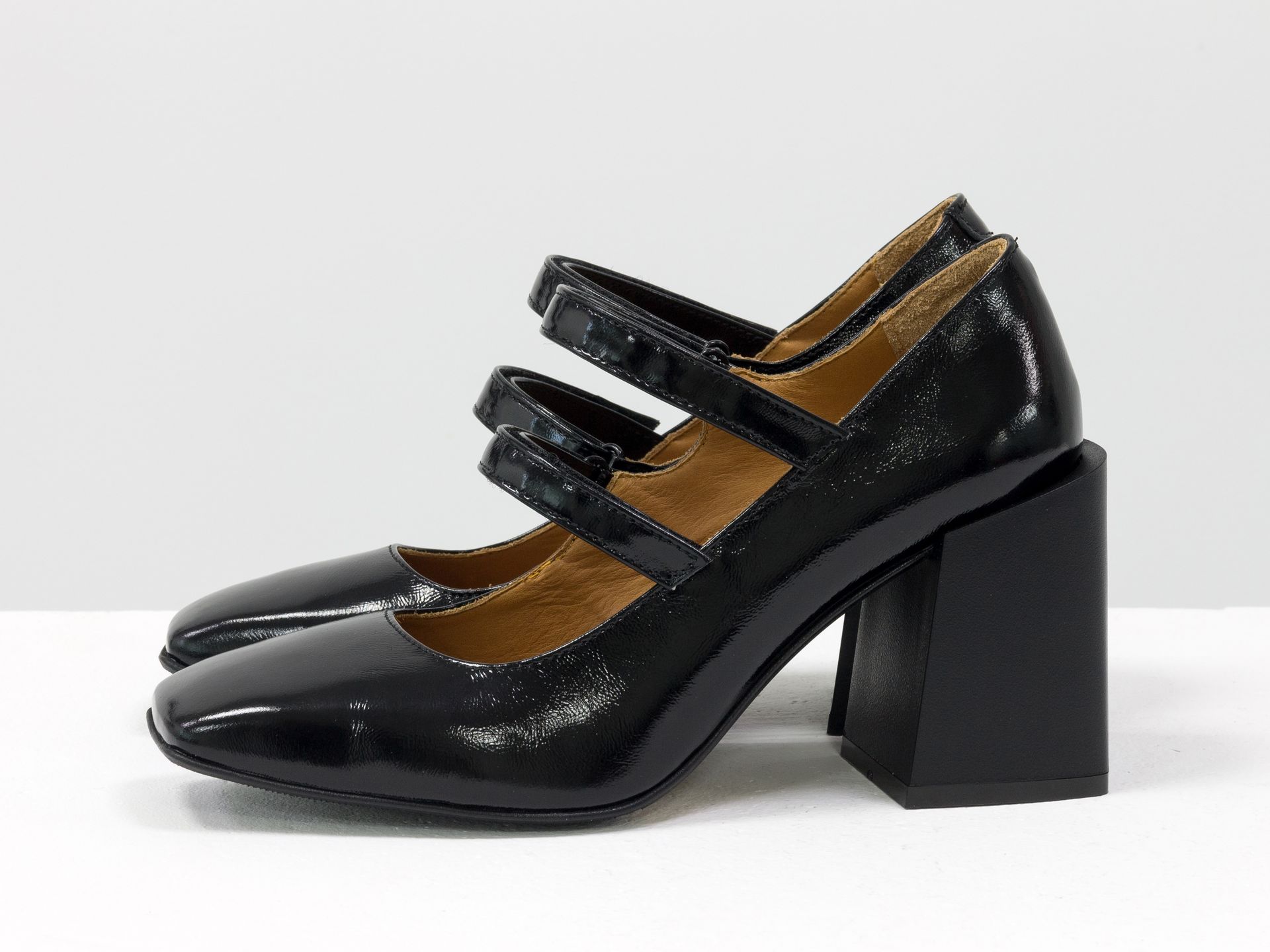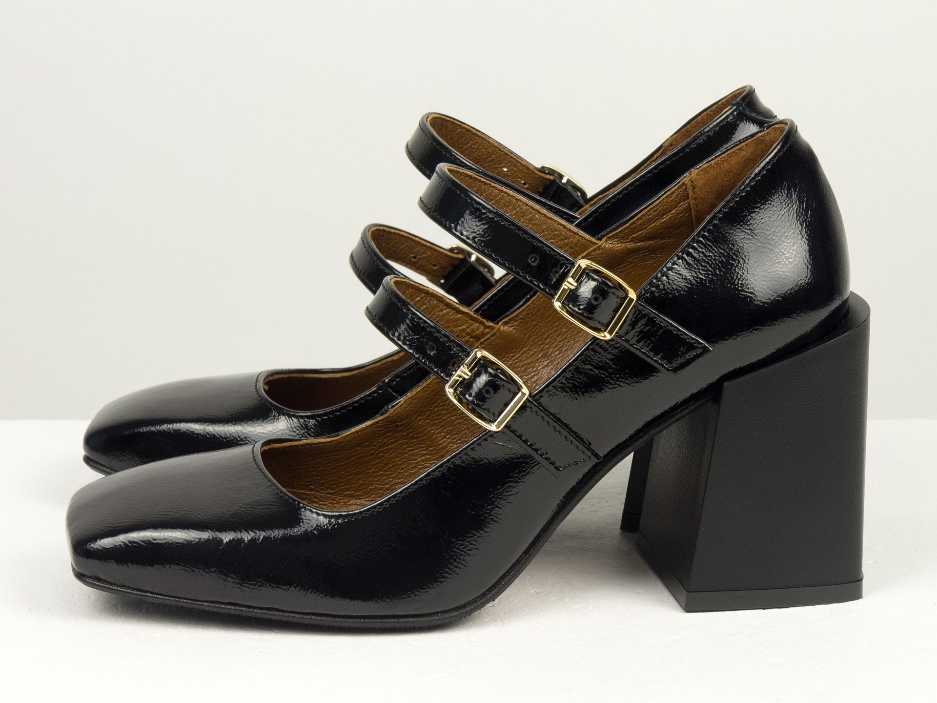 Дизайнерские туфли из натуральной черной лаковой кожи на устойчивом квадратном каблуке с пряжками Gino Figini