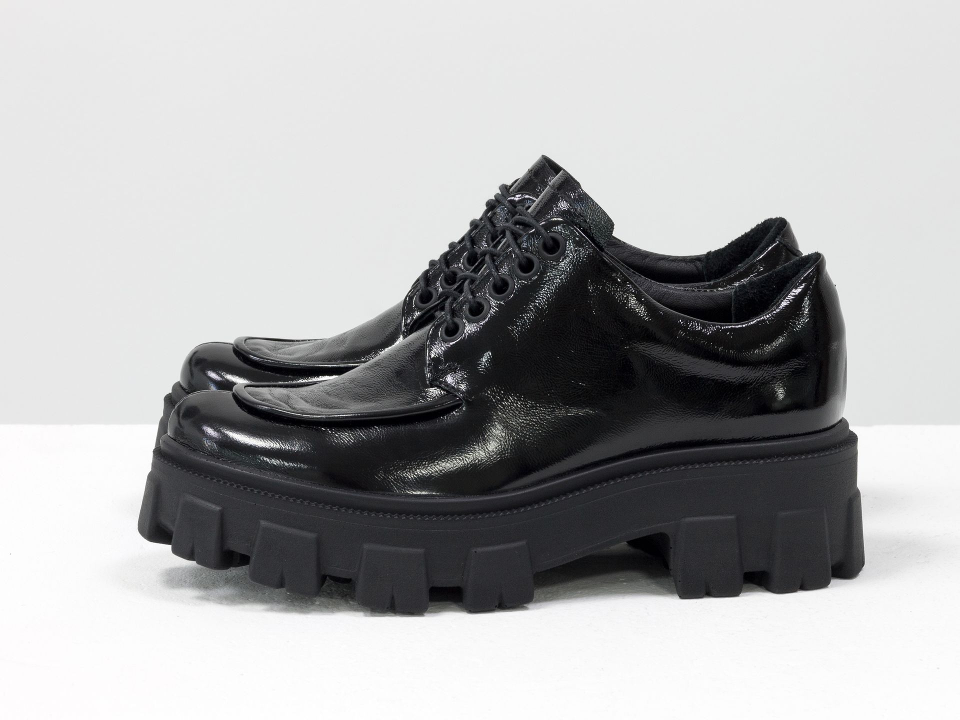 Женские туфли, которые сочетают в себе стиль дерби и лоферов на утолщенной тракторной подошве из натуральной лаковой кожи Gino Figini