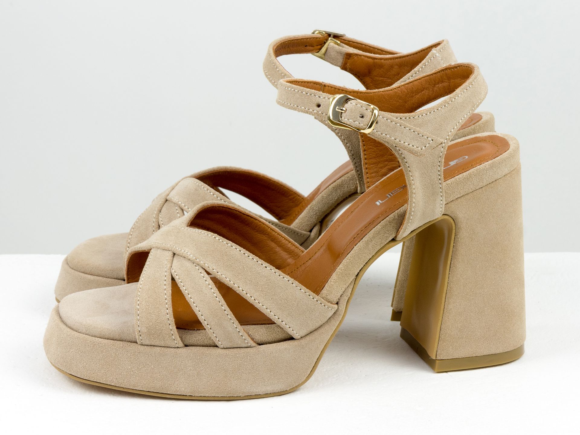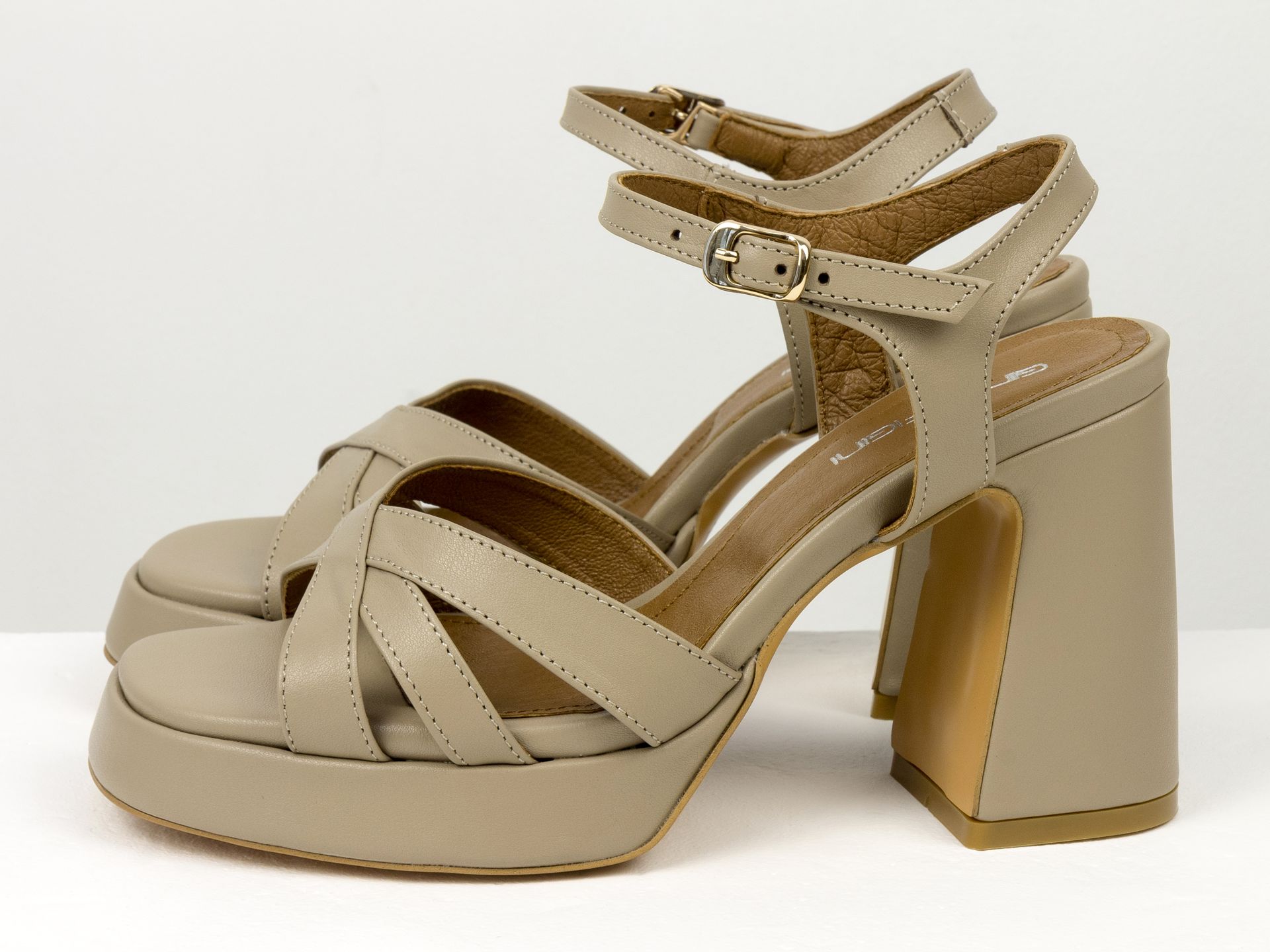 Дизайнерские босоножки на обтяжном каблуке из натуральной итальянской кожи бежевого цвета Gino Figini