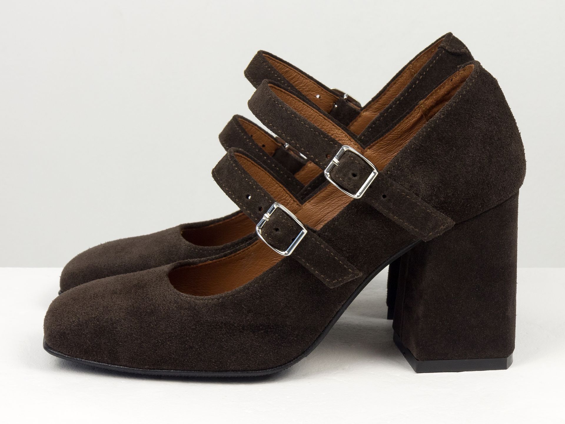 Дизайнерские туфли из натуральной коричневой замши на обтяжном квадратном каблуке с пряжками Gino Figini