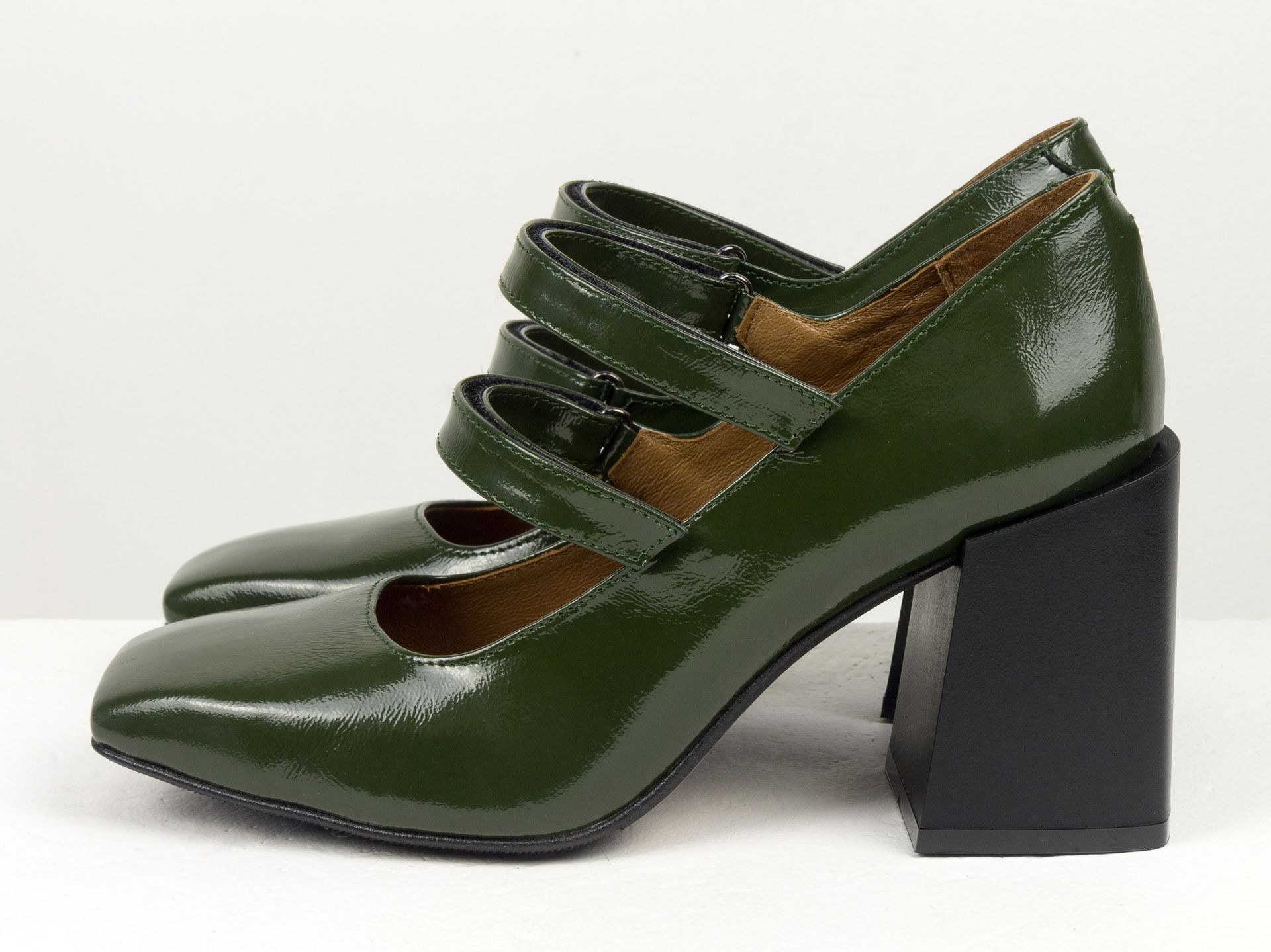 Дизайнерские туфли из натуральной зеленой лаковой кожи на устойчивом квадратном каблуке с липучками Gino Figini