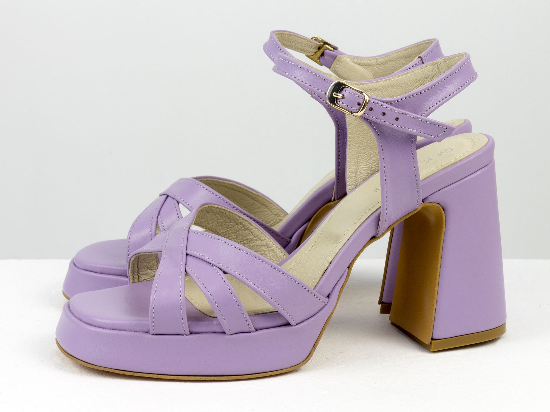 Дизайнерские босоножки на обтяжном каблуке из натуральной итальянской кожи лавандового цвета Gino Figini