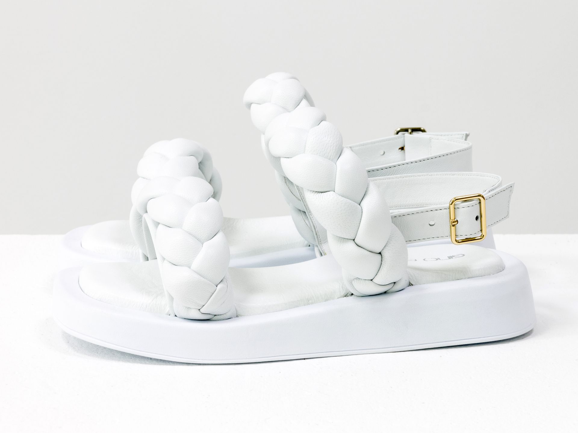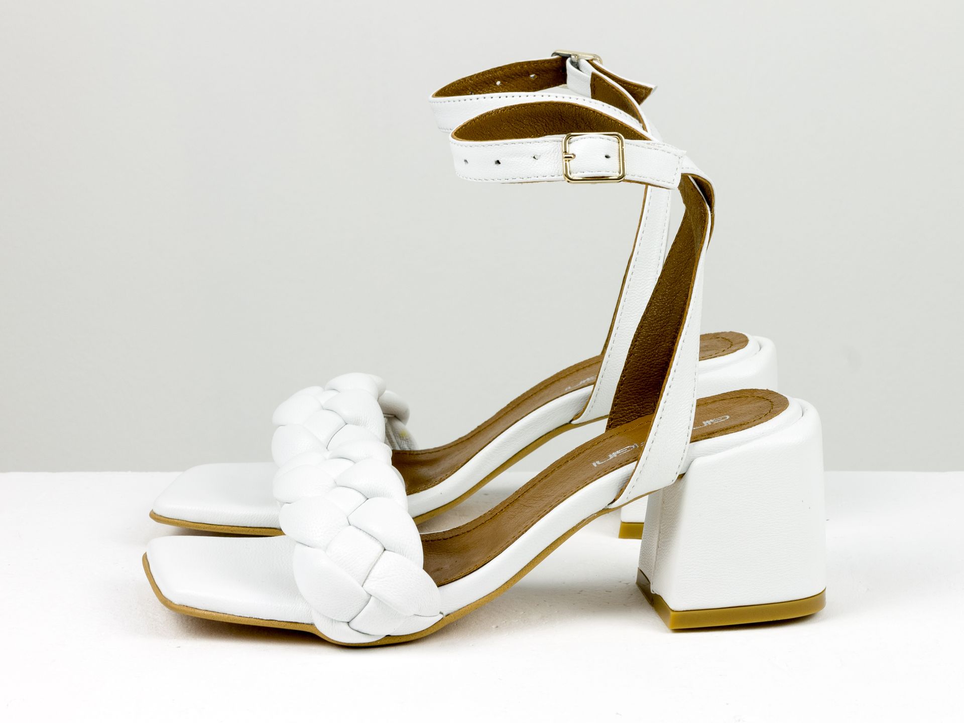 Дизайнерские белые босоножки "косички" на расклешенном каблуке из натуральной итальянской кожи Gino Figini