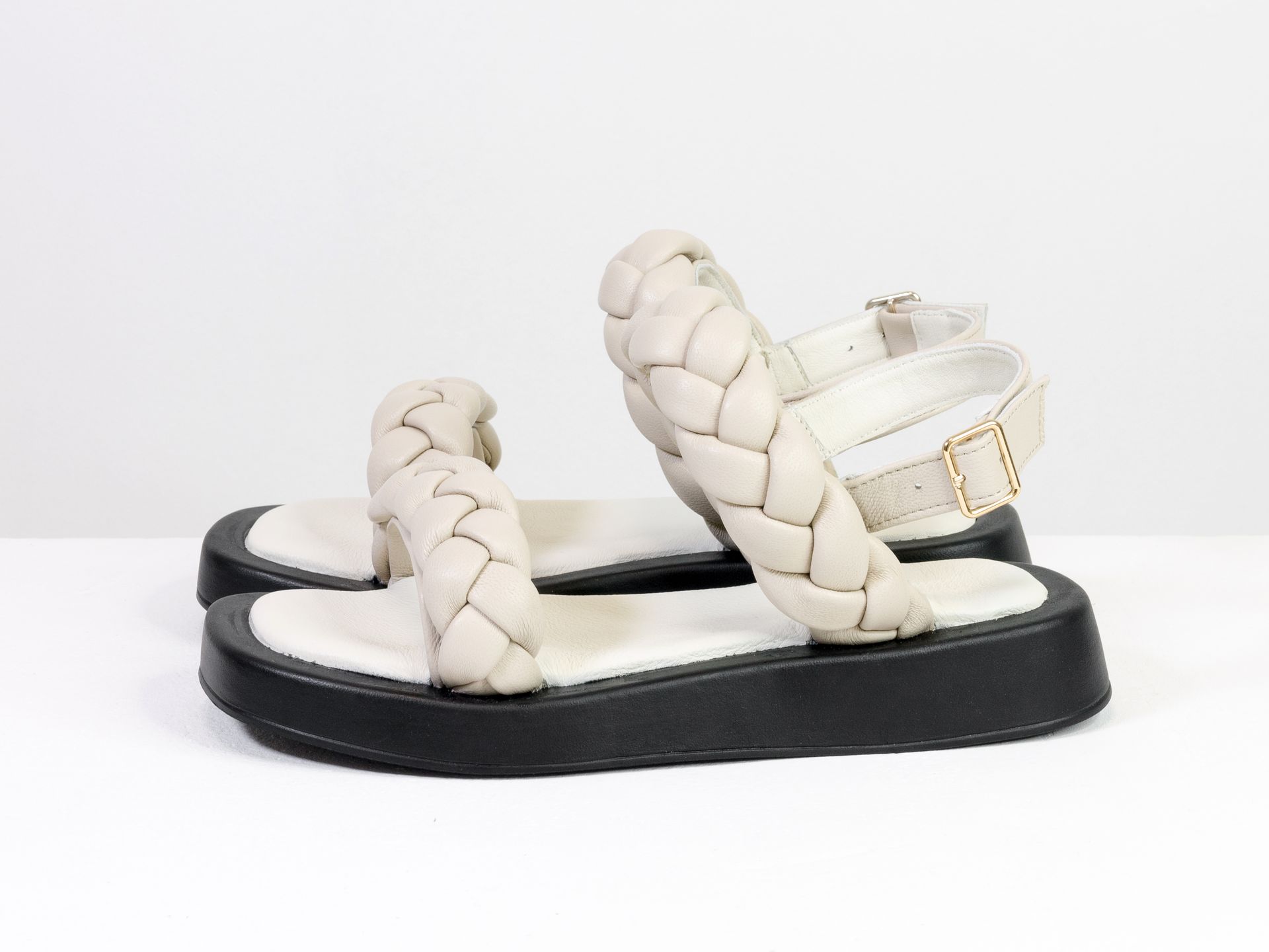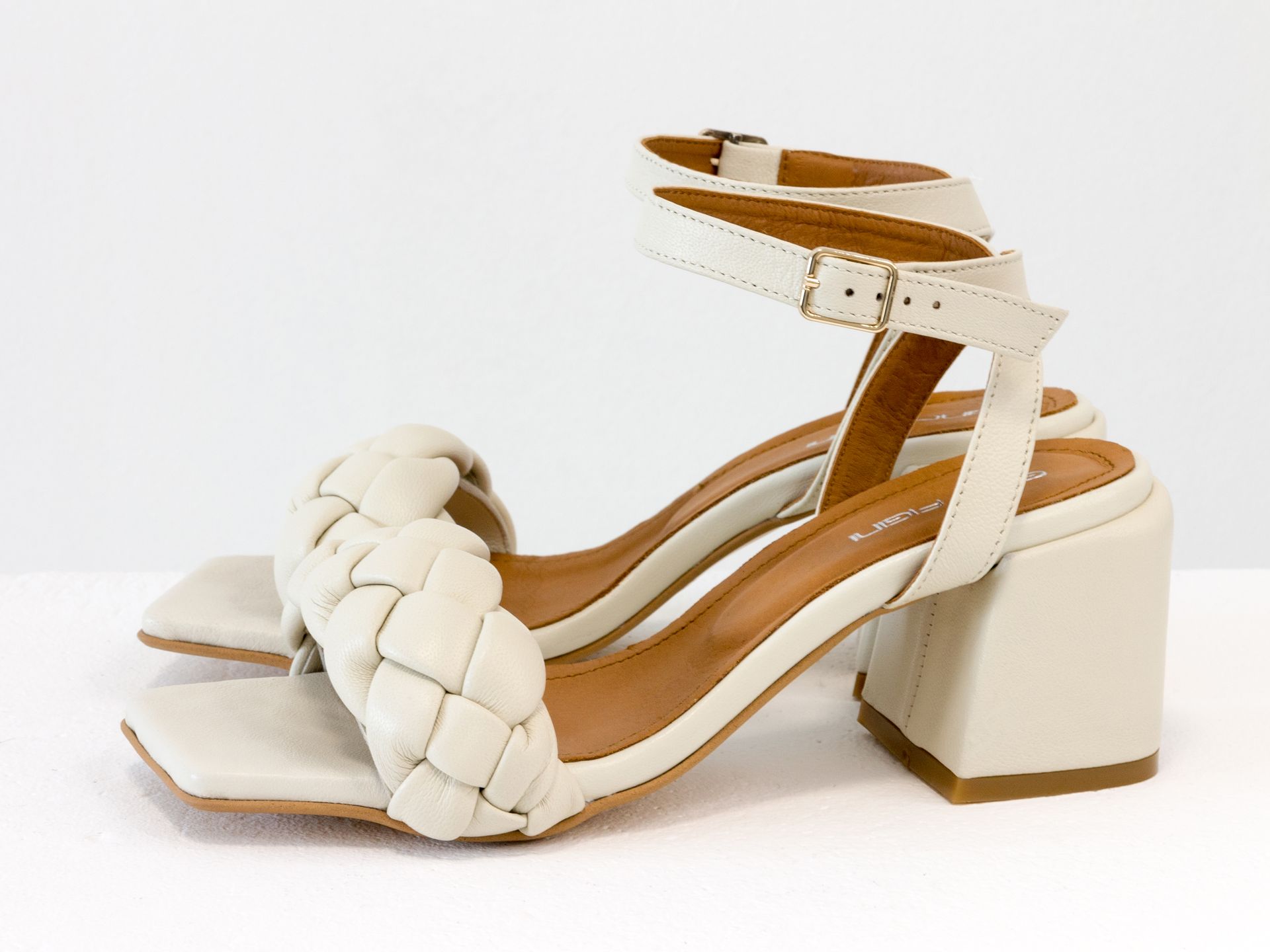 Дизайнерские молочные босоножки «косички» на каблуке из натуральной итальянской кожи Gino Figini