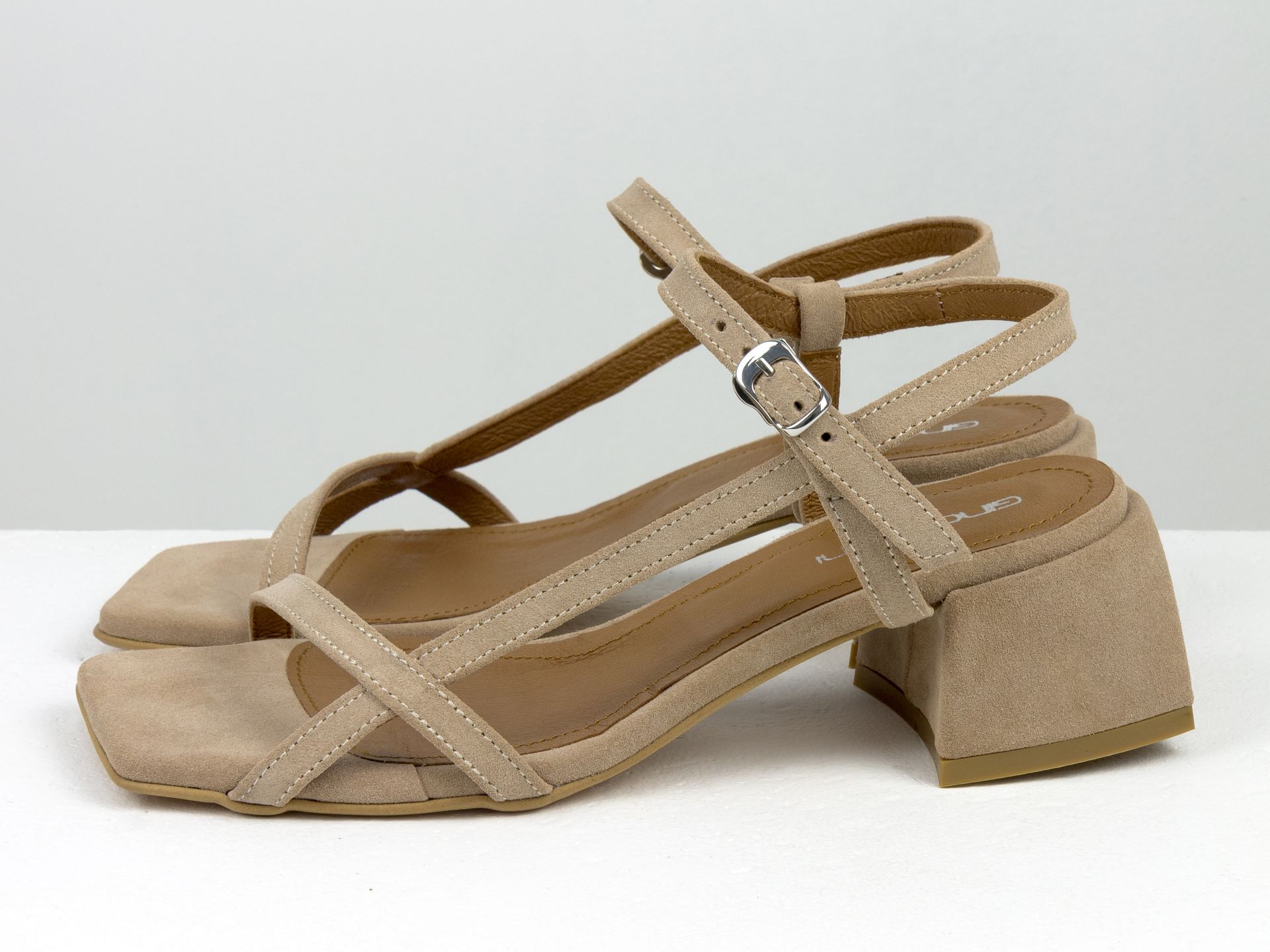 Дизайнерские бежевые босоножки на каблуке из натуральной итальянской замши Gino Figini