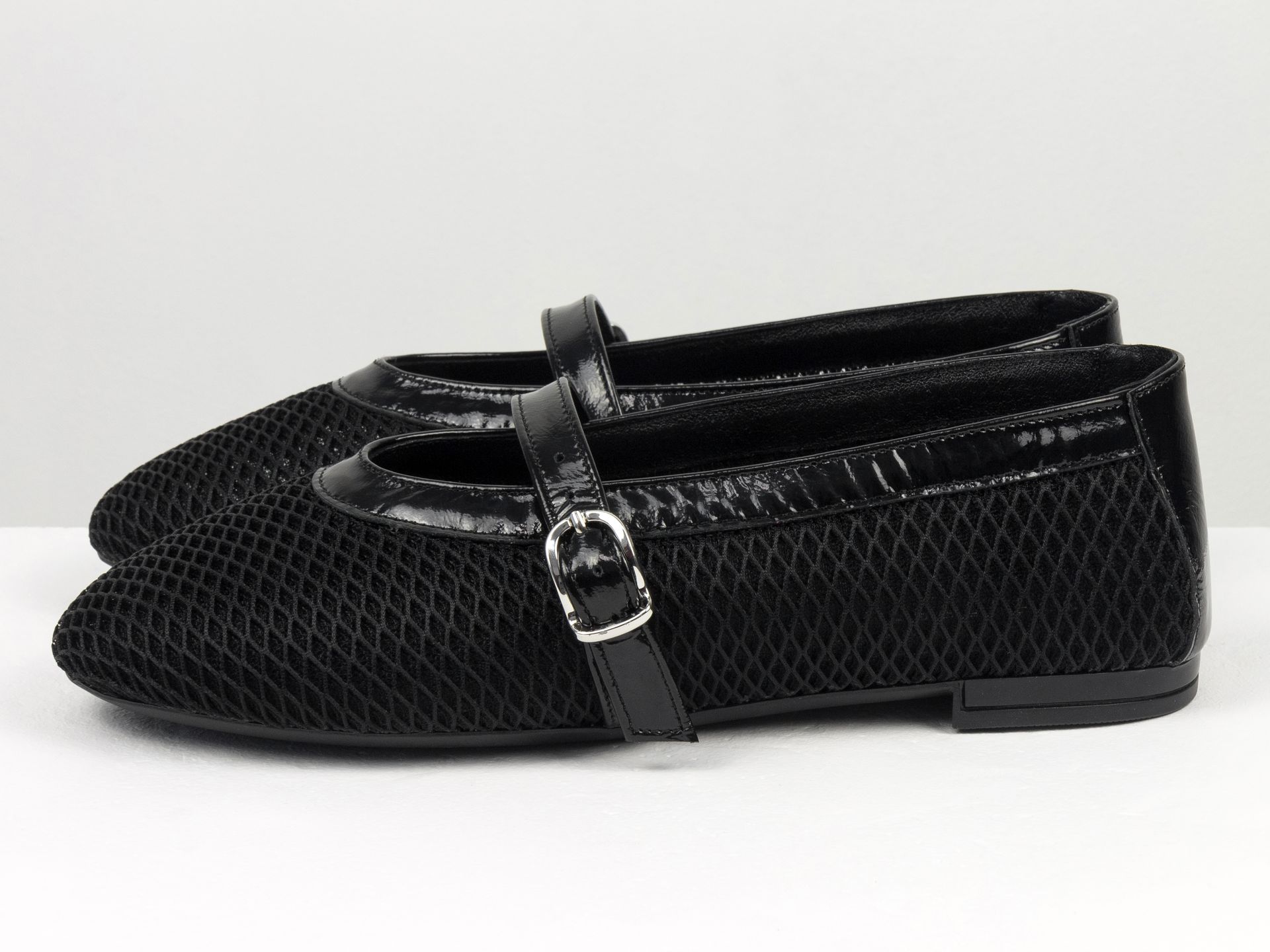 Женские балетки на низком ходу из натуральной лаковой кожи черного цвета с черной сеткой Gino Figni