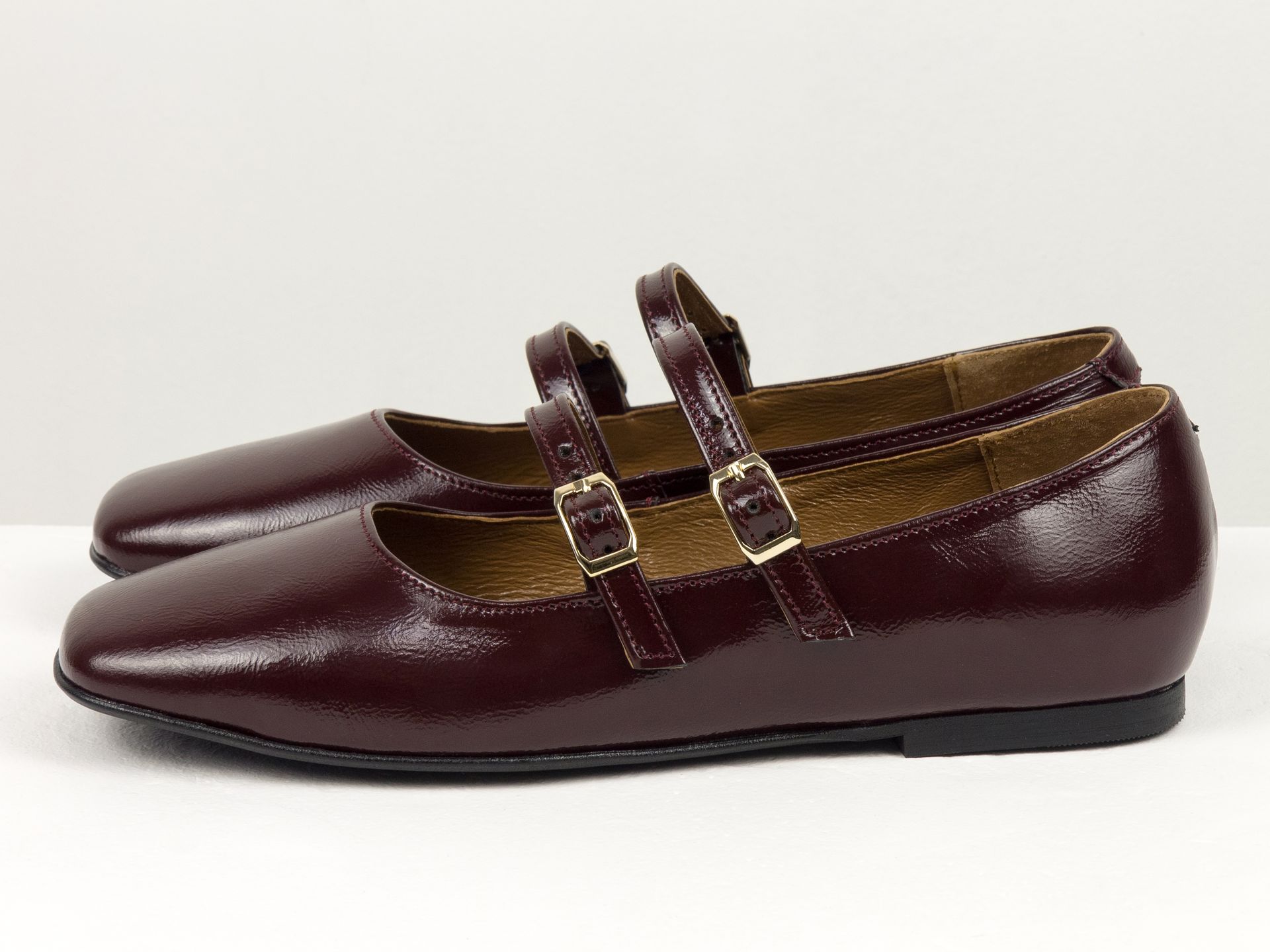 Женские балетки Мэри Джейн на низком каблуке из натуральной кожи бордового цвета с двумя ремешками Gino Figini
