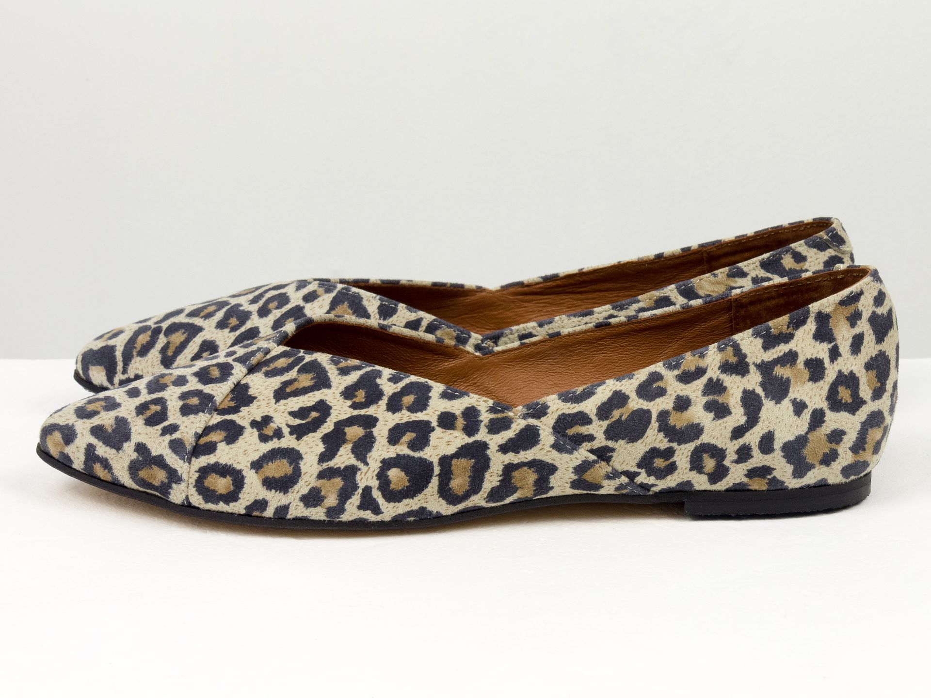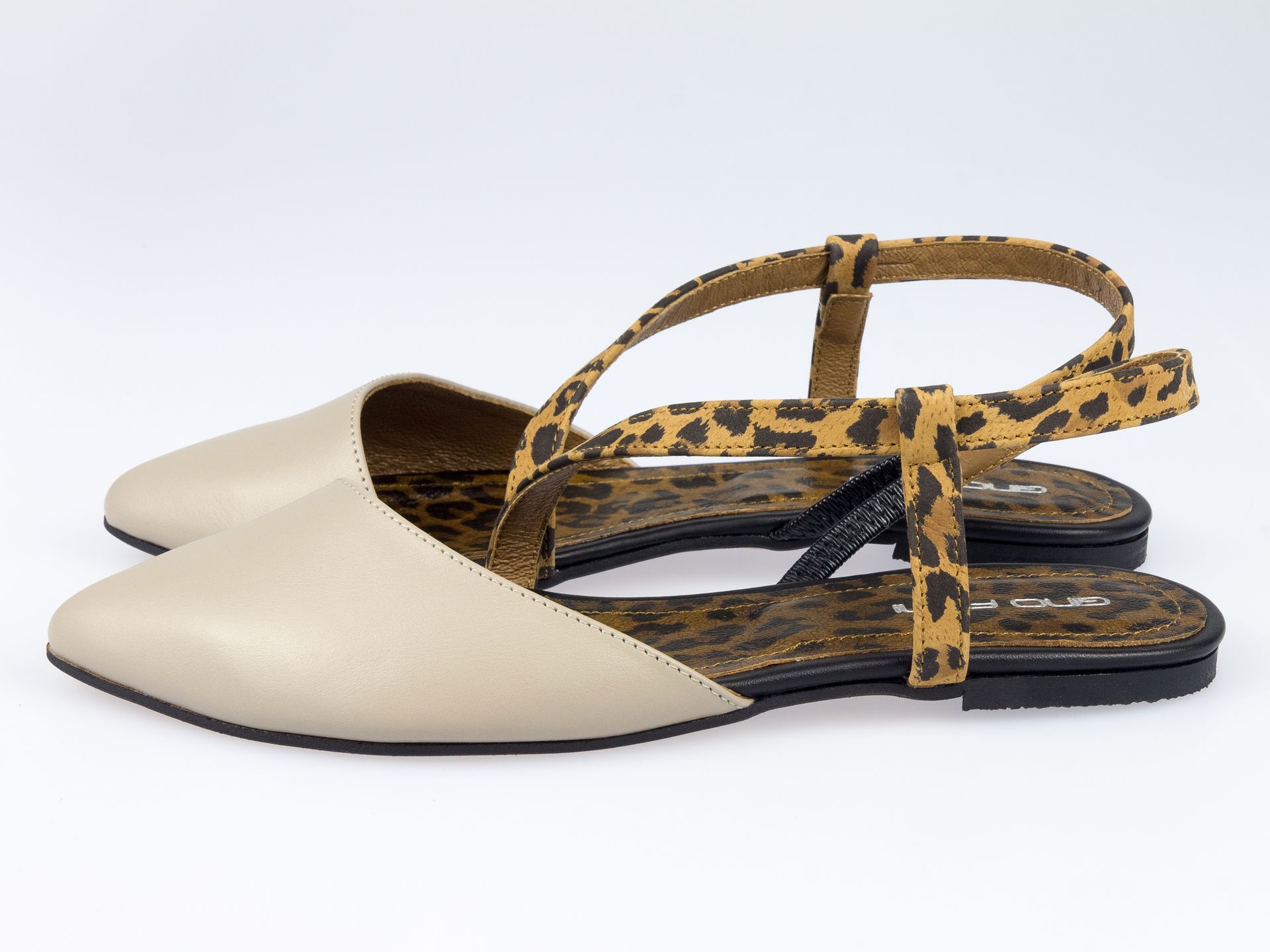 Женские балетки на низком ходу из натуральной кожи бежевого цвета с открытой пяткой с леопардовыми ремешками Gino Figini