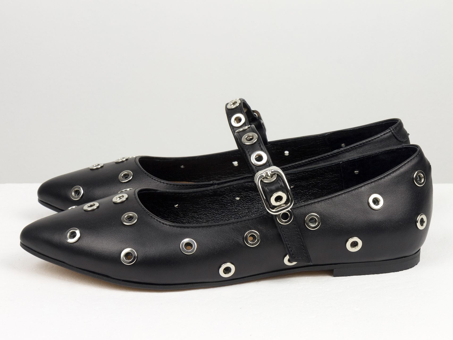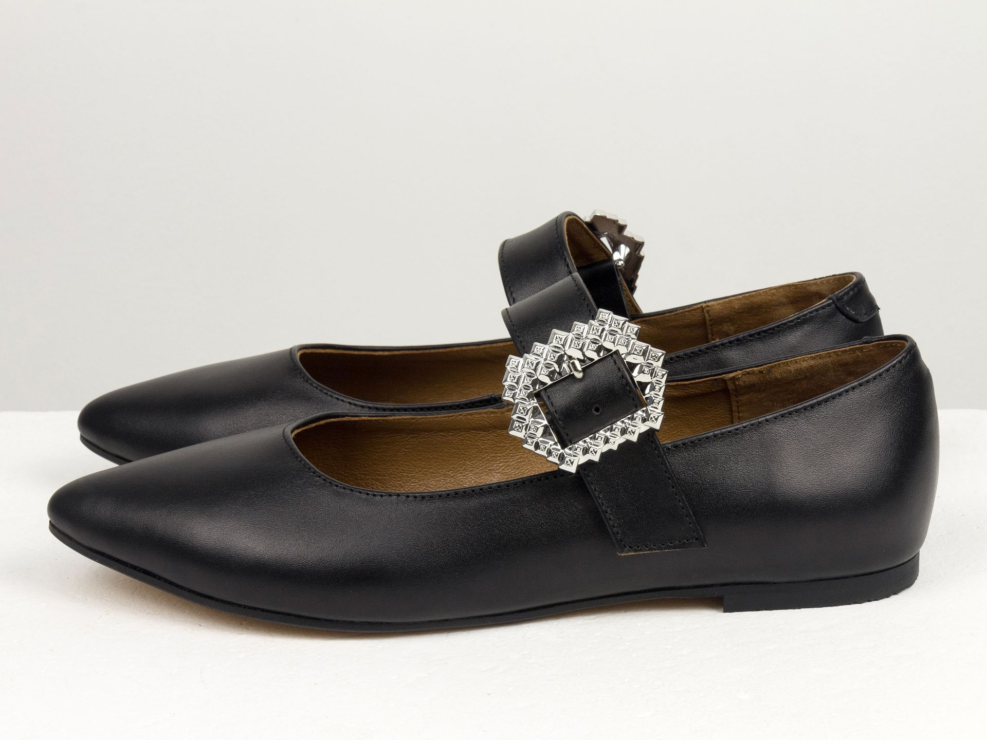Женские туфли на низком ходу из натуральной кожи черного цвета с серебряной пряжкой Gino Figini