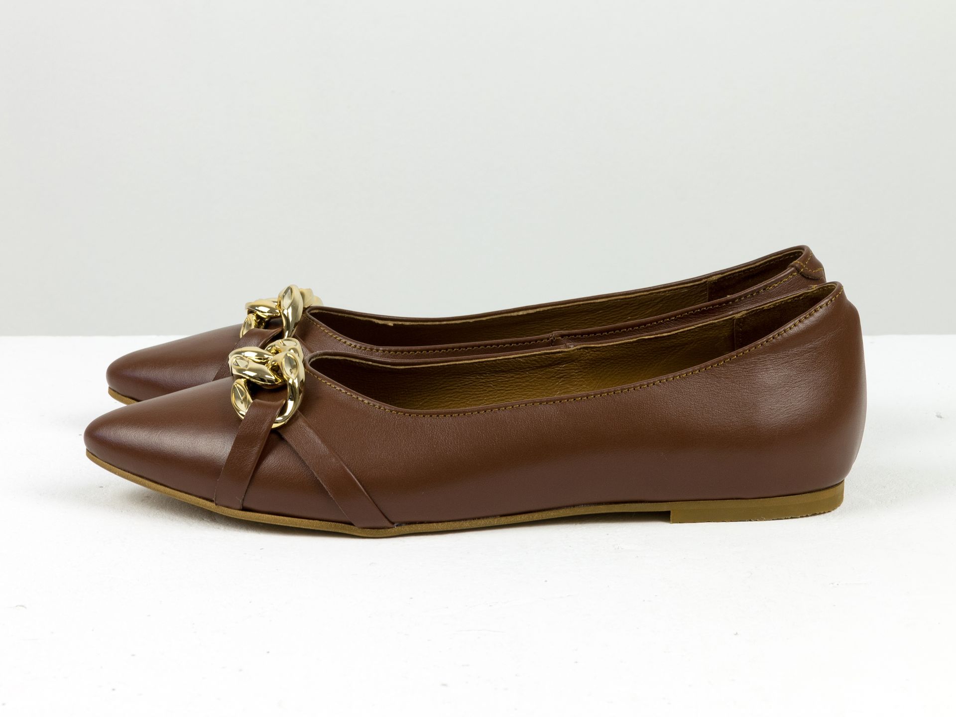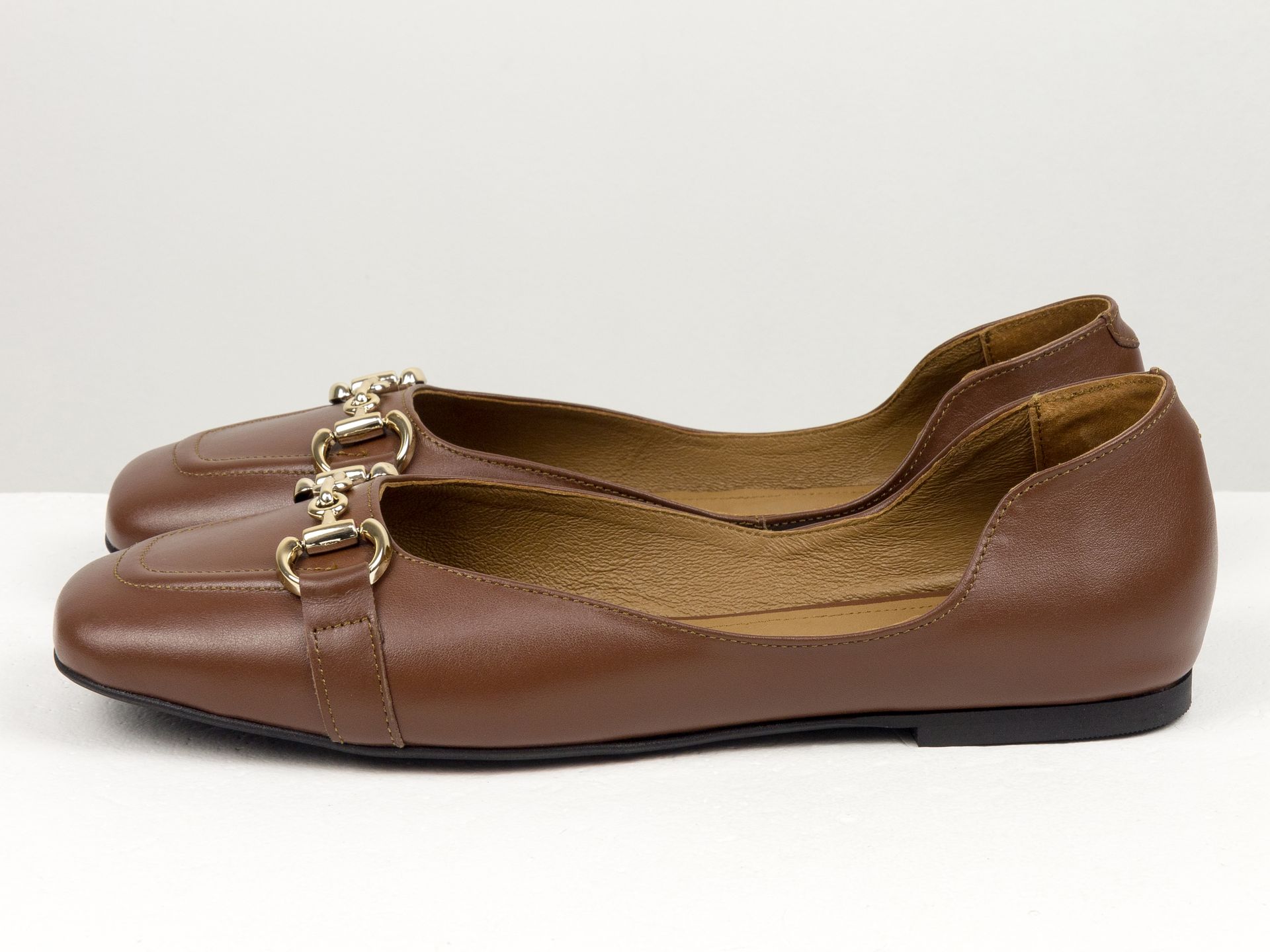 Женские туфли на низком ходу из натуральной коричневой кожи с золотой фурнитурой Gino Figini