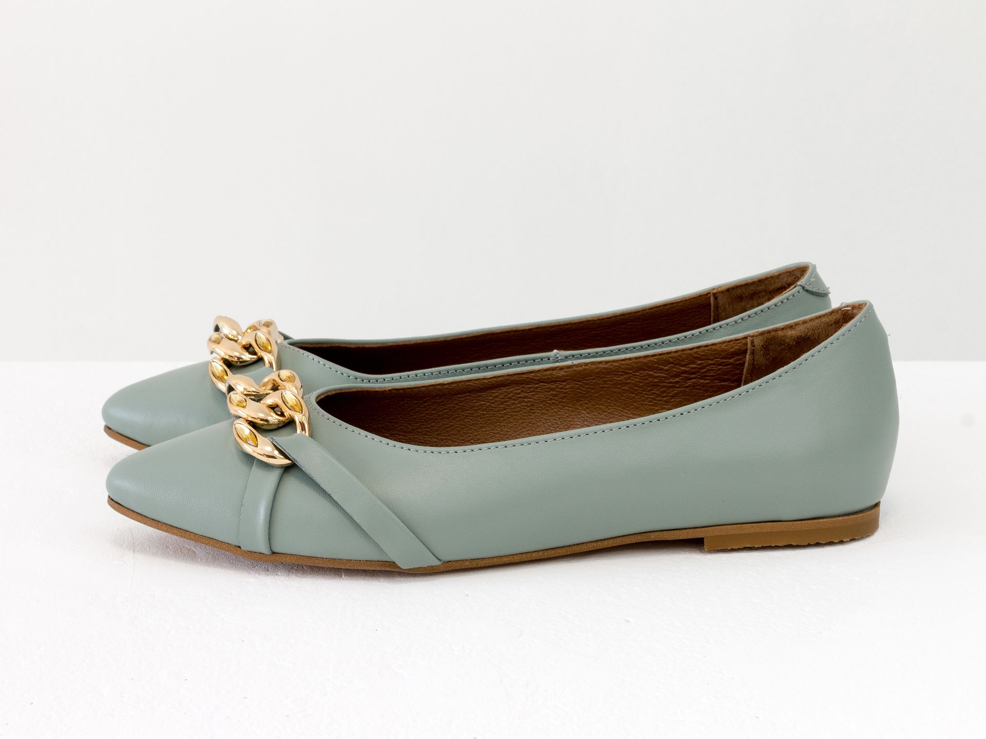Женские туфли на низком ходу из натуральной зеленой кожи флотар с золотой фурнитурой Gino Figini
