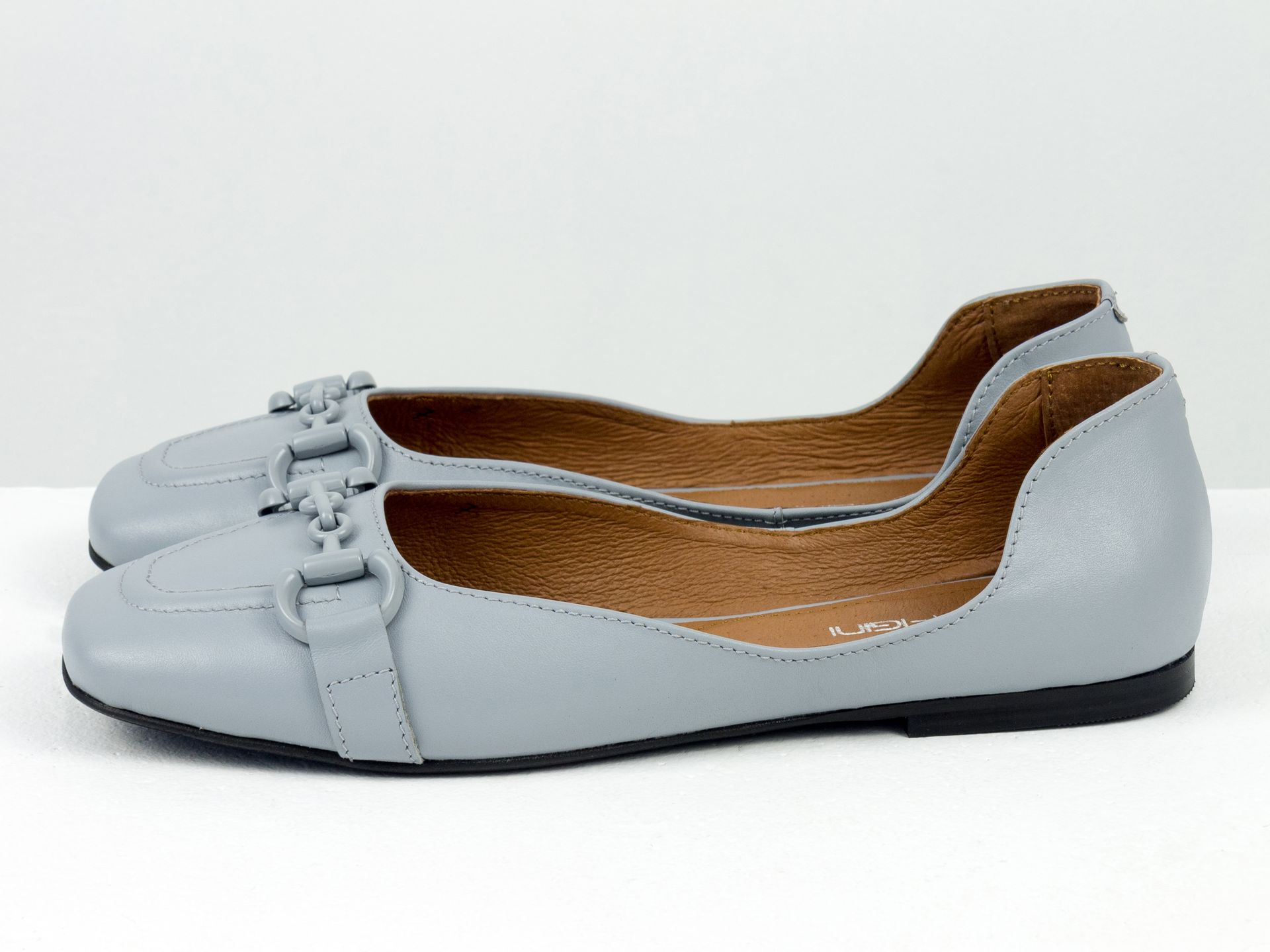 Женские туфли на низком ходу из натуральной серо-голубой кожи с золотой фурнитурой Gino Figini