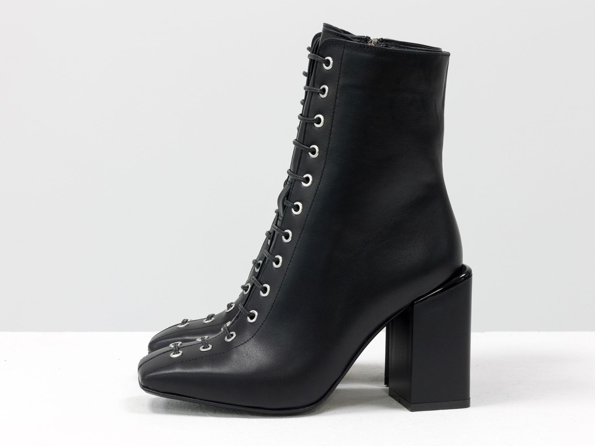 Дизайнерские базовые ботильоны на шнуровке черного цвета из натуральной кожи на высоком квадратном каблуке Gino Figini