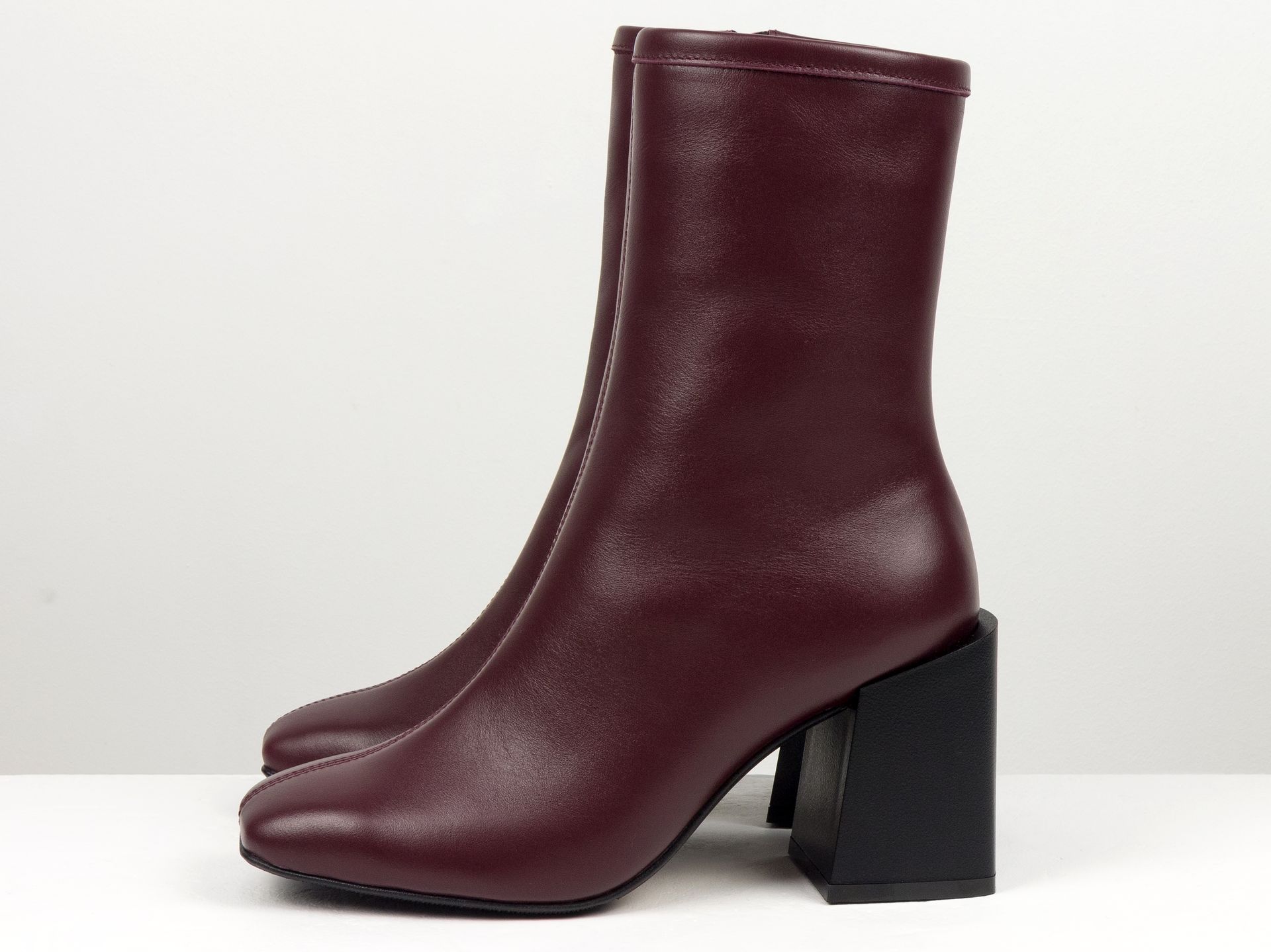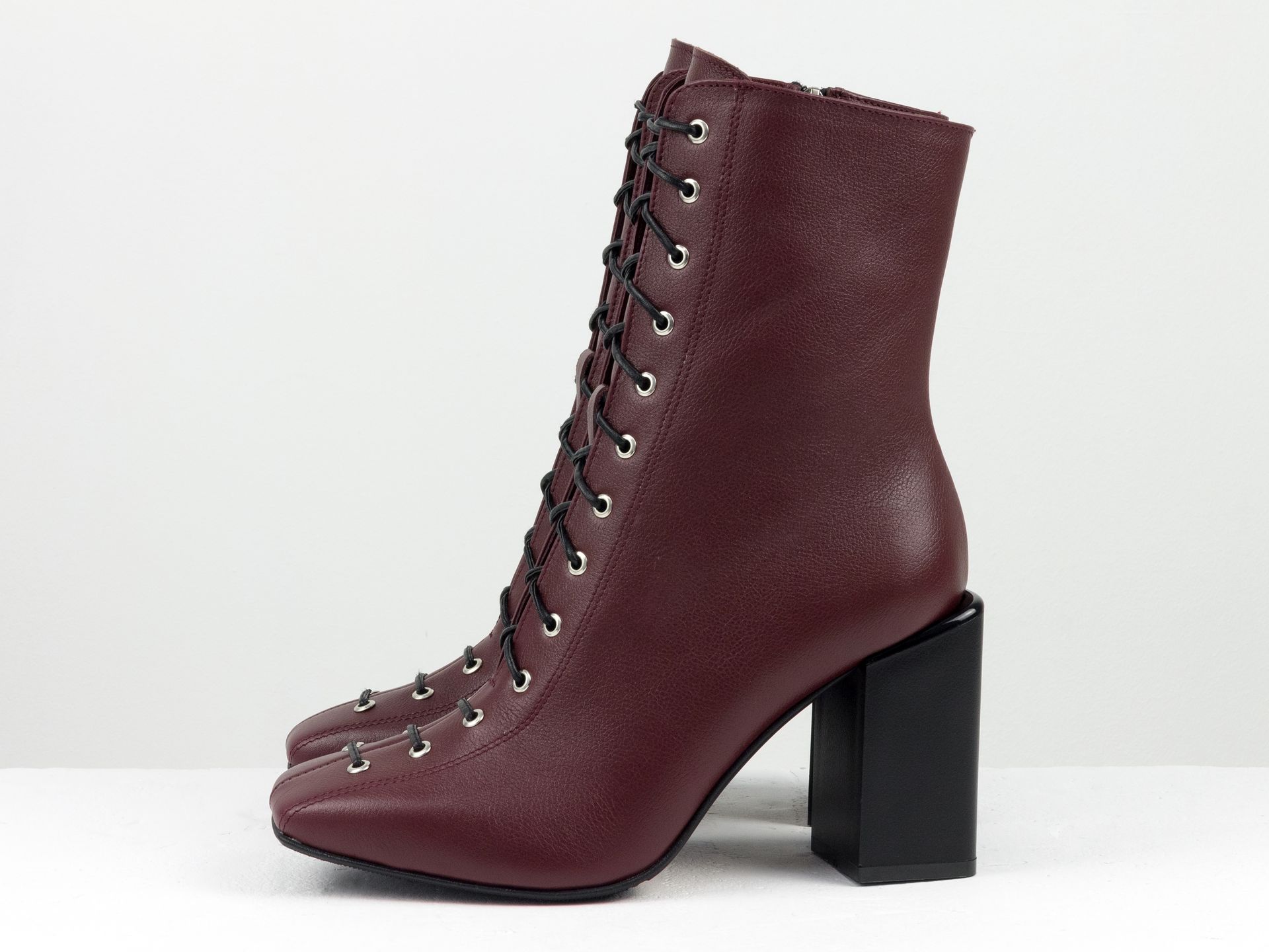Дизайнерские базовые ботильоны на шнуровке из натуральной кожи флотар бордового цвета на высоком квадратном каблуке Gino Figini