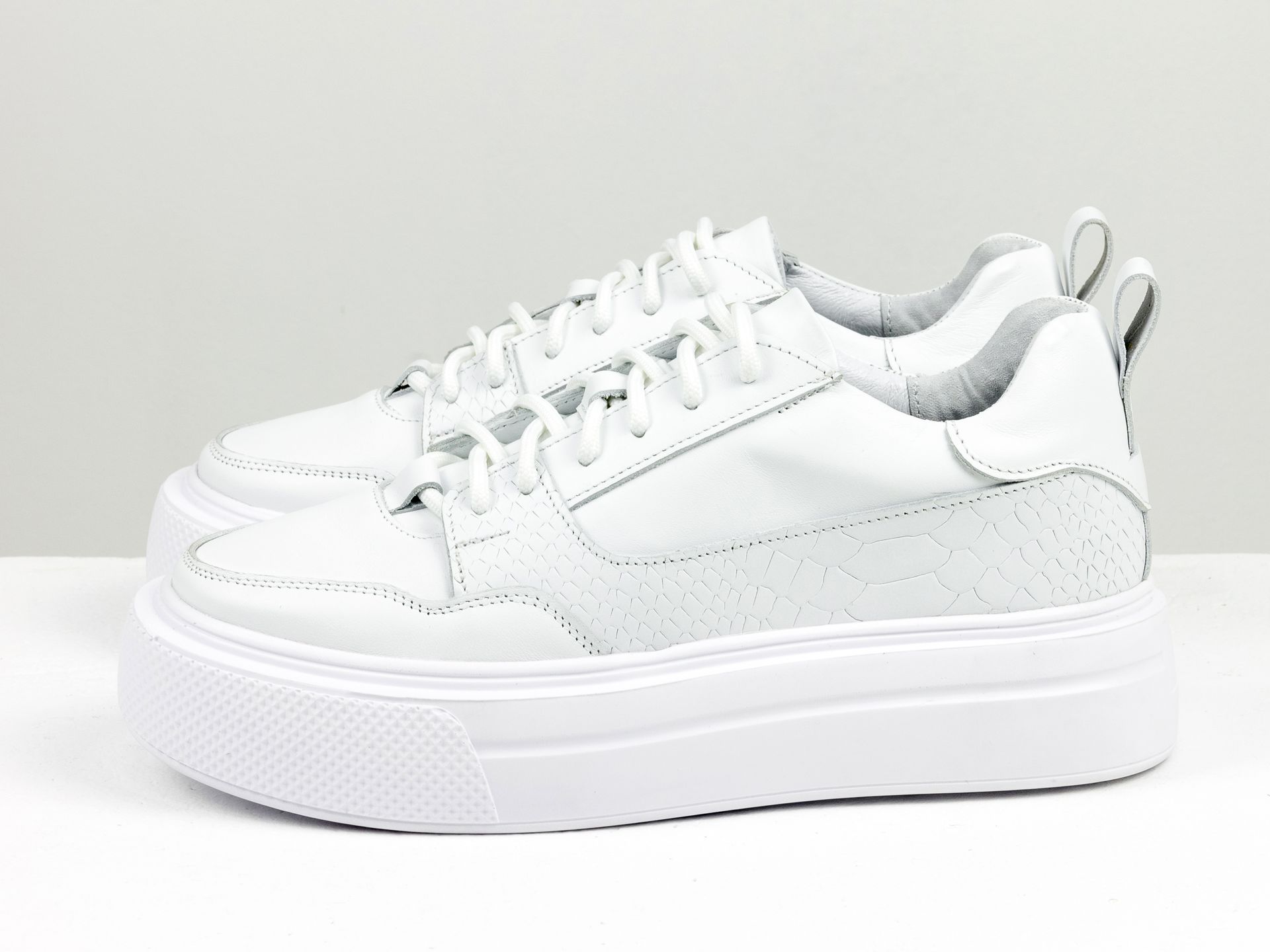 Женские белые кеды из натуральной гладкой кожи в сочетании белой текстурированной кожи "питон" на утолщенной подошве Gino Figini