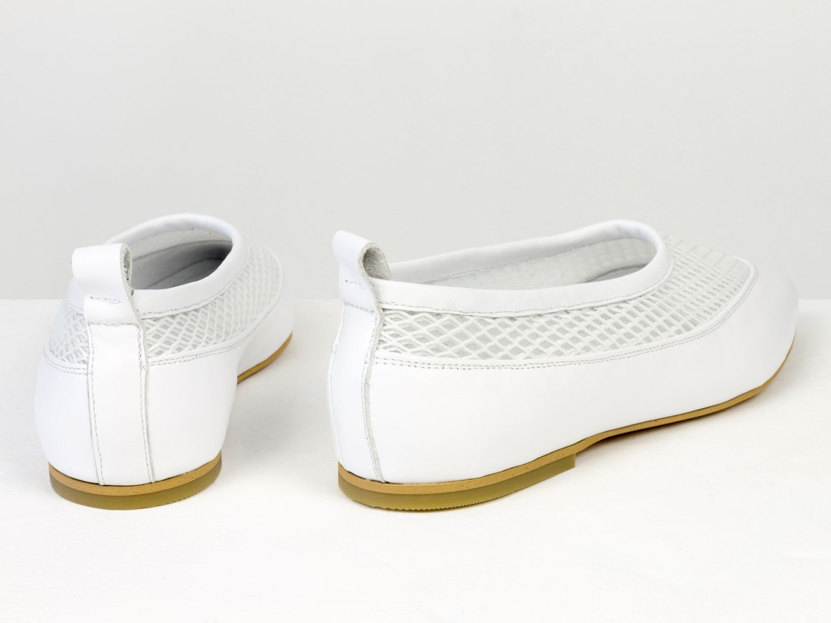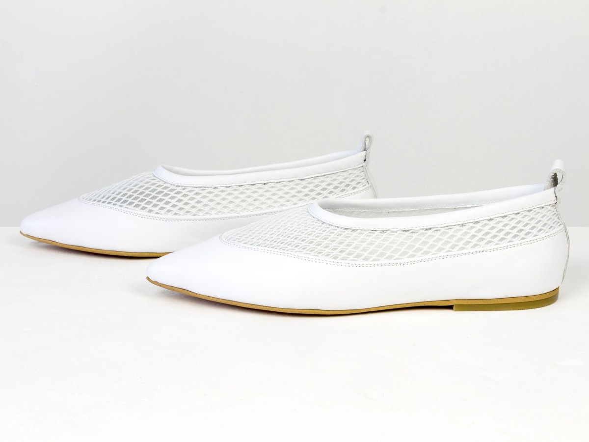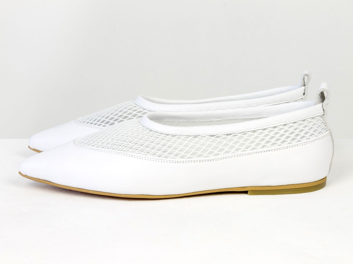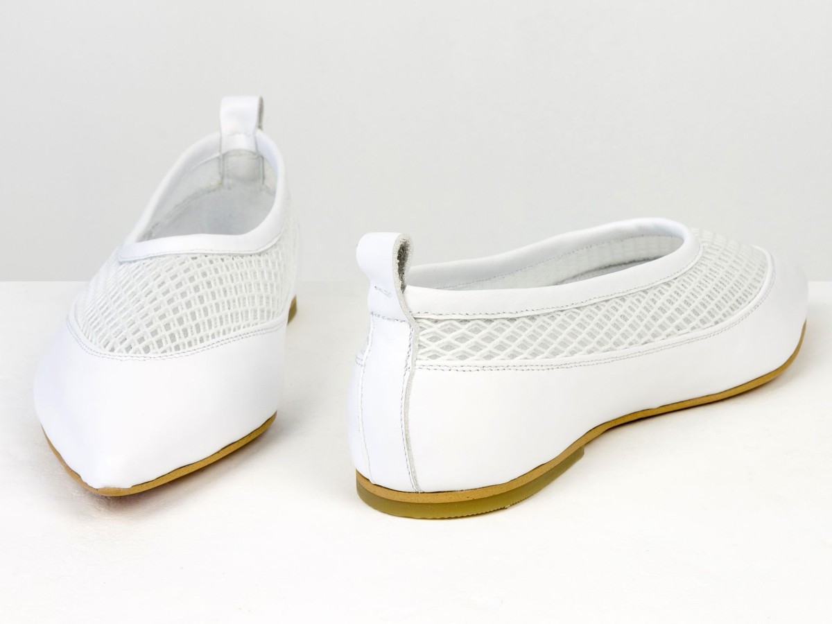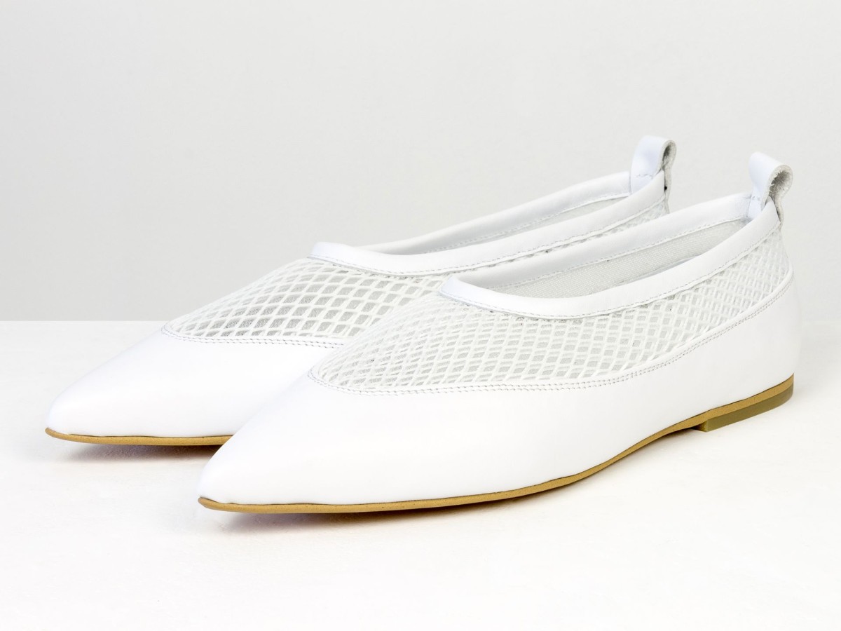 Идеальные балетки для теплой погоды. Модель выполнена из натуральной кожи в сочетании с дышащей сеткой, что обеспечивает максимальный комфорт даже в жаркие дни. Легкая конструкция и мягкая посадка делают эту пару практически невесомой на ноге. Белый цвет придает свежесть образу и легко сочетается с летним гардеробом — от платьев до джинсов. Удобный вариант для повседневной носки, путешествий или активного дня.