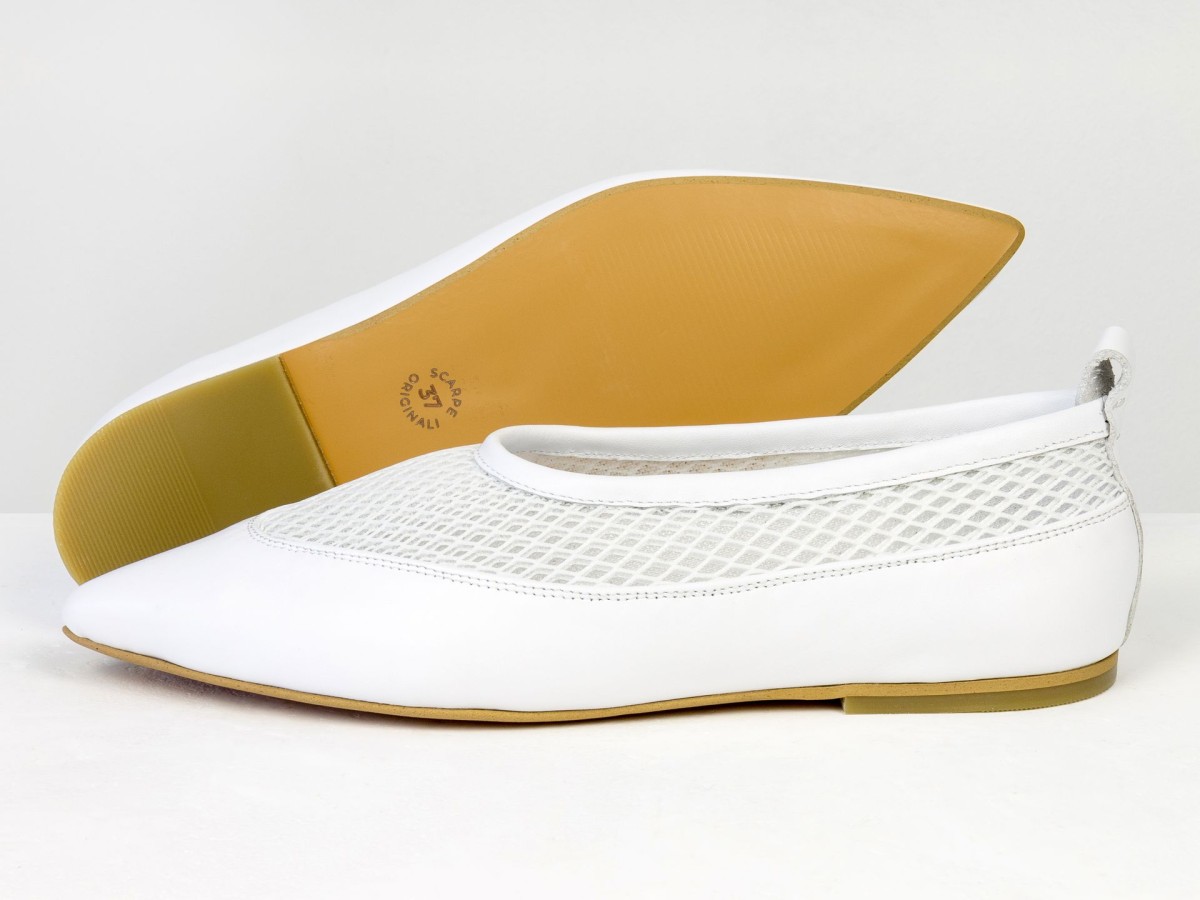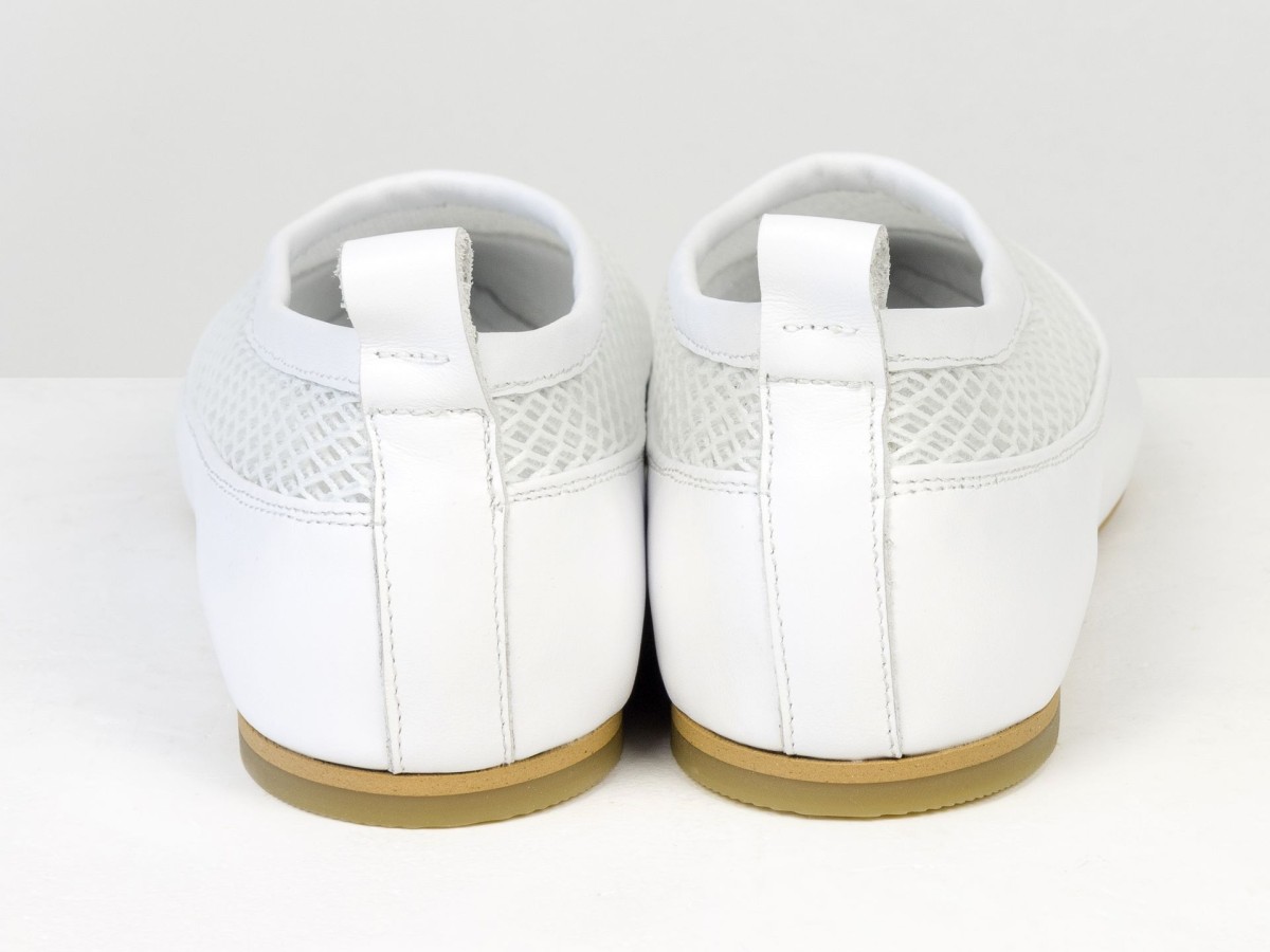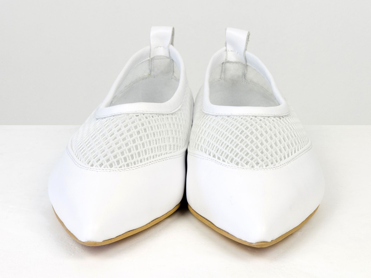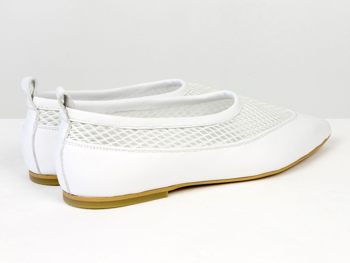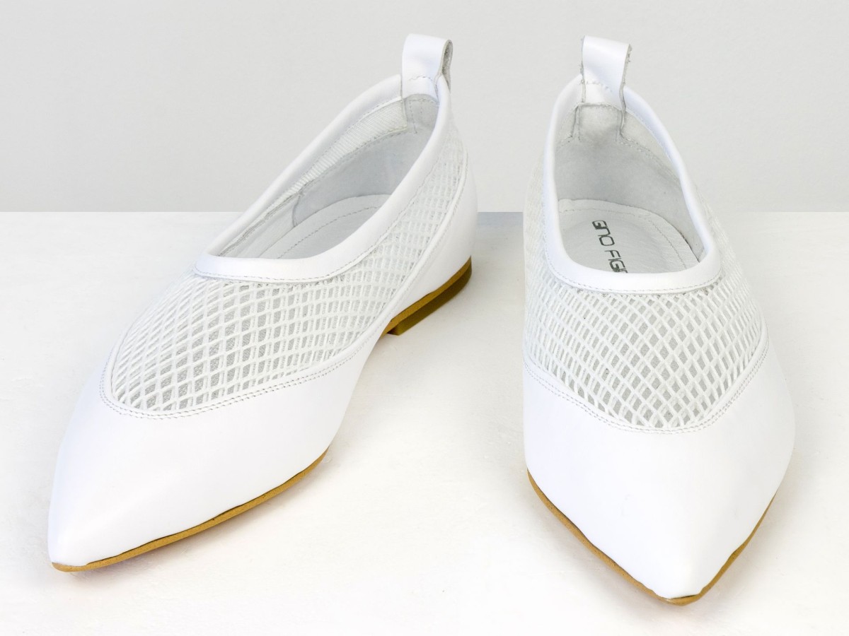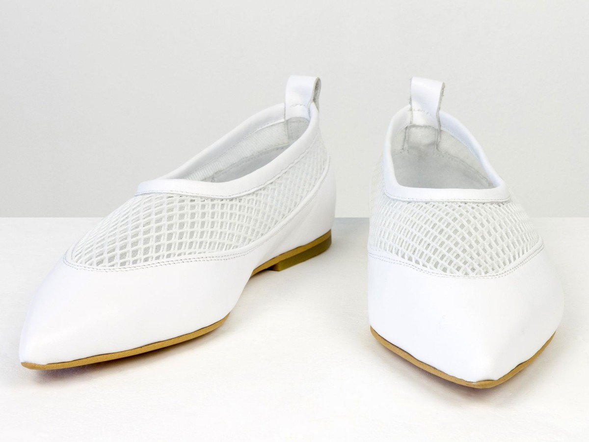 Идеальные балетки для теплой погоды. Модель выполнена из натуральной кожи в сочетании с дышащей сеткой, что обеспечивает максимальный комфорт даже в жаркие дни. Легкая конструкция и мягкая посадка делают эту пару практически невесомой на ноге. Белый цвет придает свежесть образу и легко сочетается с летним гардеробом — от платьев до джинсов. Удобный вариант для повседневной носки, путешествий или активного дня.