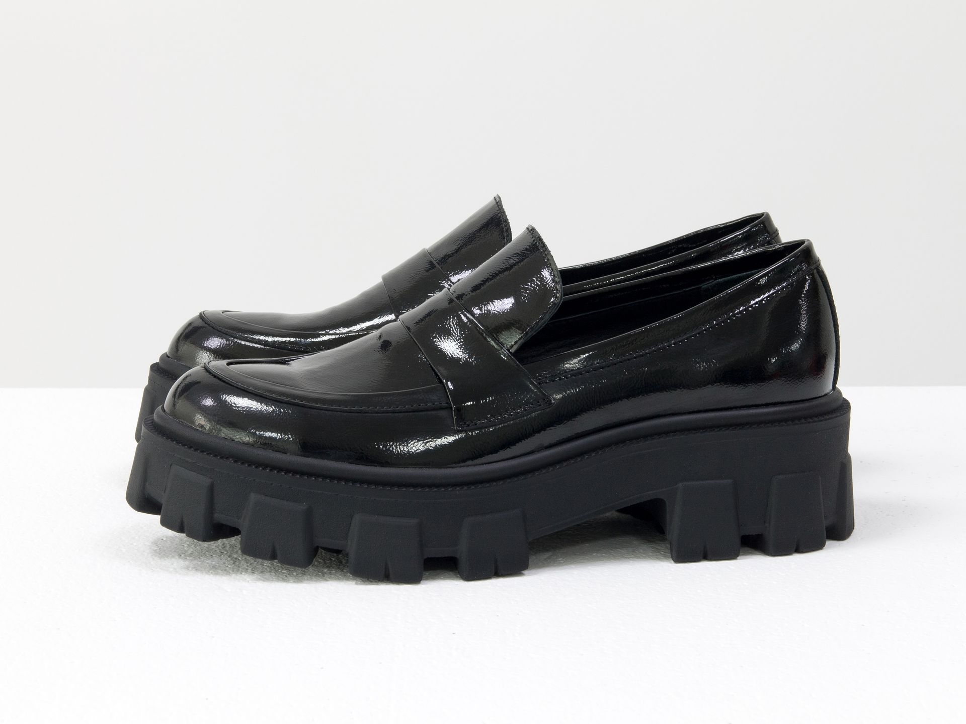 Женские туфли на тракторной подошве из натуральной лаковой кожи черного цвета Gino Figini