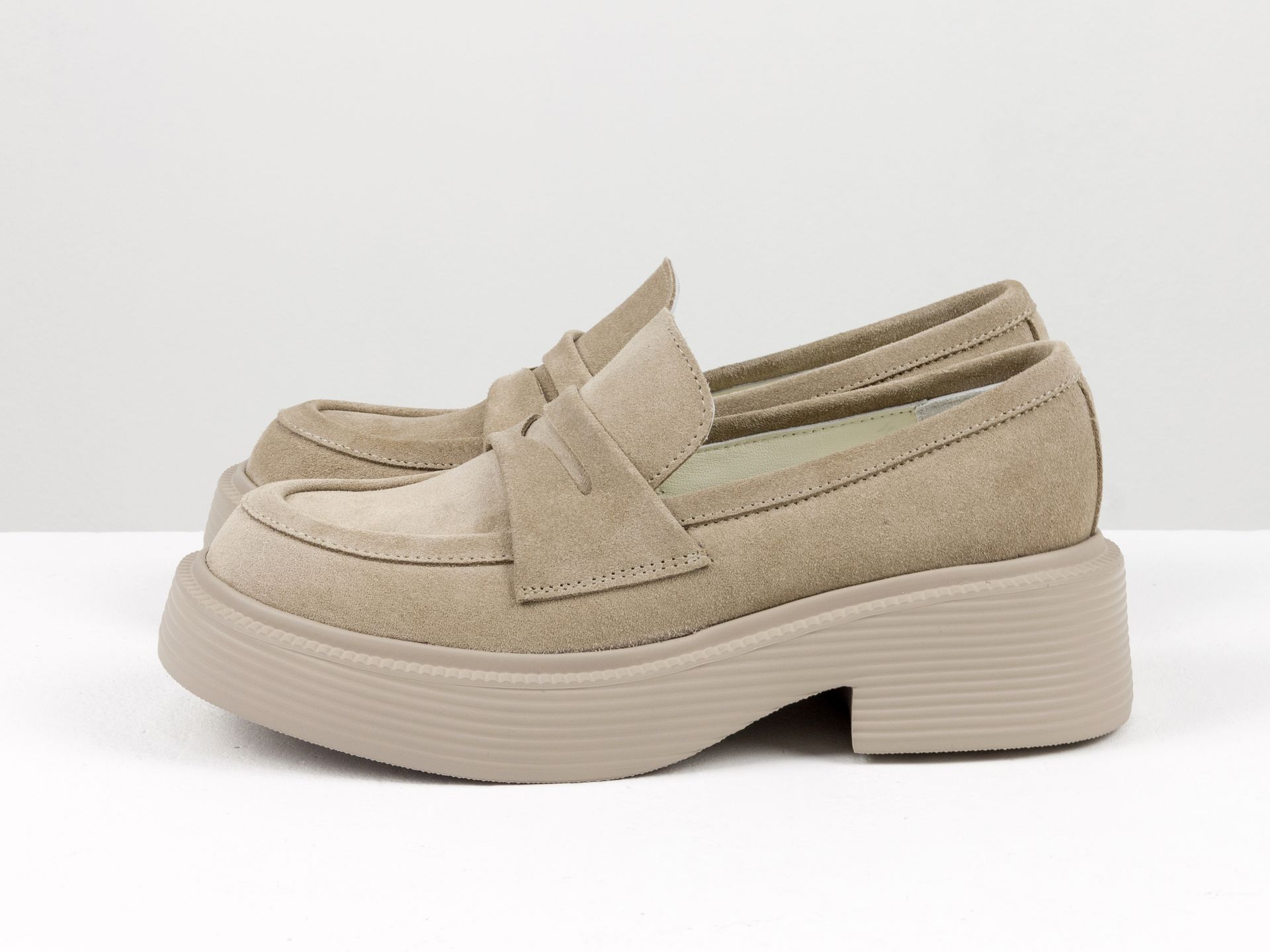 Женские туфли-лоферы из натуральной замши бежевого цвета на утолщенной подошве Gino Figini