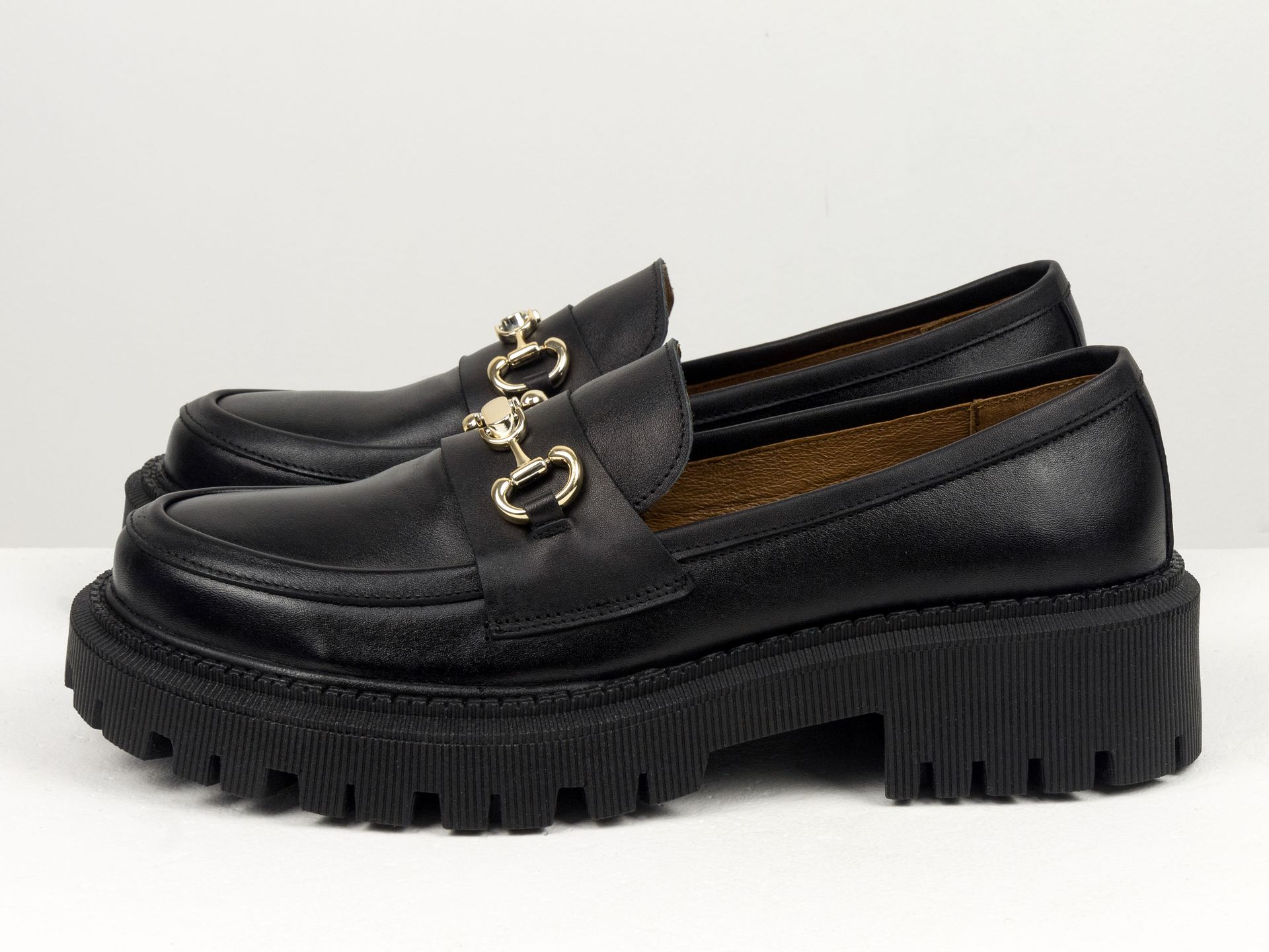 Женские туфли-лоферы из натуральной кожи черного цвета на тракторной подошве с золотой фурнитурой Gino Figini