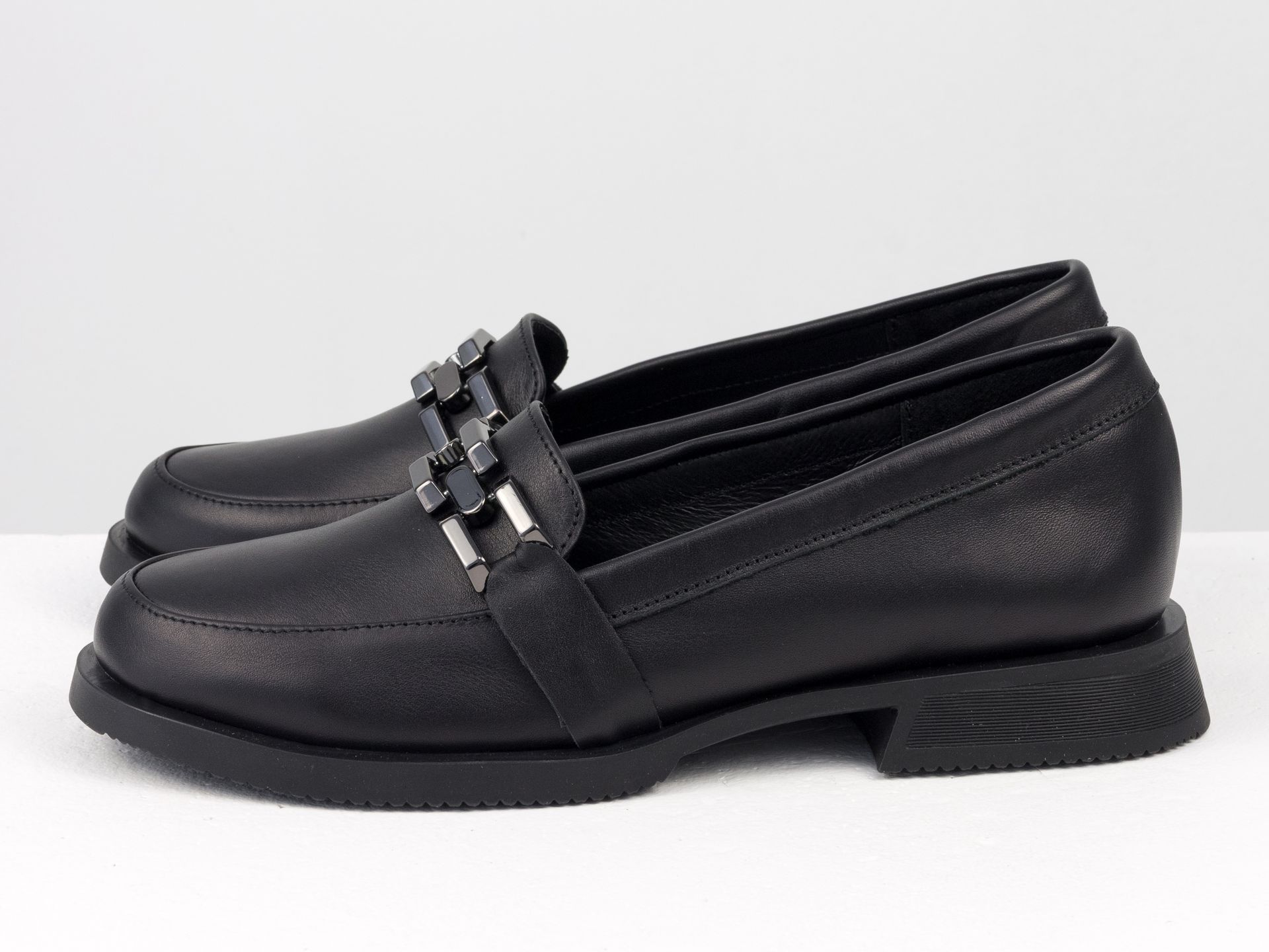 Женские туфли-лоферы из натуральной кожи черного цвета на облегченной подошве с серебряной фурнитурой Gino Figini