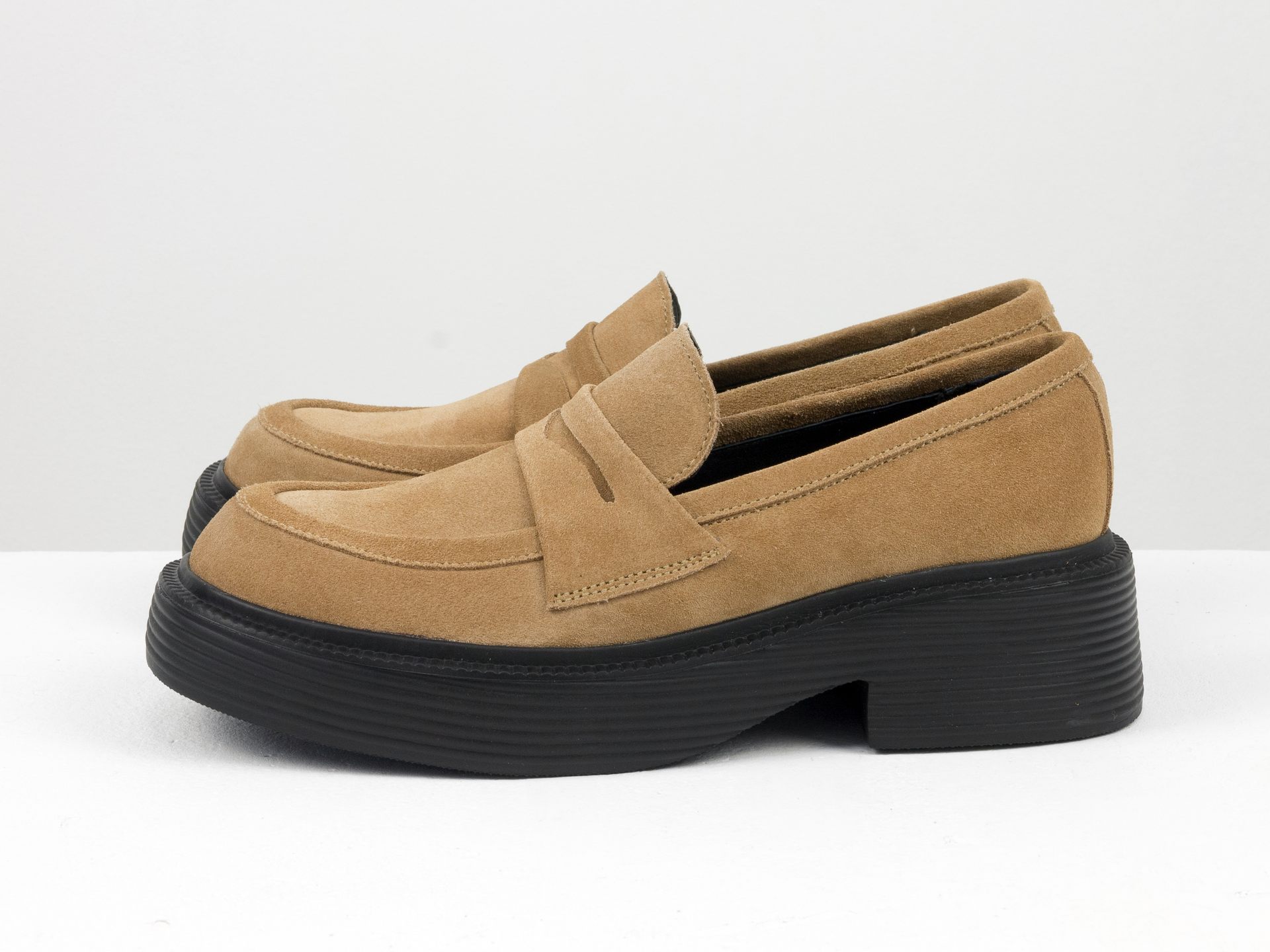 Женские туфли-лоферы из натуральной замши бежевого цвета на утолщенной черной подошве Gino Figini