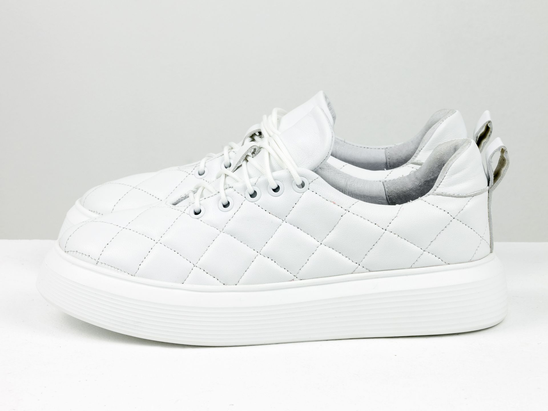 Женские стеганые кеды из натуральной кожи белого цвета на облегченной подошве Gino Figini