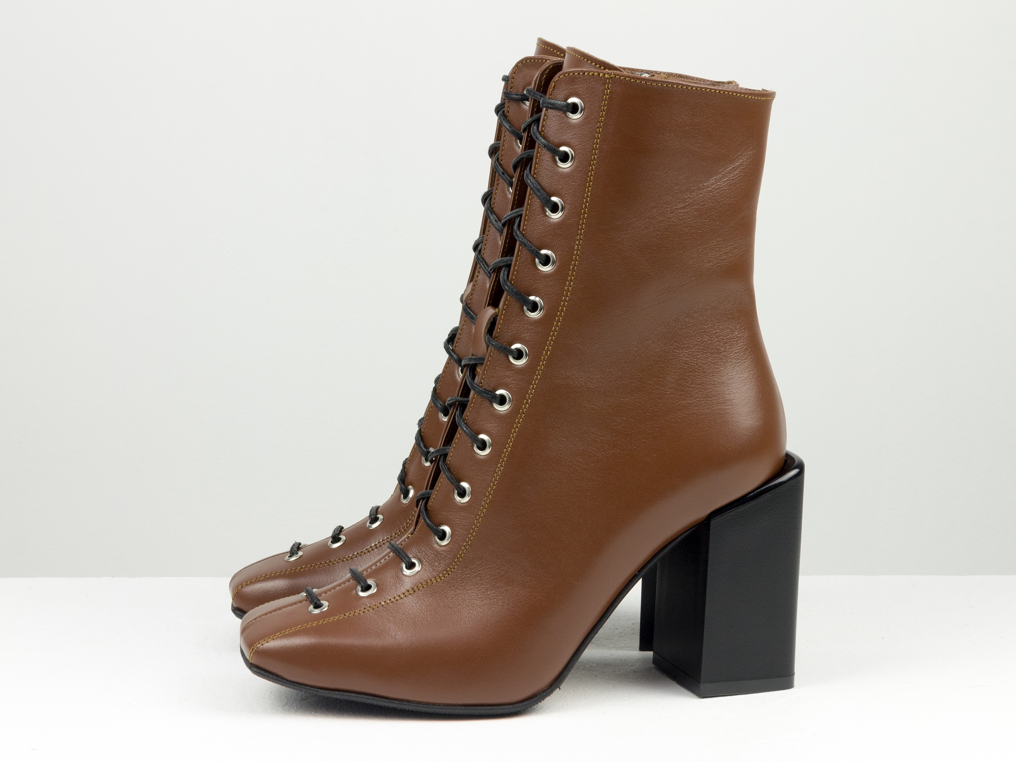 Дизайнерские базовые ботильоны на шнуровке из натуральной кожи коричнево-рыжего цвета на высоком квадратном каблуке Gino Figini