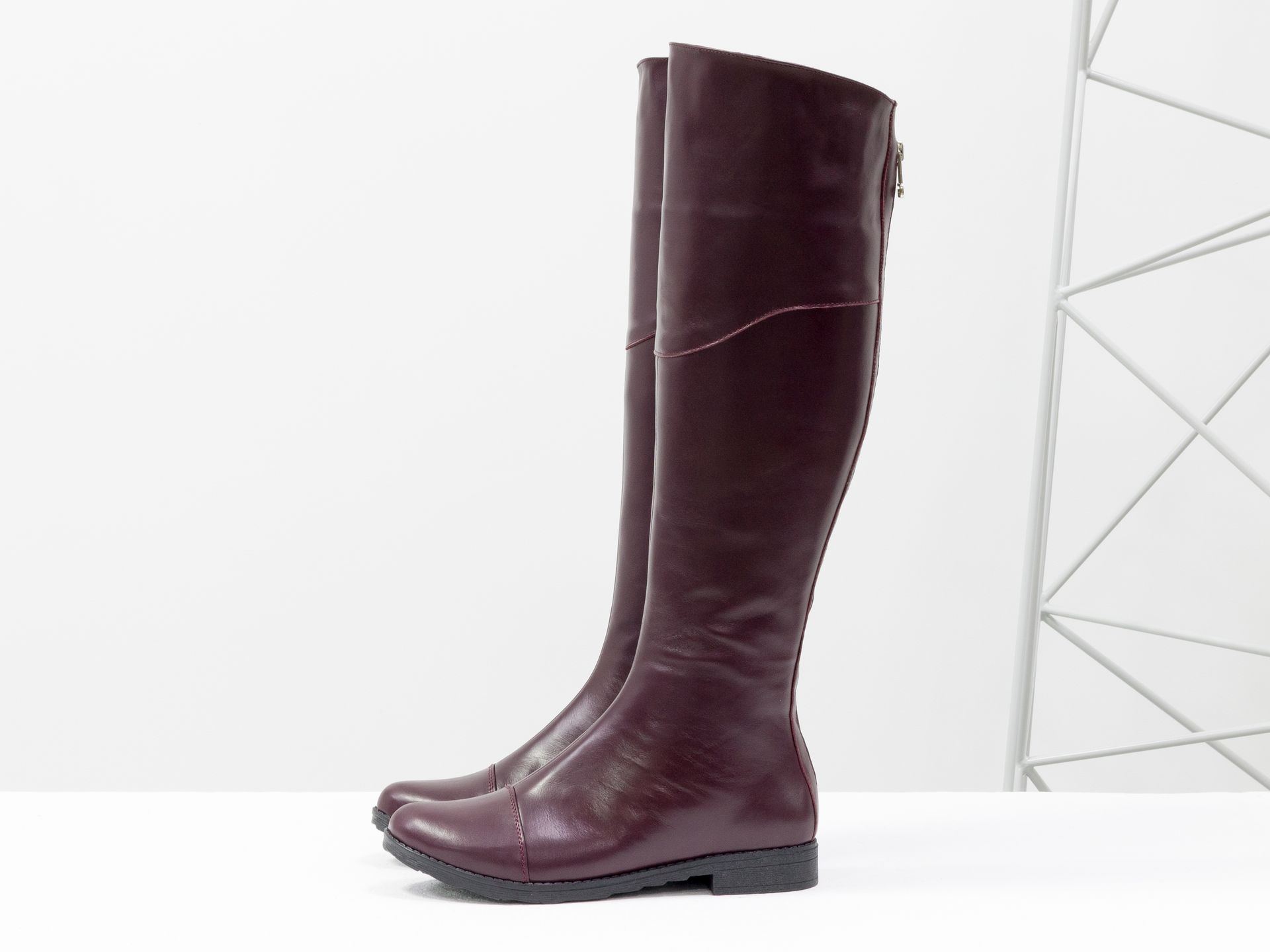 Сапоги-ботфорты из натуральной гладкой кожи бордового цвета, на классической подошве с маленьким каблуком Gino Figini